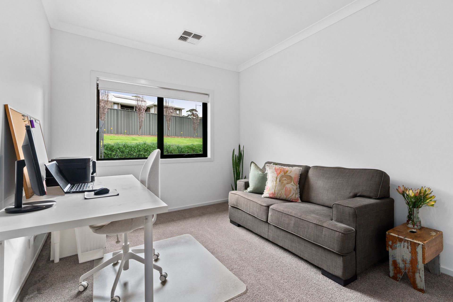 Off entry, the master suite with a drop of indulgent S-fold sheers, wall-to-wall walk-in robes, and a luxe dual-basined ensuite, lies opposite the formal lounge, office, or dedicated parent's retreat.