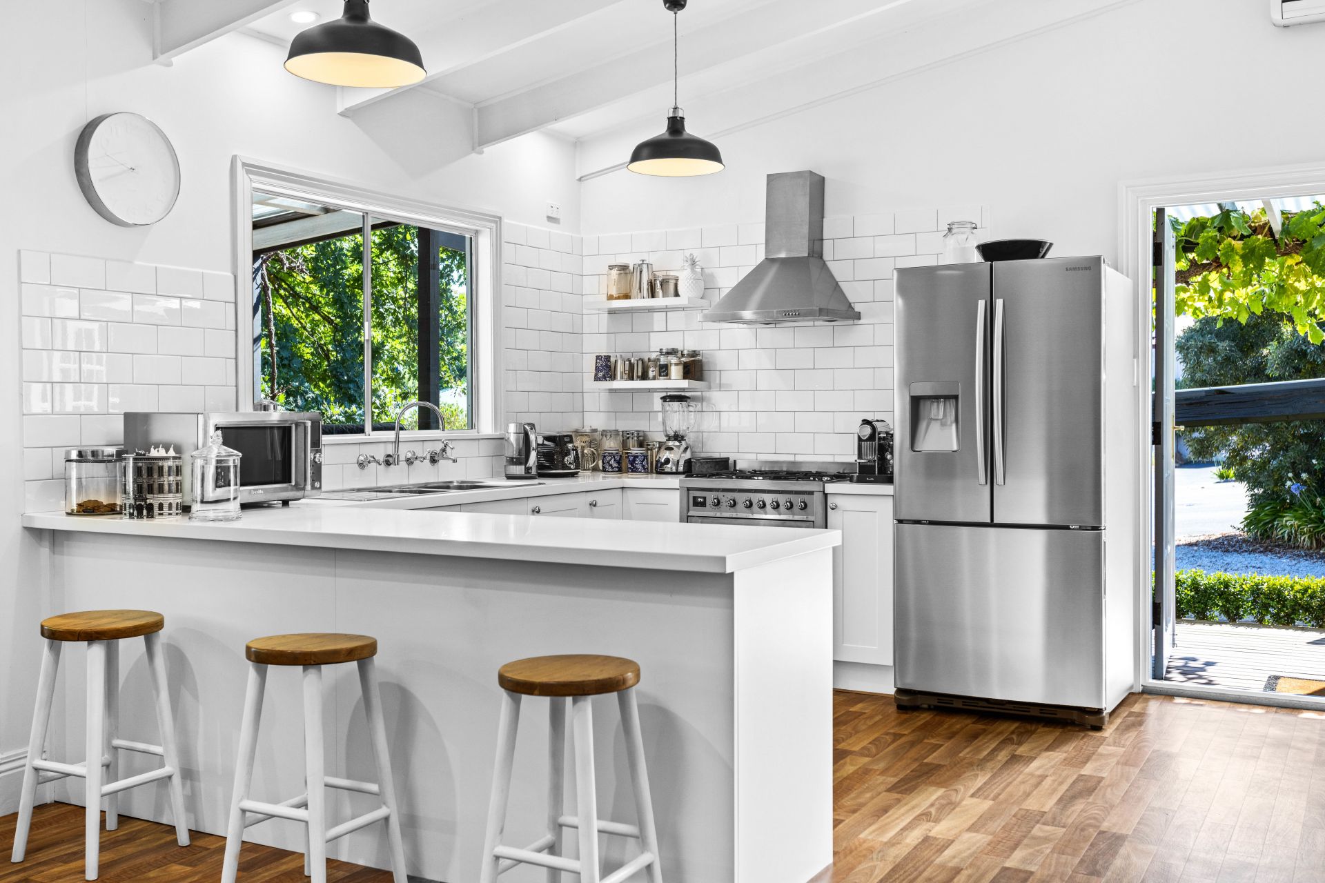 Shaker-style joinery, a stainless gas cooktop, electric oven, 40mm stone benchtops, and sleek subway tiling beneath suspended industrial lamps; it's everything this new-look cottage deserves.