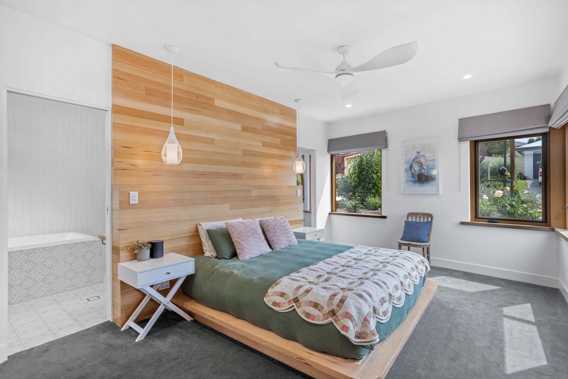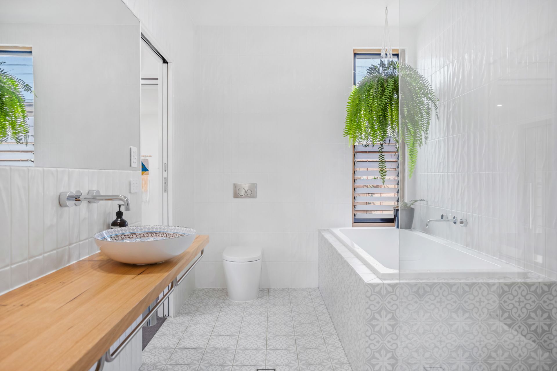 The home leads with Blackbutt timber floors and an escape to parental seclusion - a wing granting walk-in robe and ensuite luxe with a bath soak, louvred panes, rippling matchstick tiles, and barely there floating joinery.