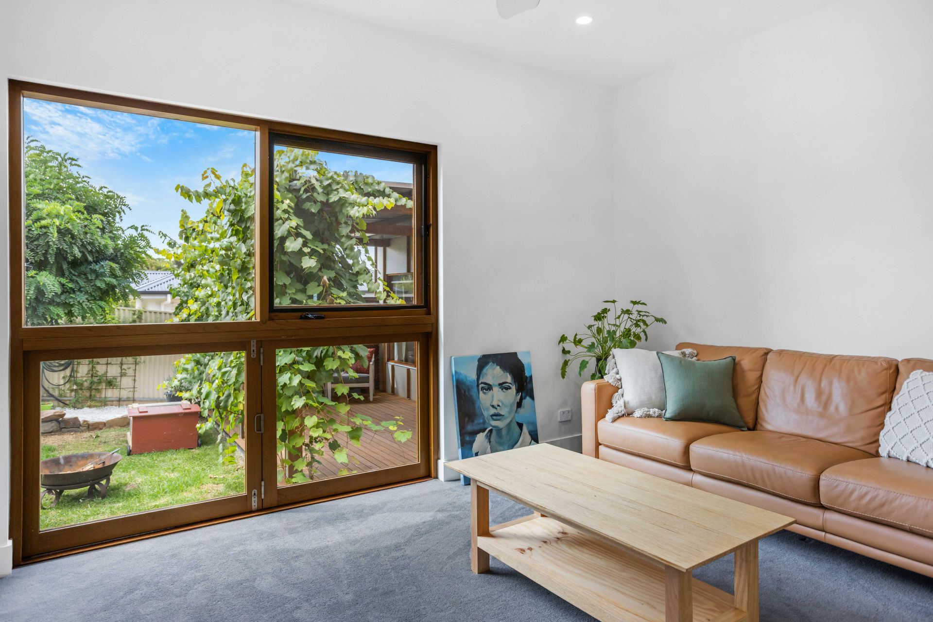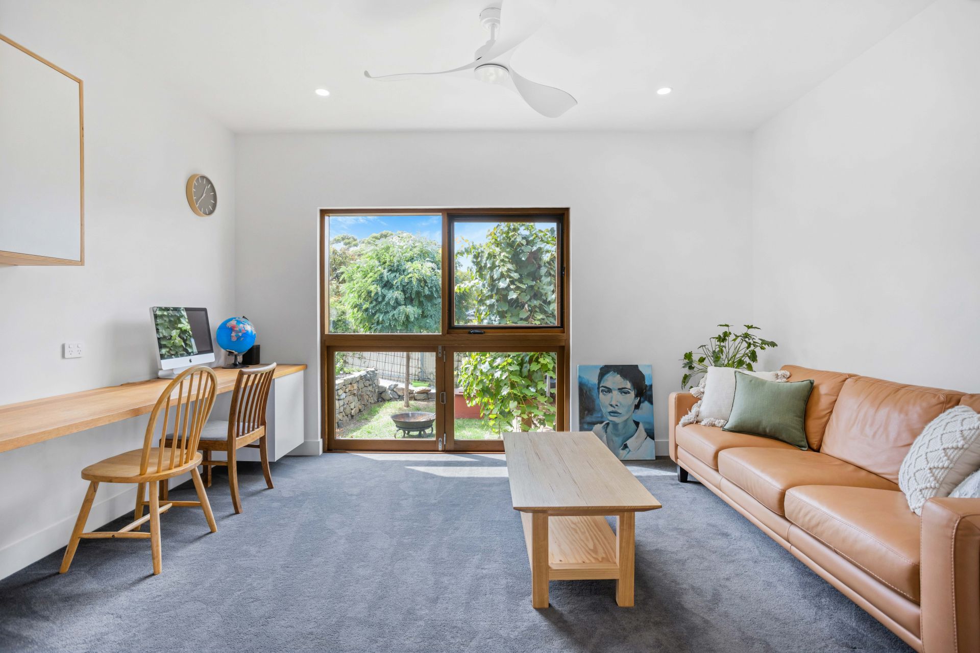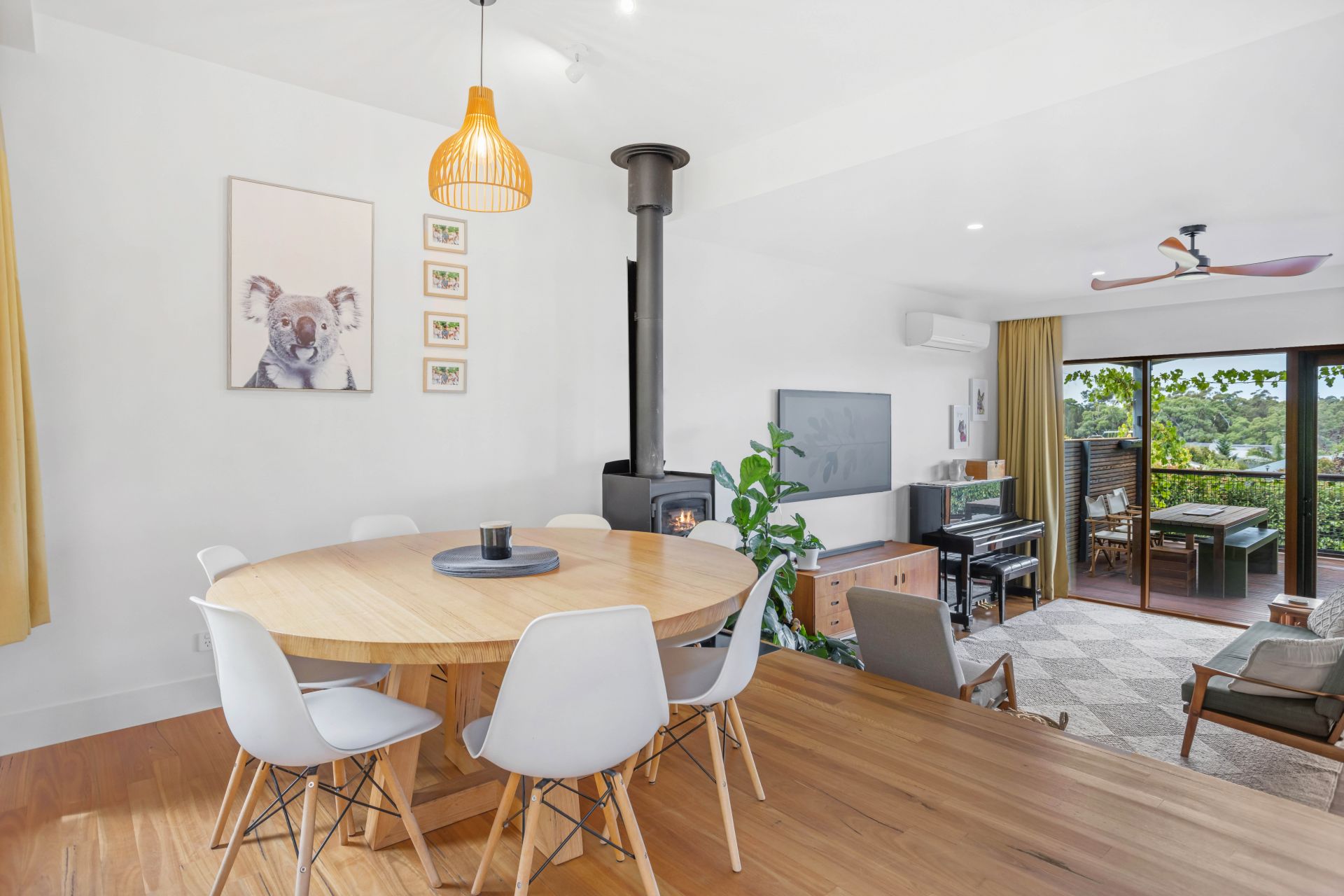 Beyond the lounge/office and 3rd bedroom is a seamless sweep of living and dining promising elevated front to back flow, graduating from the dining zone's vine-cloaked deck to the rear living zone's French doors for an 11m deck that hovers over the treetops and level landscaped backyard.