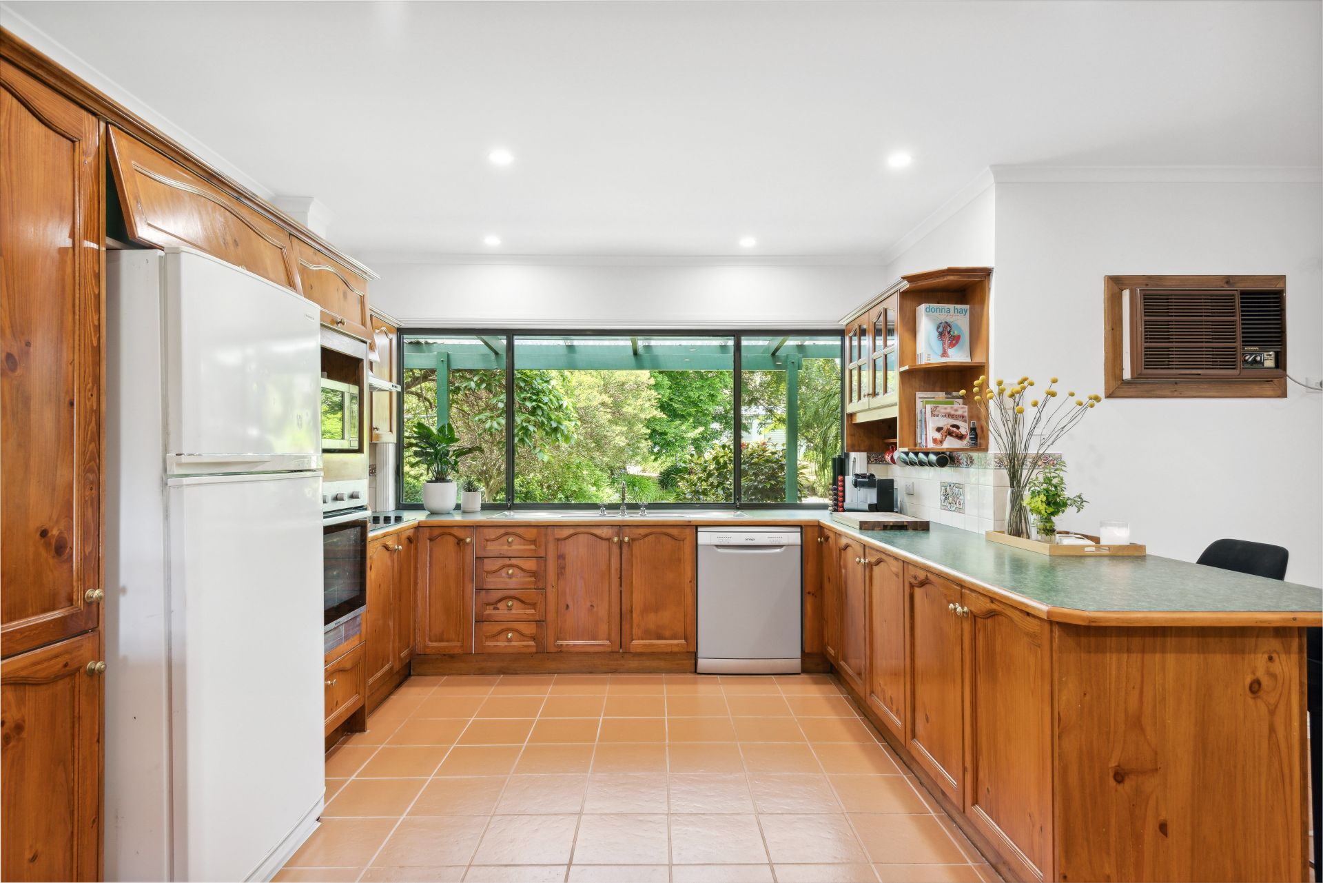 Sitting centre stage is the hub of the home; a kitchen with timber cabinetry, dishwasher, and gardens views, ready to take on the largest of families as it manages entertaining the tribe in the expansive open plan living area.