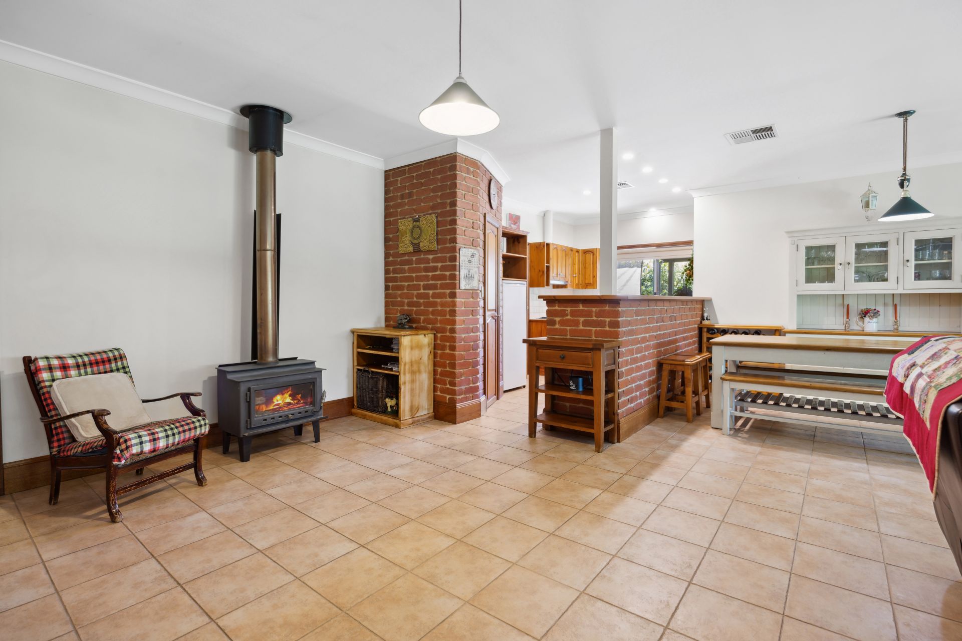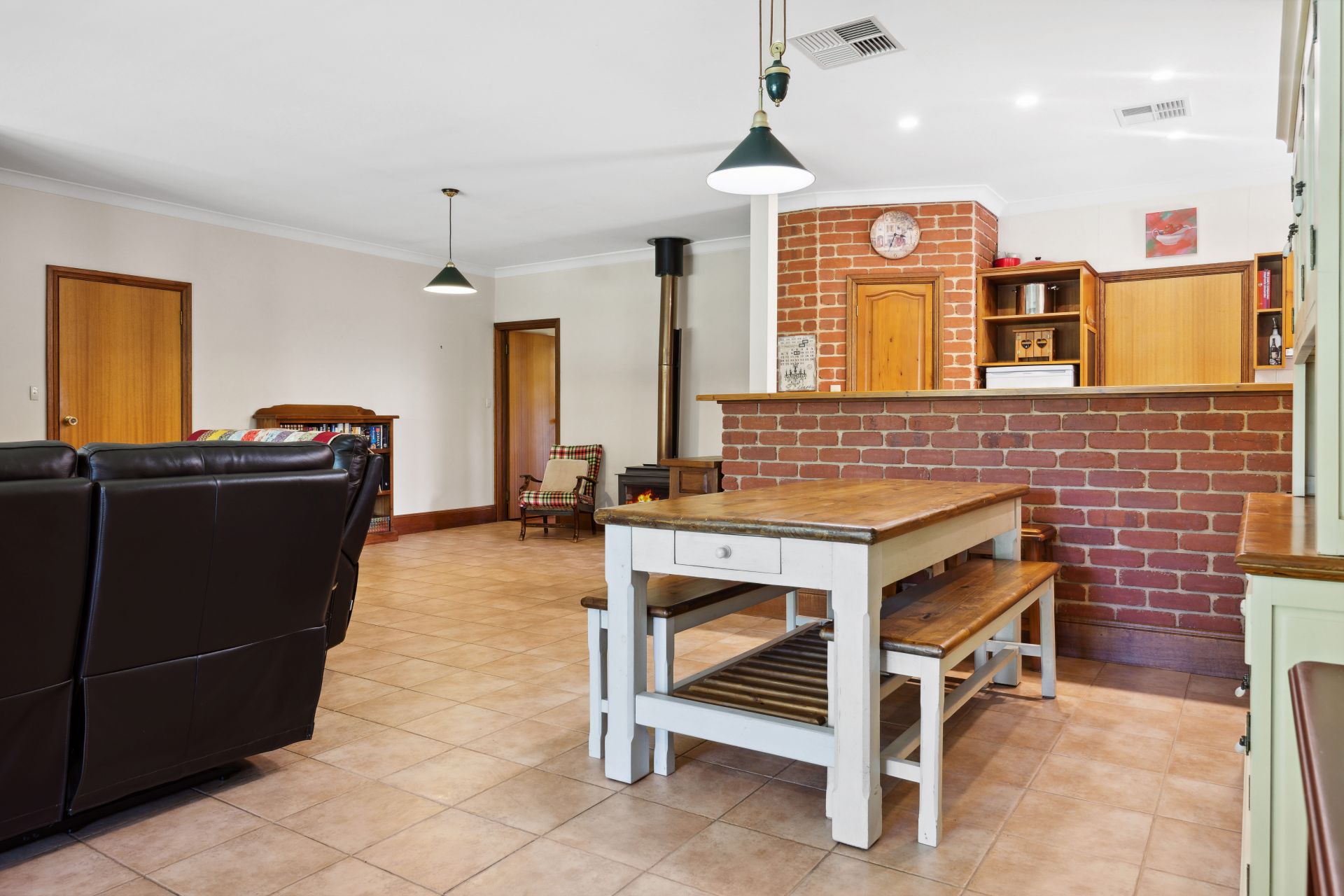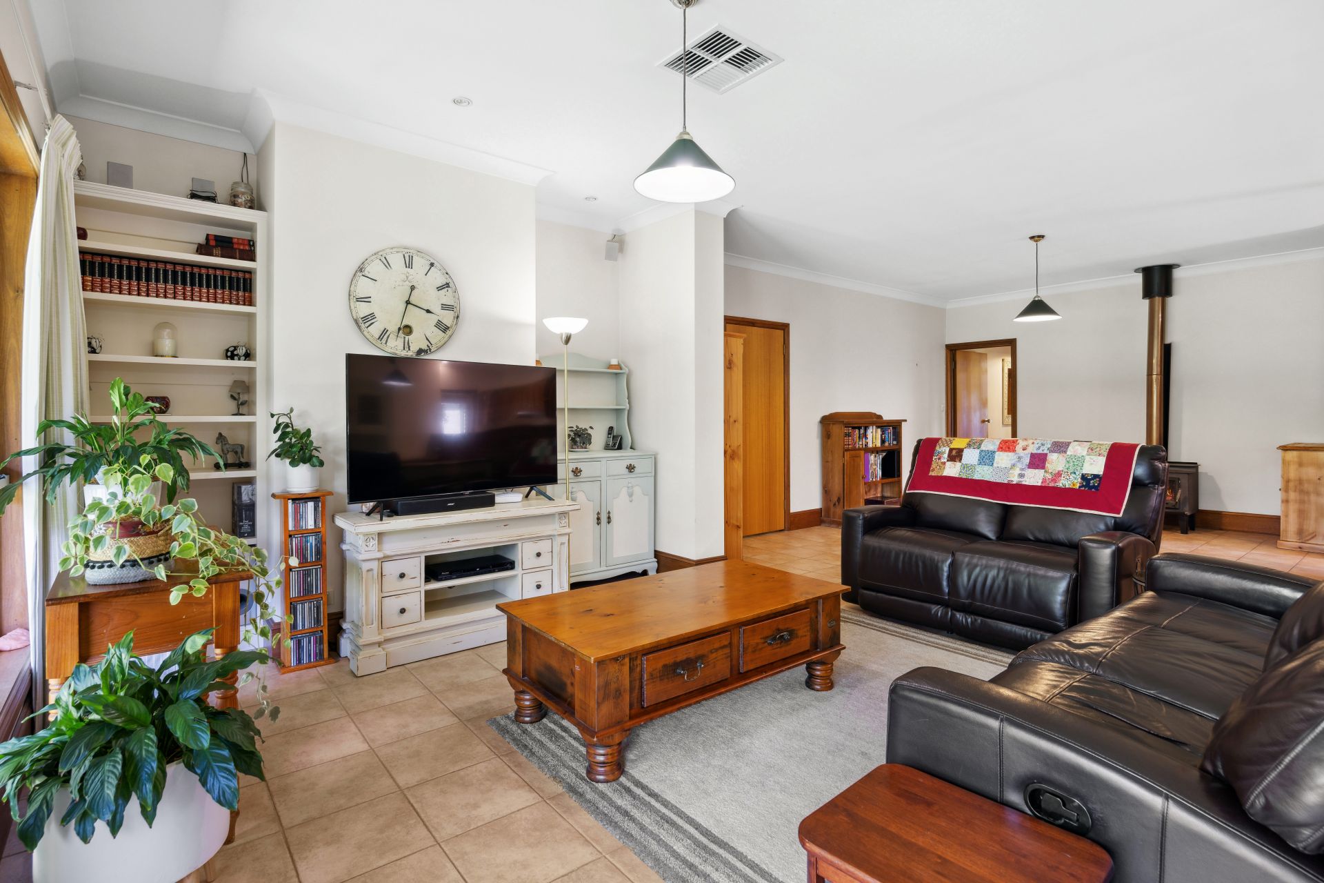 Opposite, the carpeted lounge extends its span for formal dining or home office space; as the adjoining kitchen breezes through the home's heart – past a Miele dishwasher, gas cooktop, Bosch pyrolytic steam oven, and spacious pantry - to the tiled open plan expanse cosied by a combustion fire, soaking in the enveloping garden views.