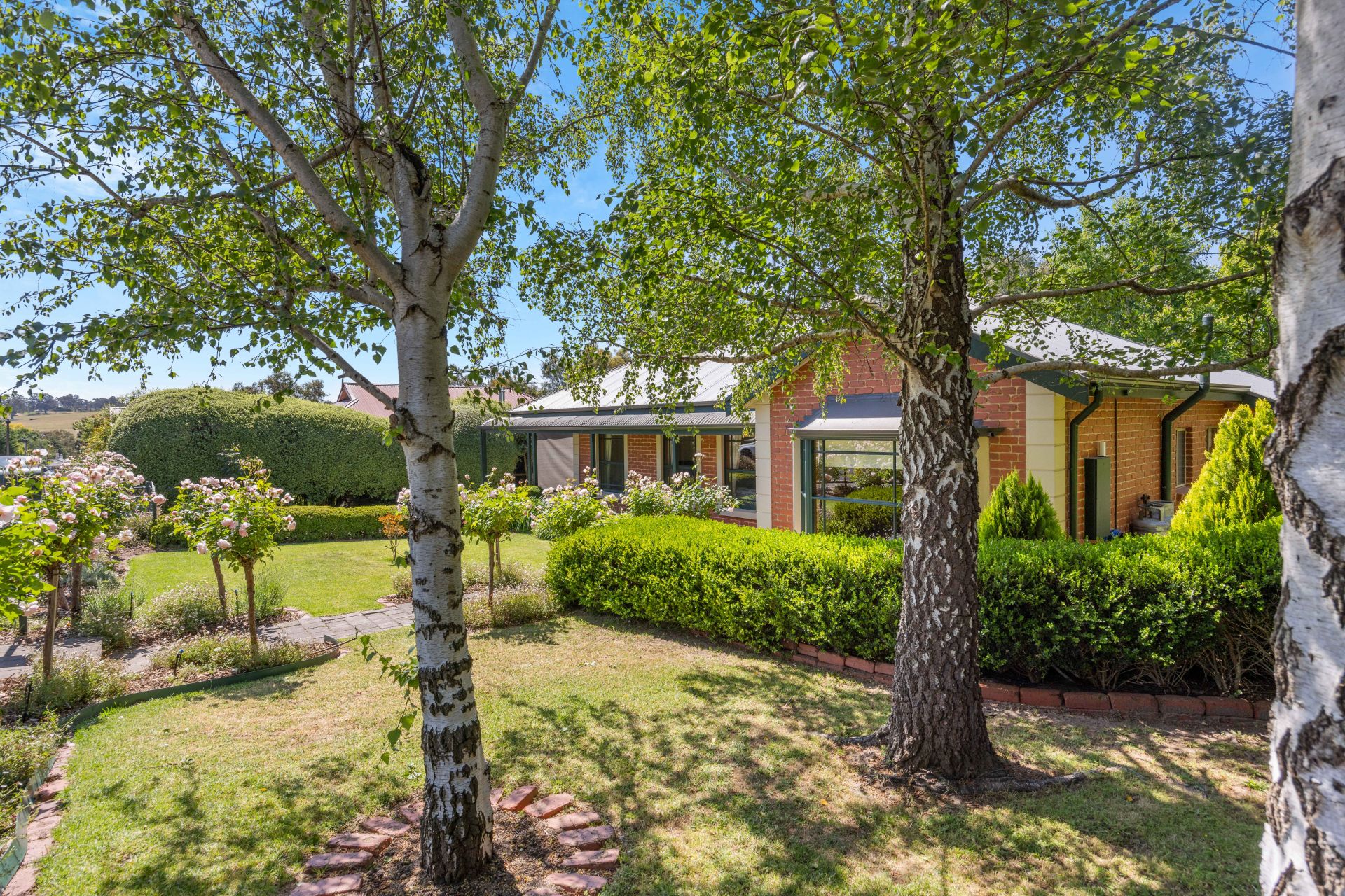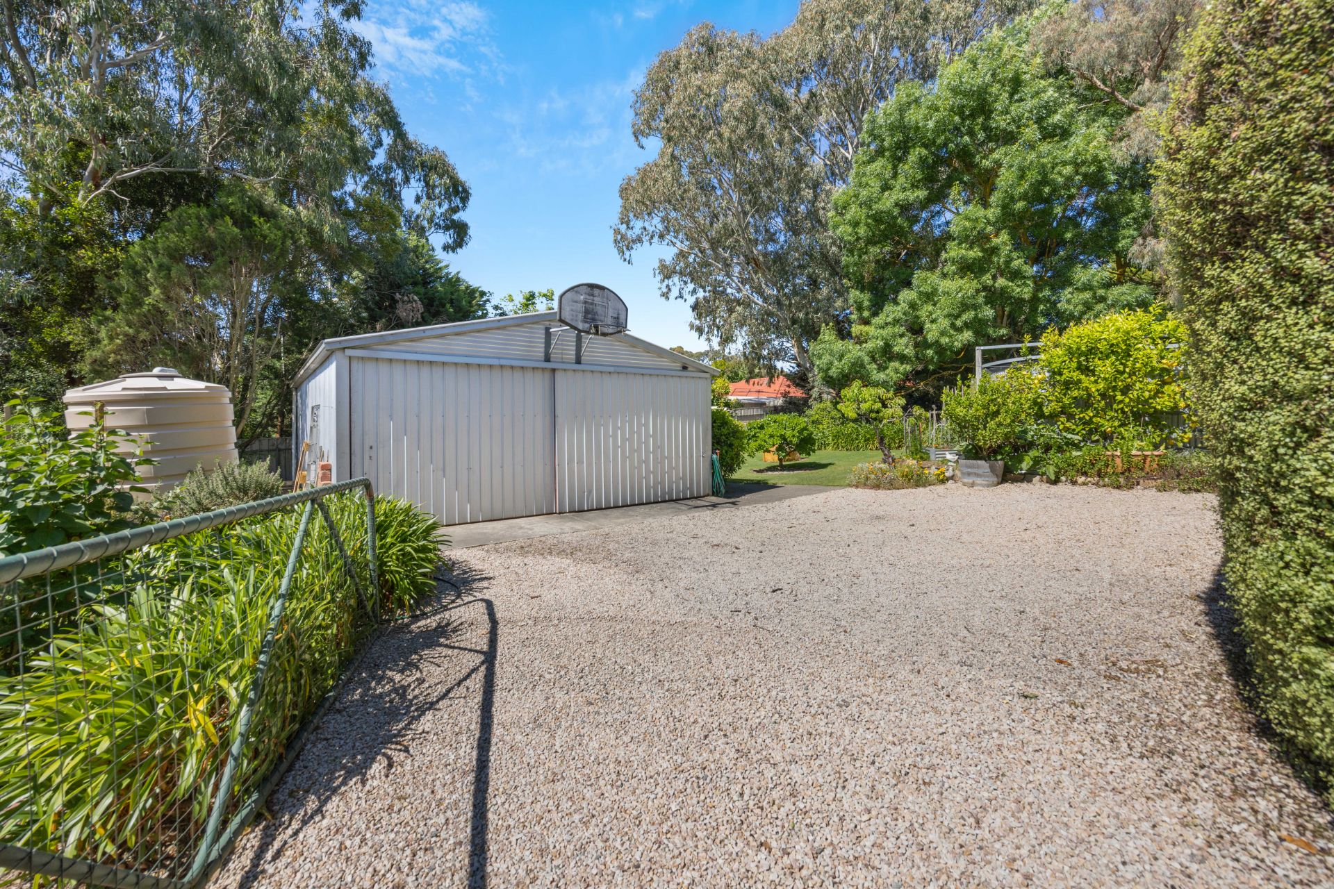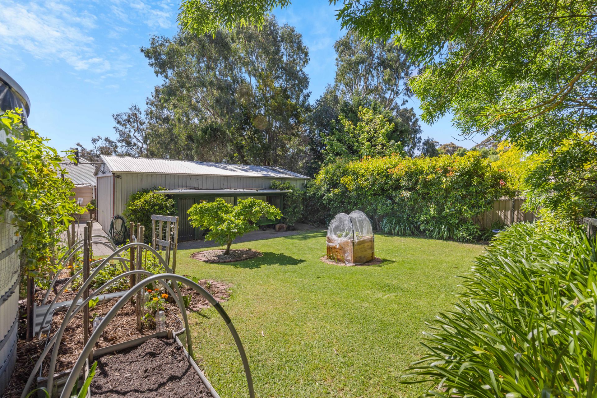 Not to mention the working section of the garden; beyond the pittosporum hedge reveals a rear harvest of vegies, citrus, passionfruit, nectarines, peaches, and Satsuma plums - all bound for the grazing platter to be enjoyed on the paved and walled alfresco; with the dappled shade of ornamental pears above a runway of lawn.