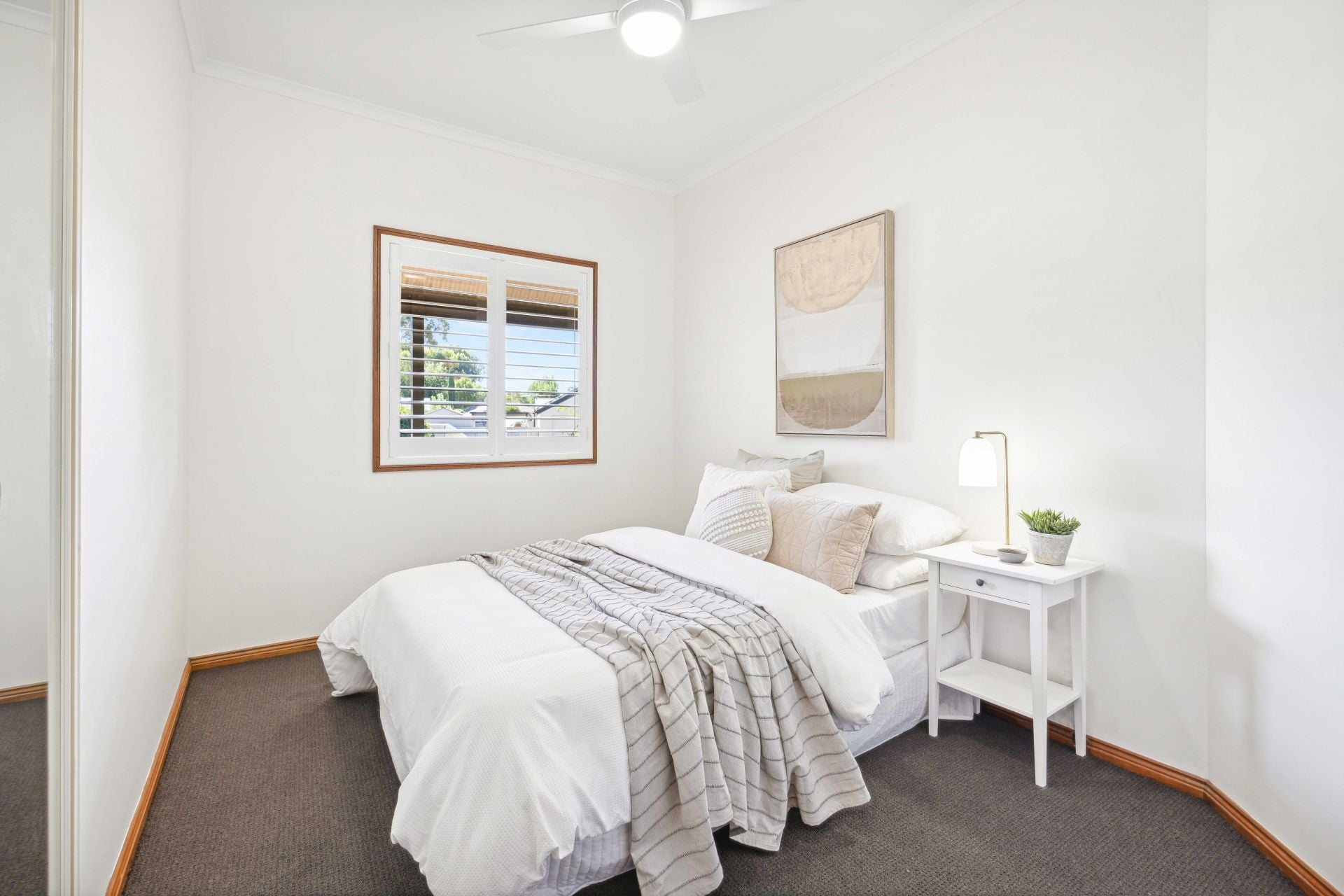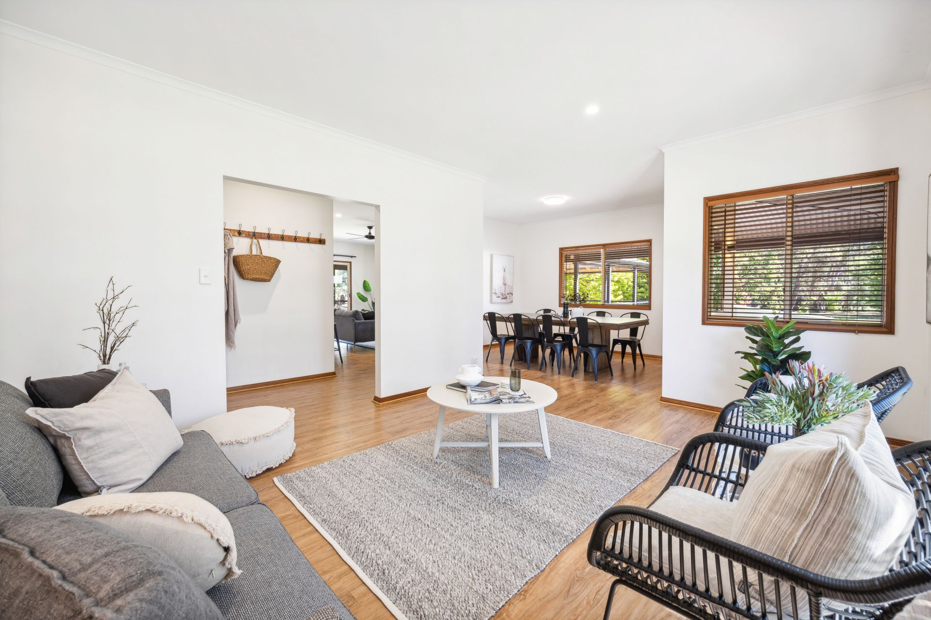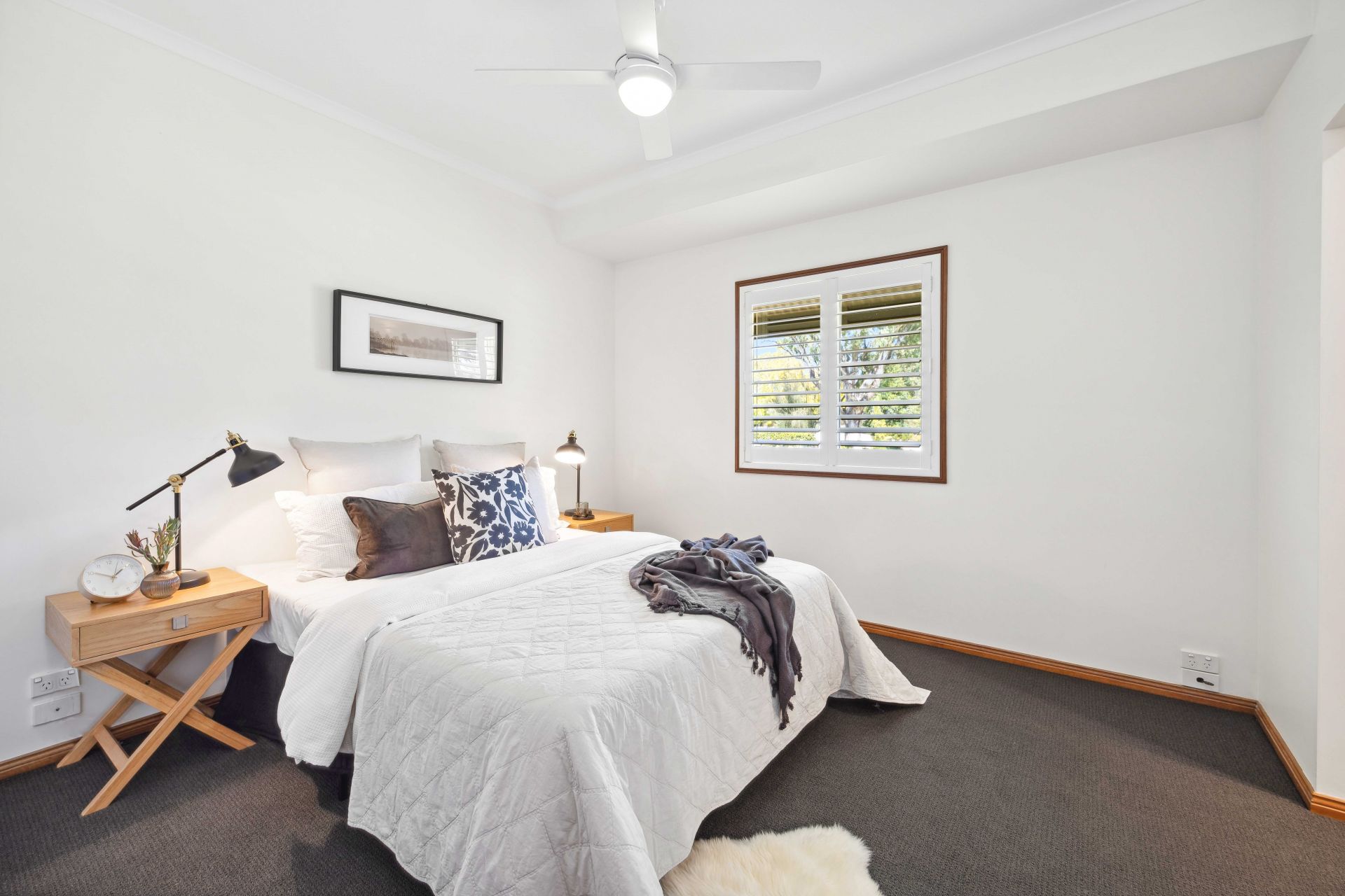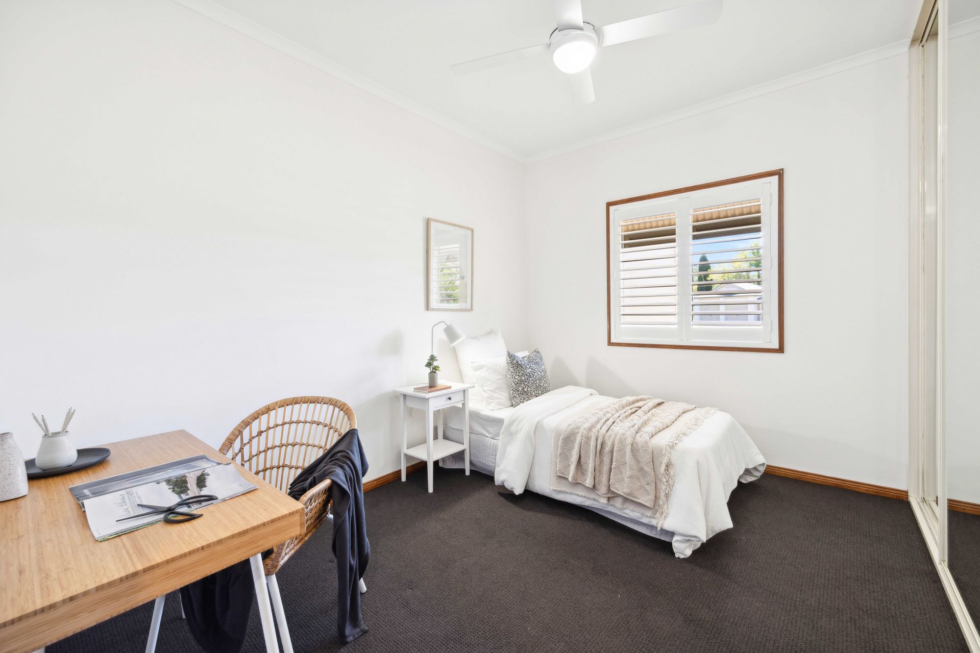 All four retreating bedrooms enjoy ceiling fans, built-in robes, and a soft plantation shuttered glow; the master drawn through a corridor of walk-in robes to a monochromatic ensuite; the 3-way family bathroom deserving another tick for chic monochromatic style continuity.