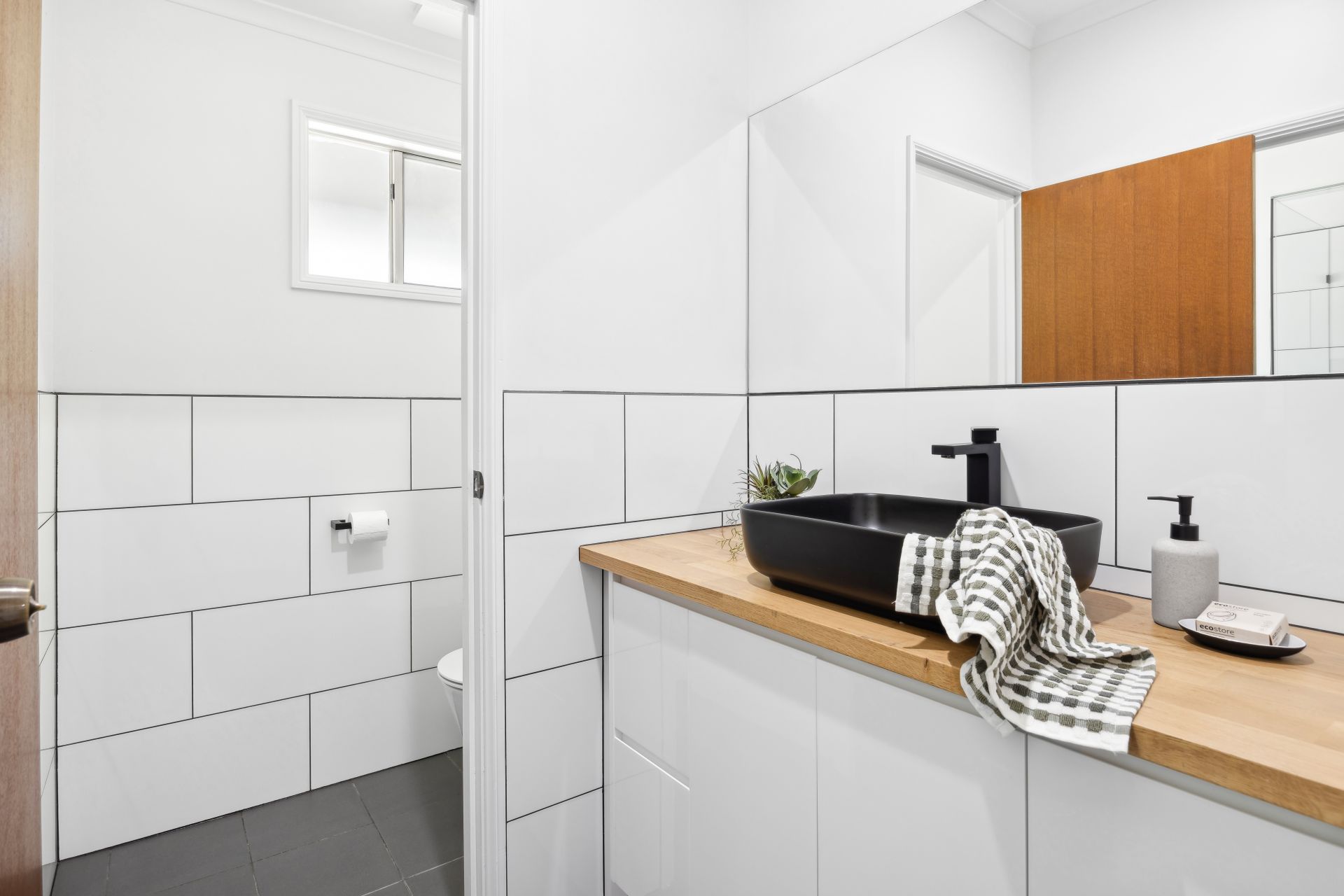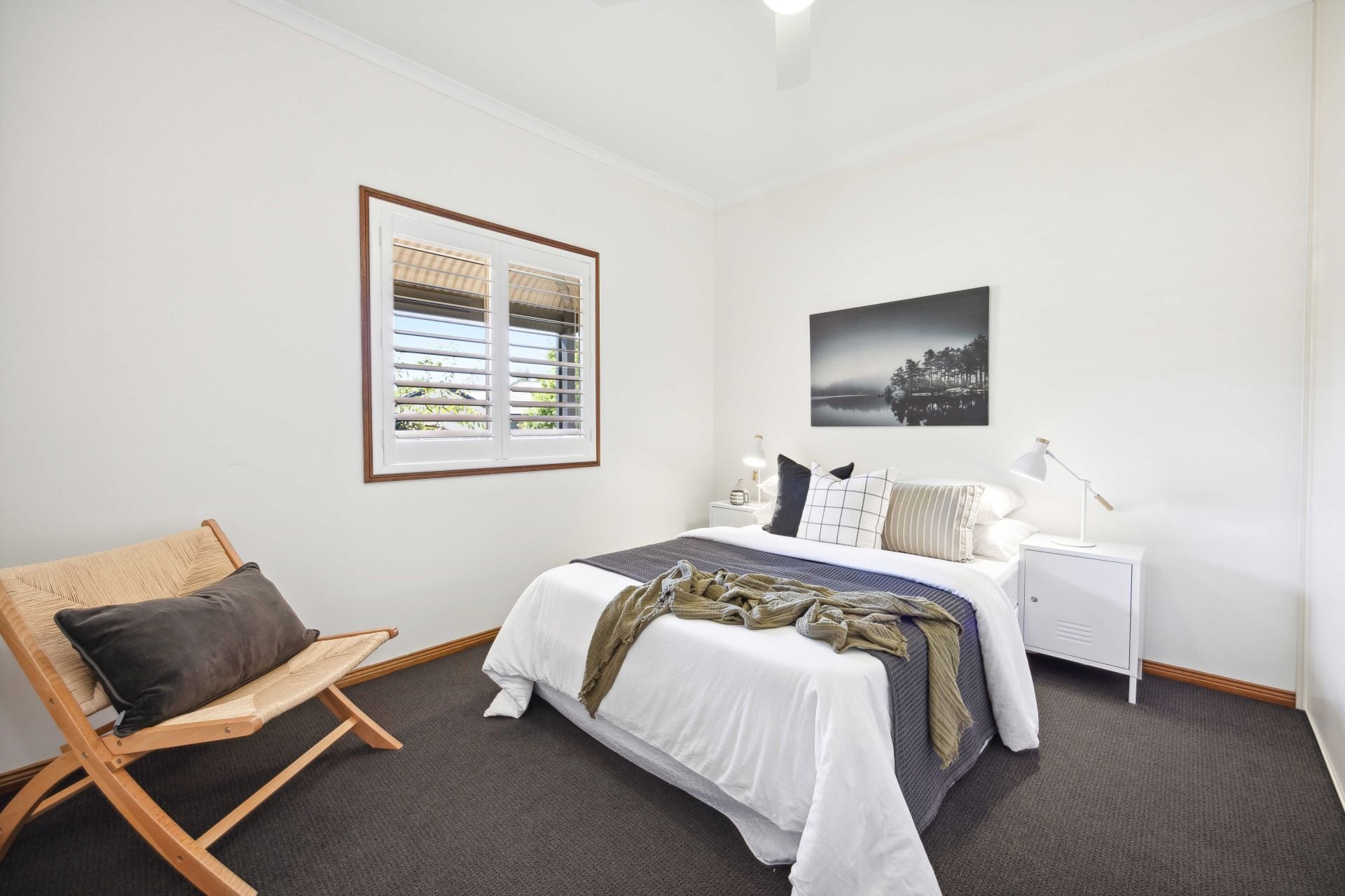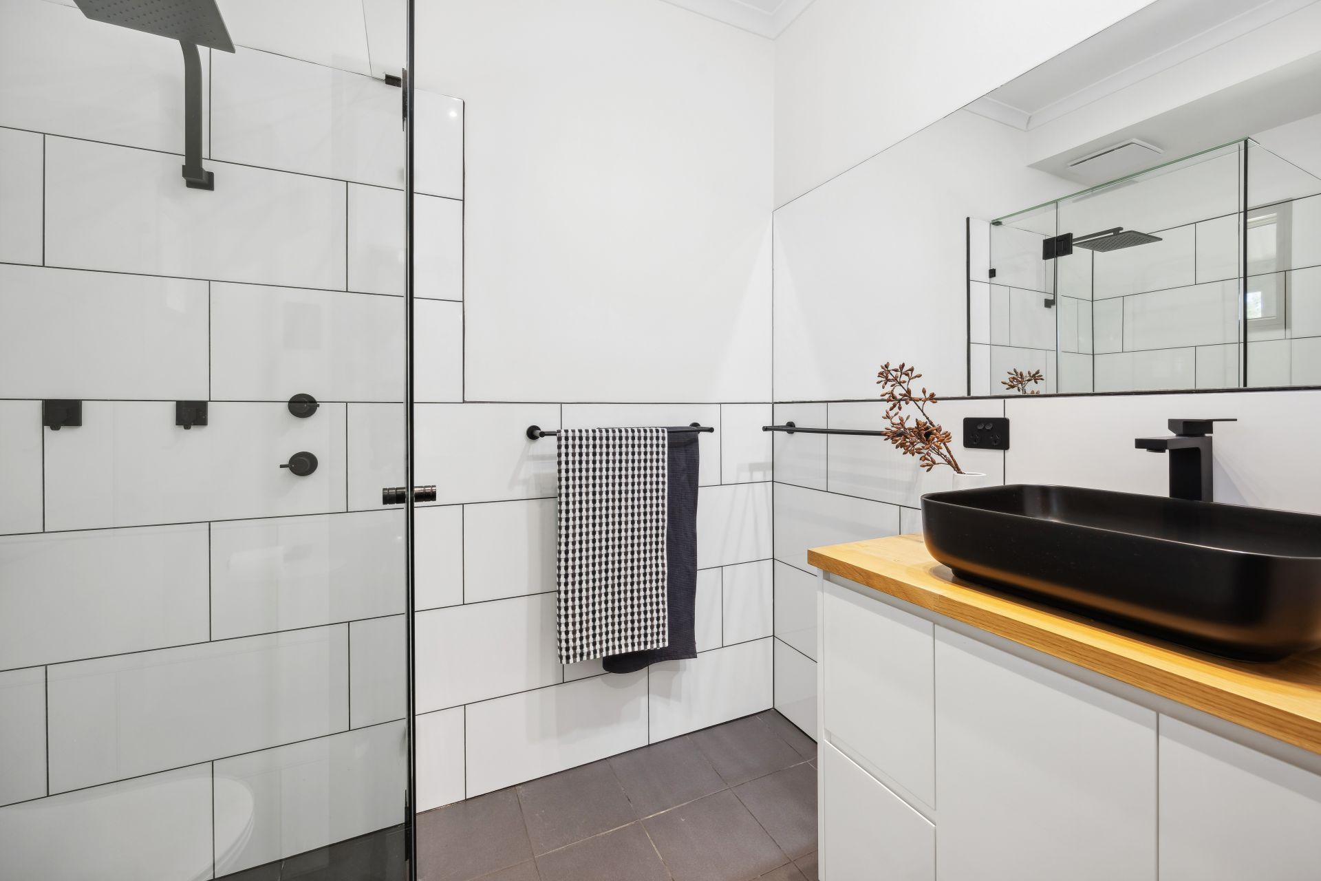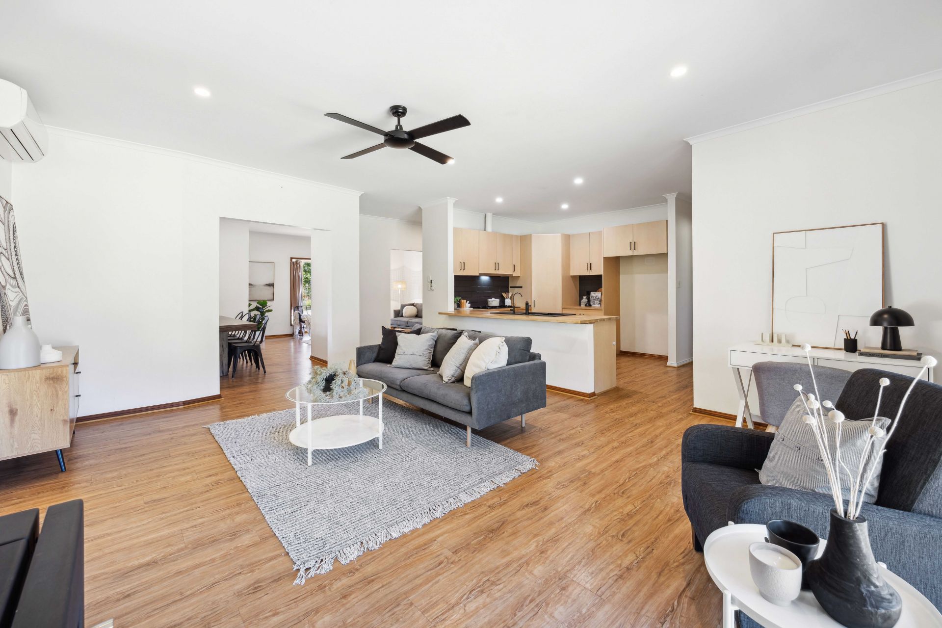 All four retreating bedrooms enjoy ceiling fans, built-in robes, and a soft plantation shuttered glow; the master drawn through a corridor of walk-in robes to a monochromatic ensuite; the 3-way family bathroom deserving another tick for chic monochromatic style continuity.