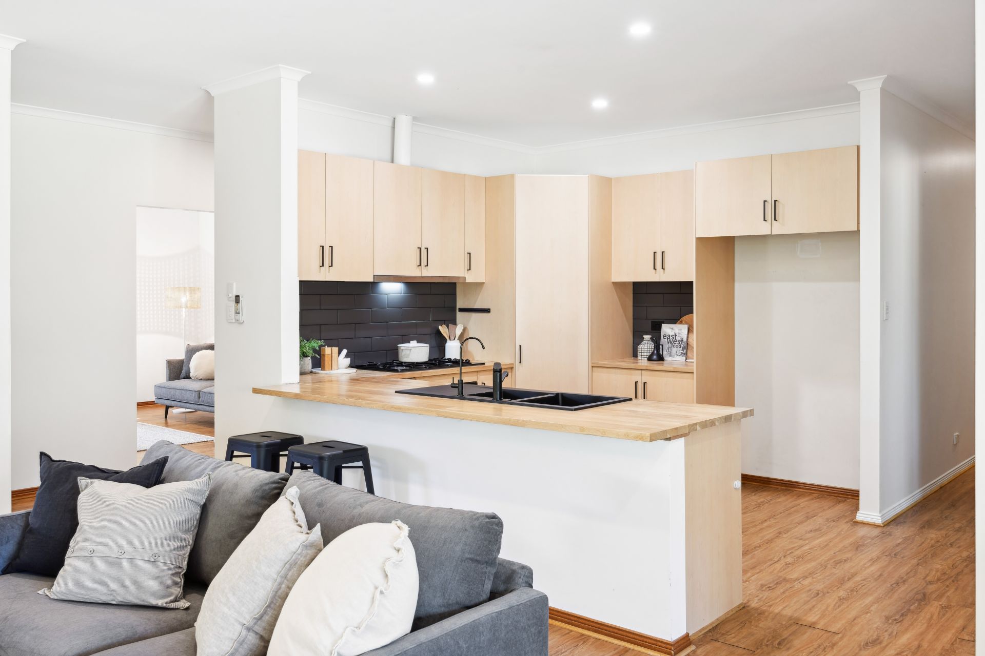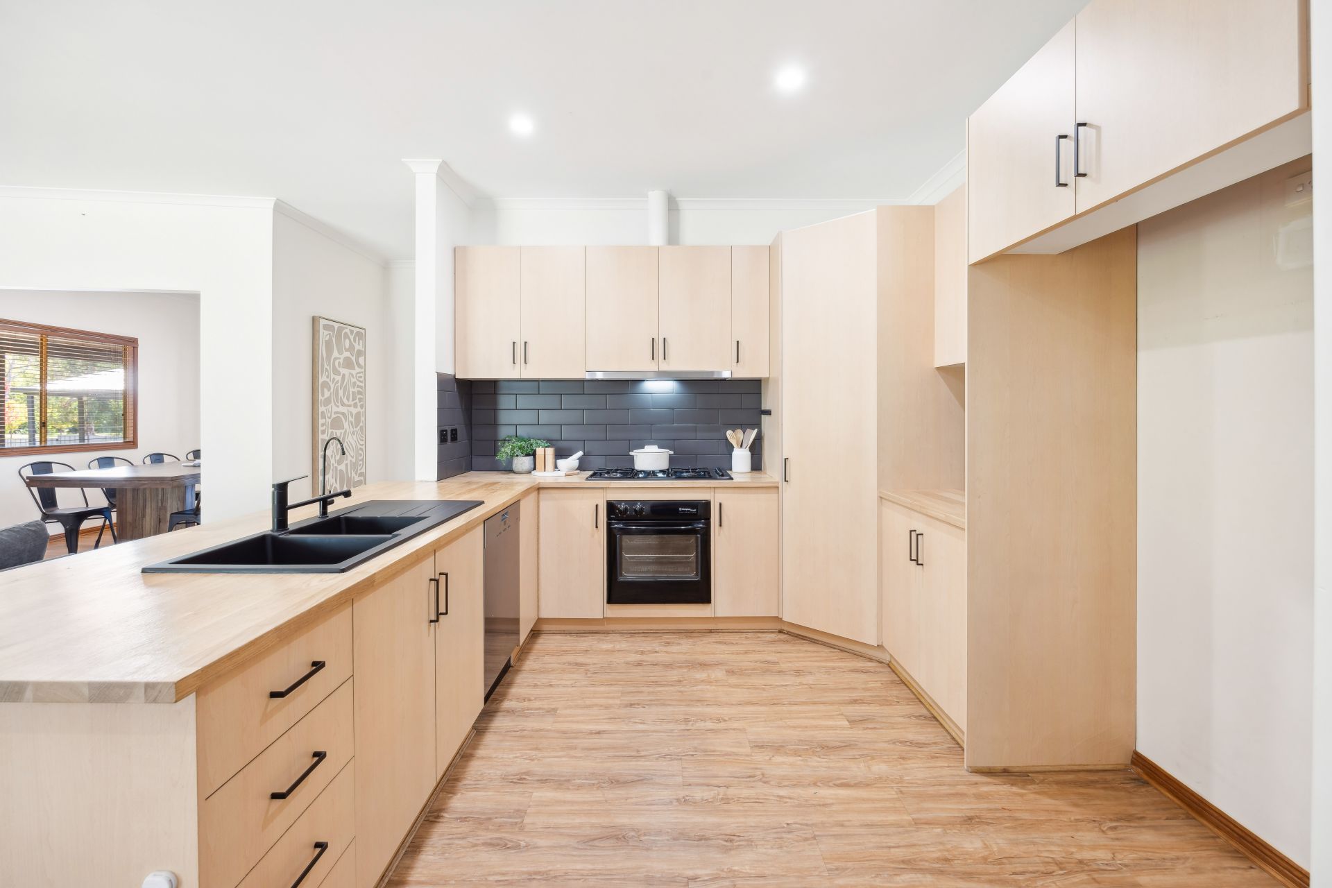 Prepping like a dream, the kitchen hosts a Miele dishwasher, 5-burner Westinghouse gas cooktop, electric oven, and underlines its newfound chic with upgraded benchtops, matte black sinks, and a dramatic subway tile splashback.