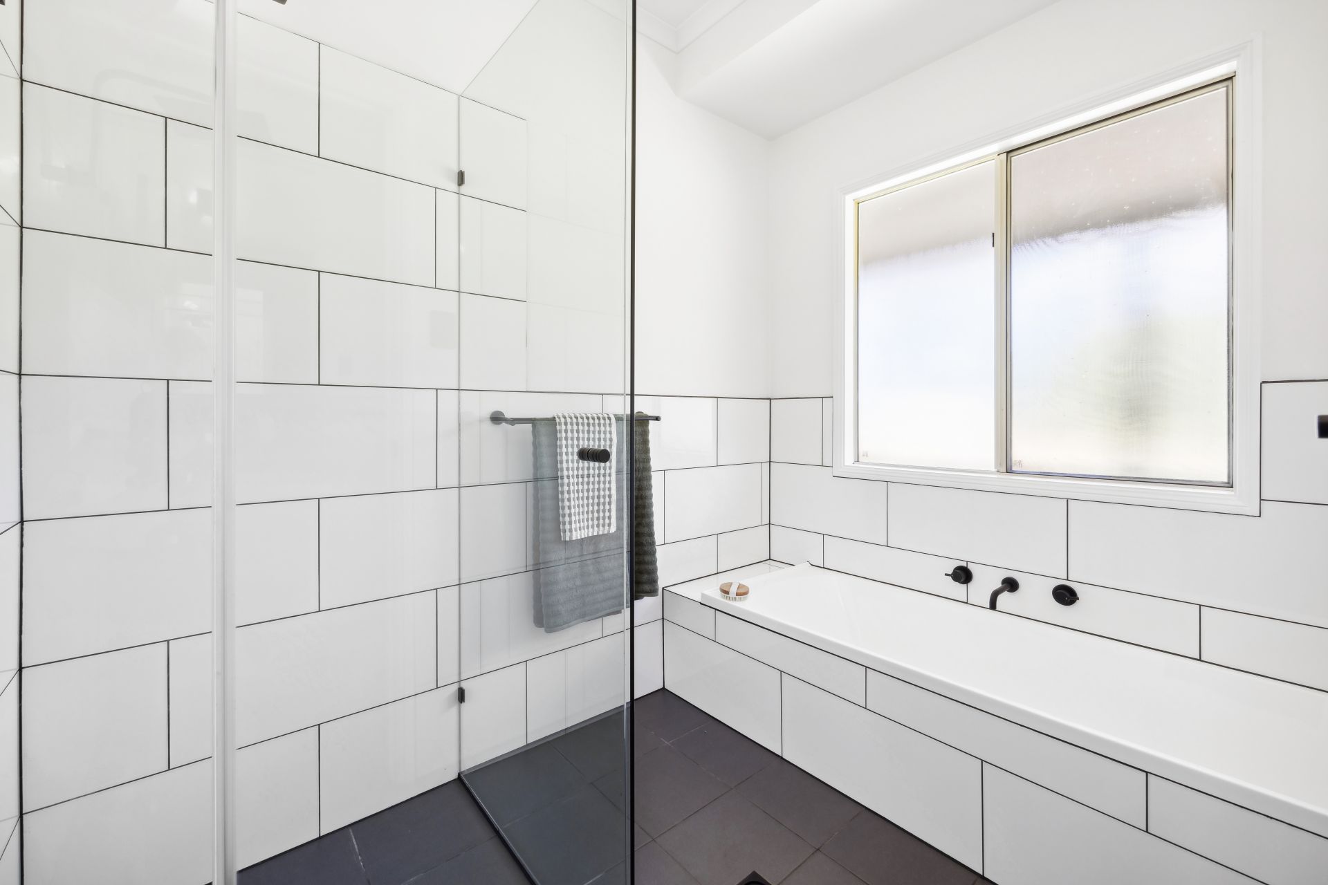 Modern, monochromatic 3-way family bathroom