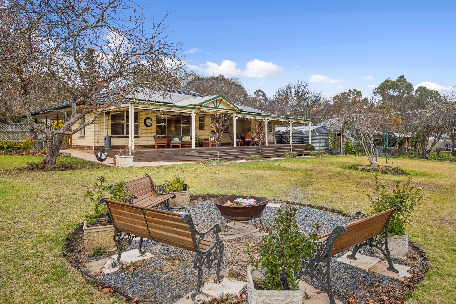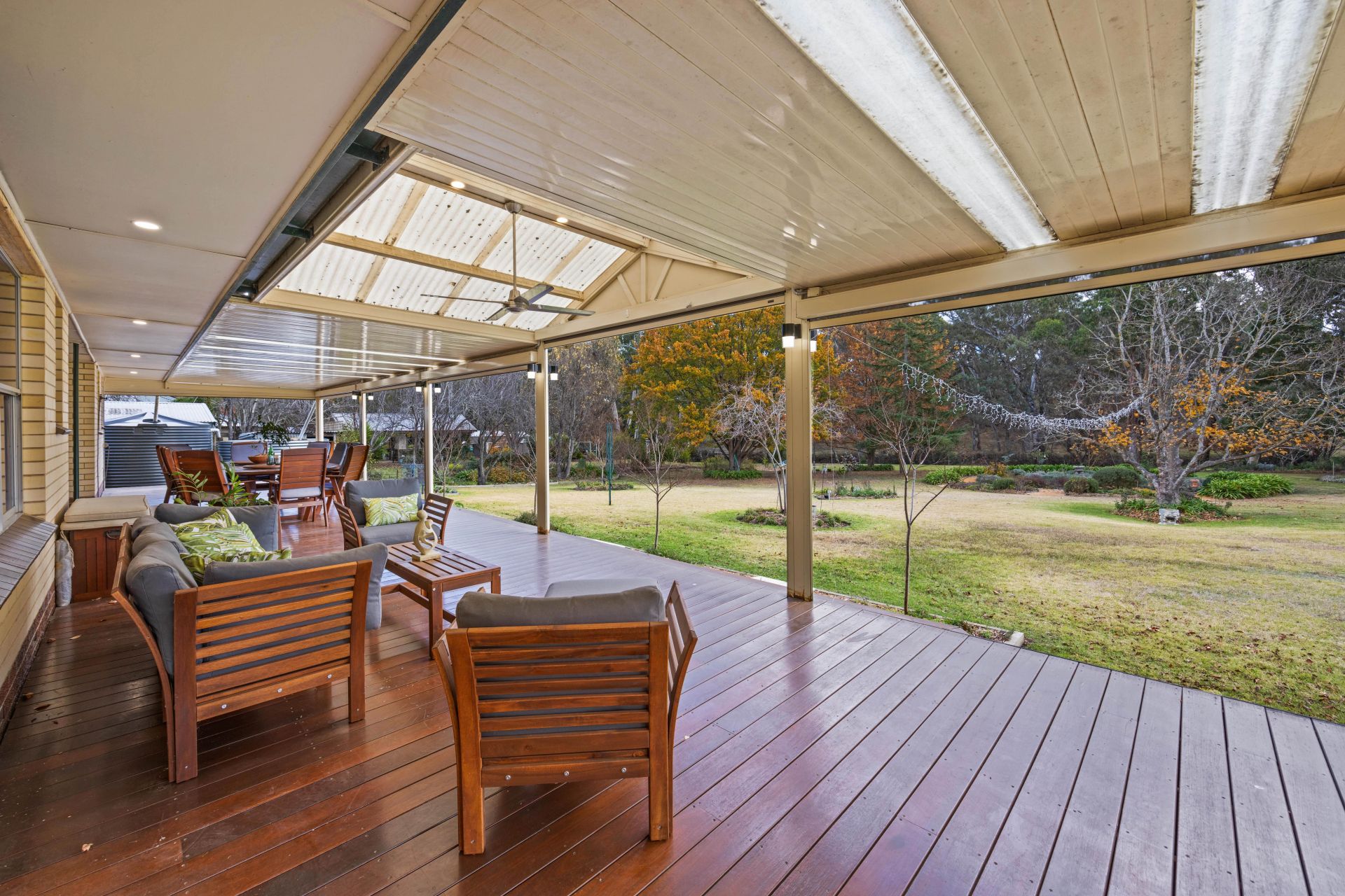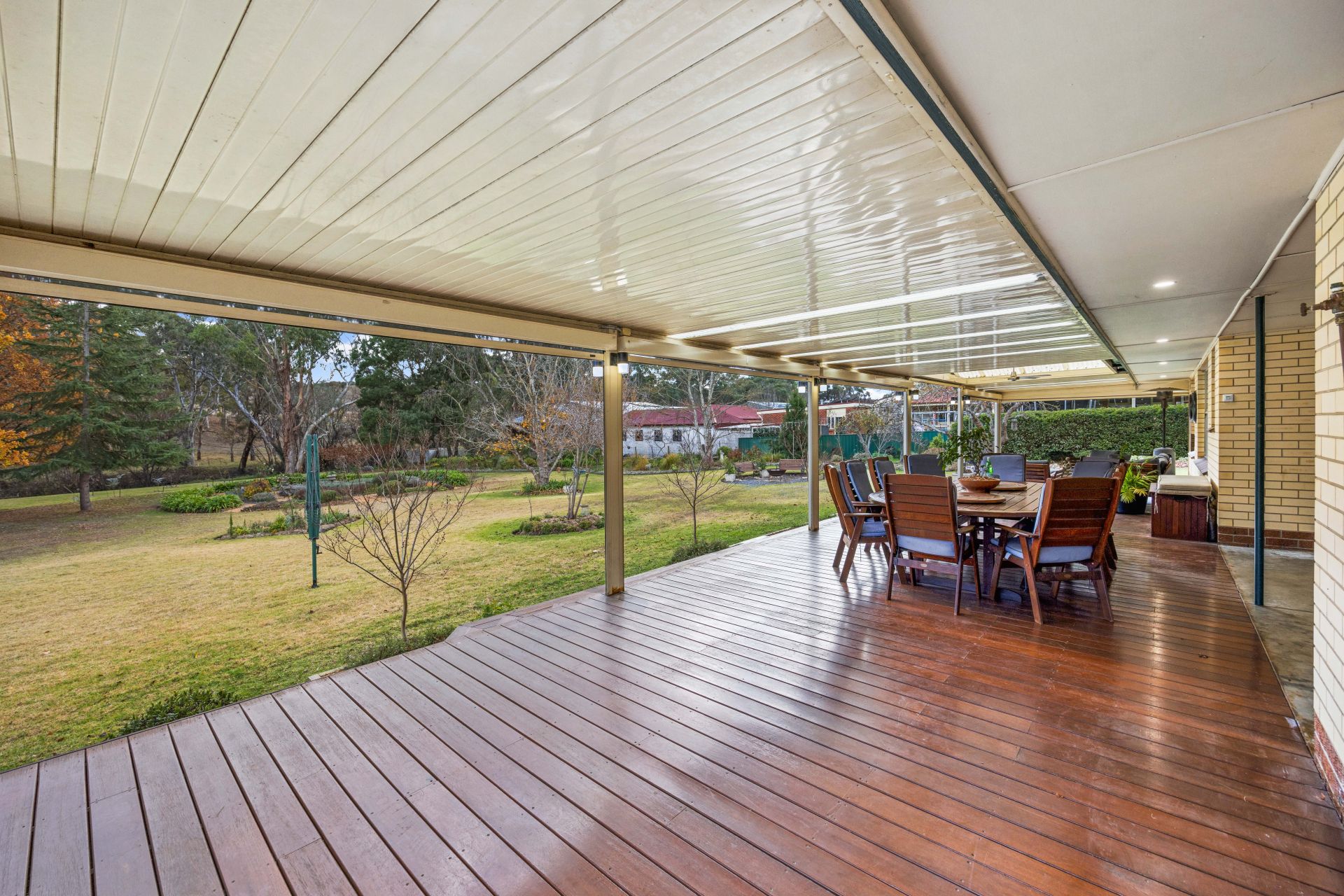The rear 17m verandah, fully enclosable via electric blinds, shuns a chilly afternoon, yet with views like this, grab a jacket instead – a garden tour revealing vegie and herb beds plus statuesque liquidambars, golden elms, plane trees, crepe myrtles, sycamores and magnolias.