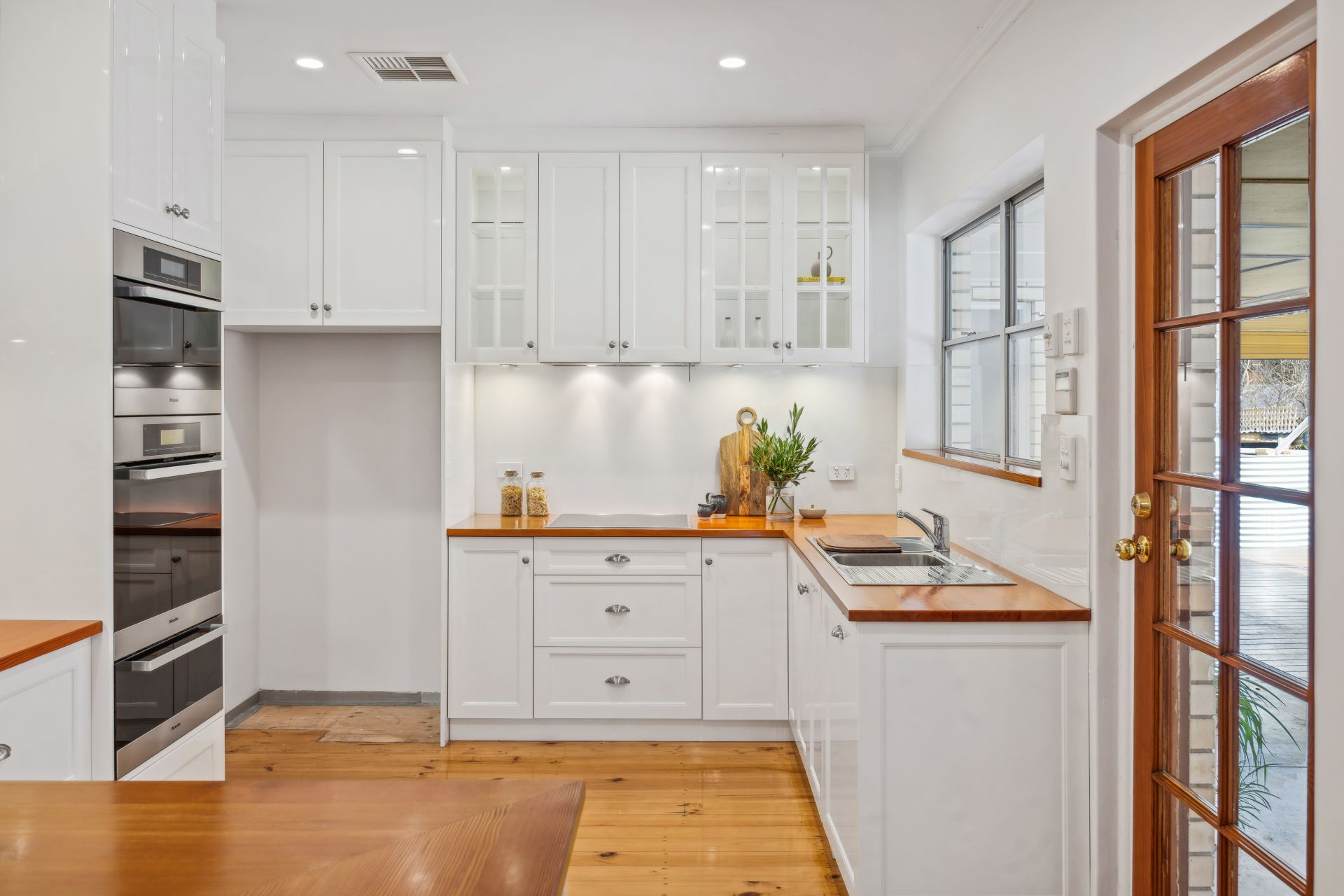 On-trend a decade on, the shaker style Peter Wolfe kitchen hosting Miele appliances - an induction cooktop, dishwasher, steam and pyrolytic ovens plus a warming drawer - rounds off with Oregan benchtops and plenty of walk-in pantry envy.