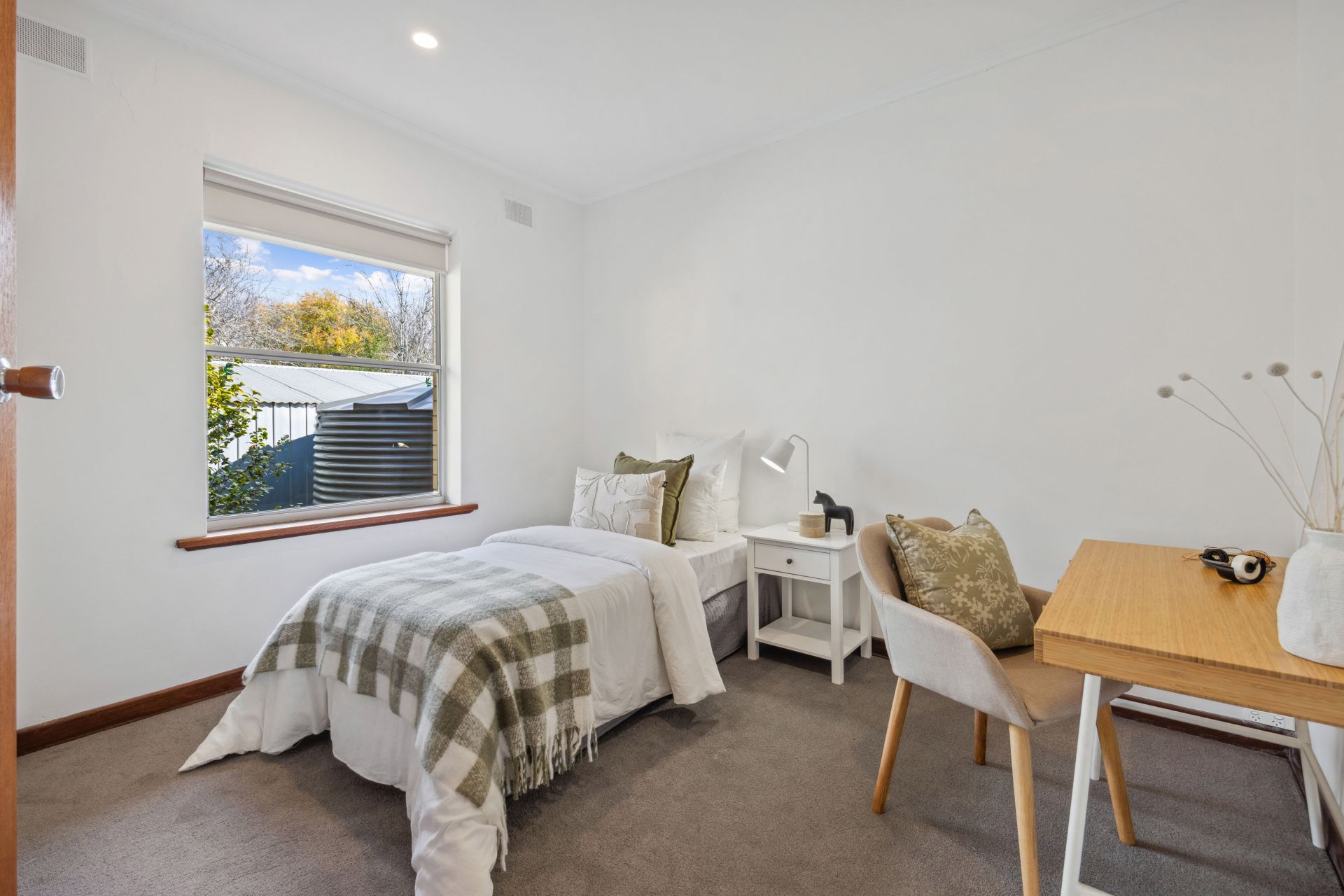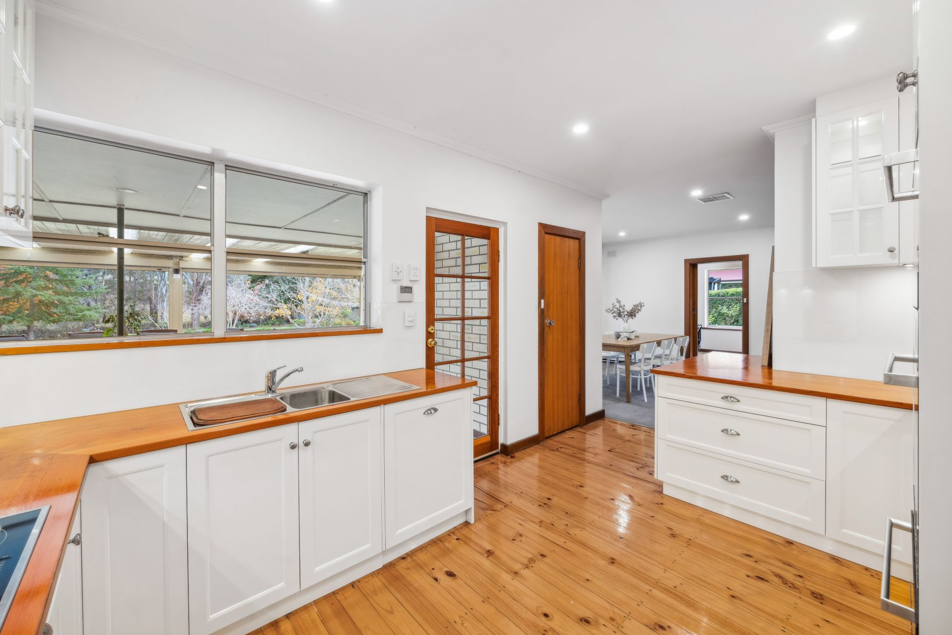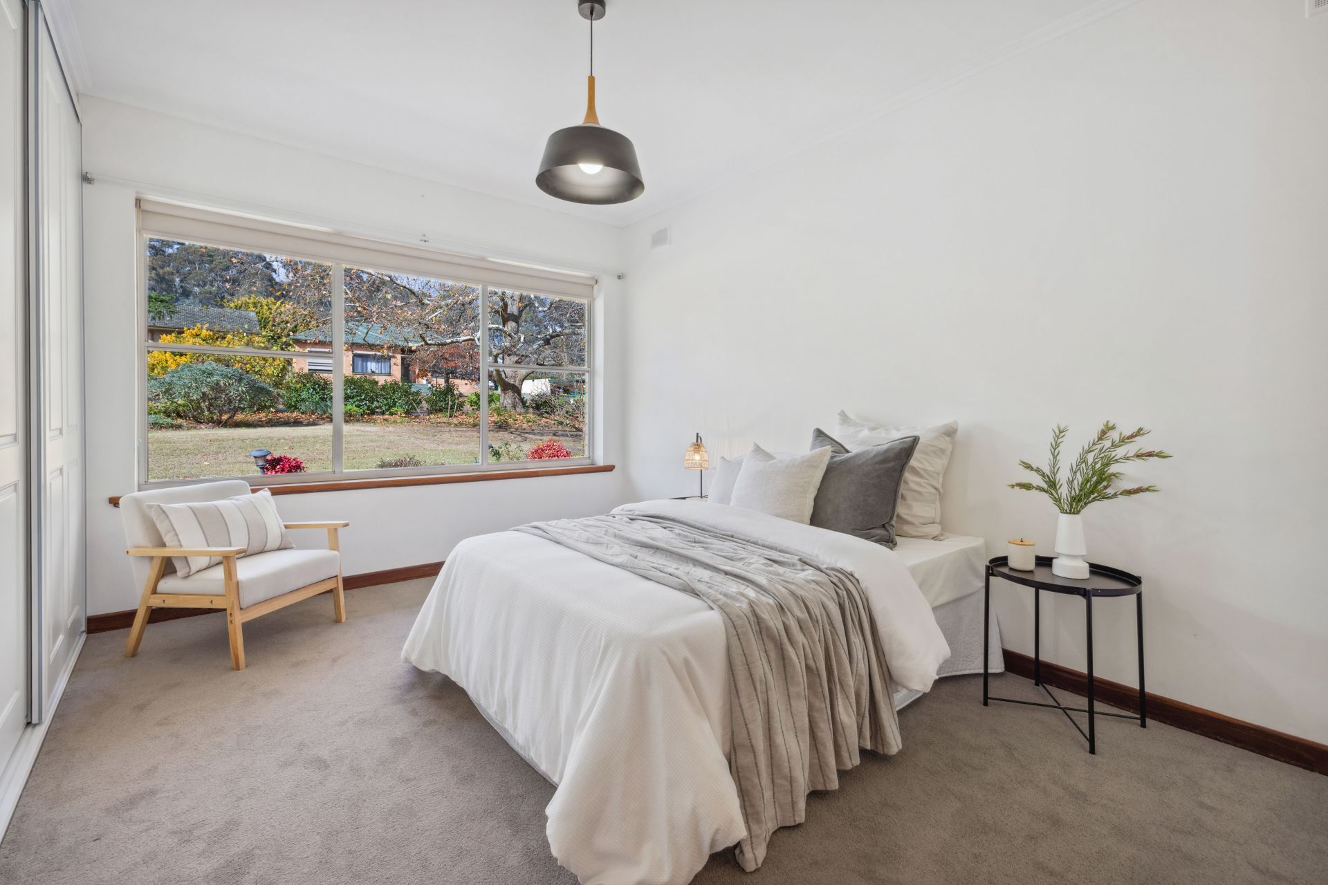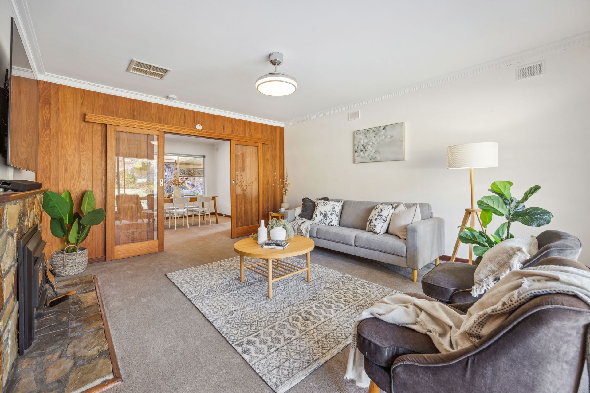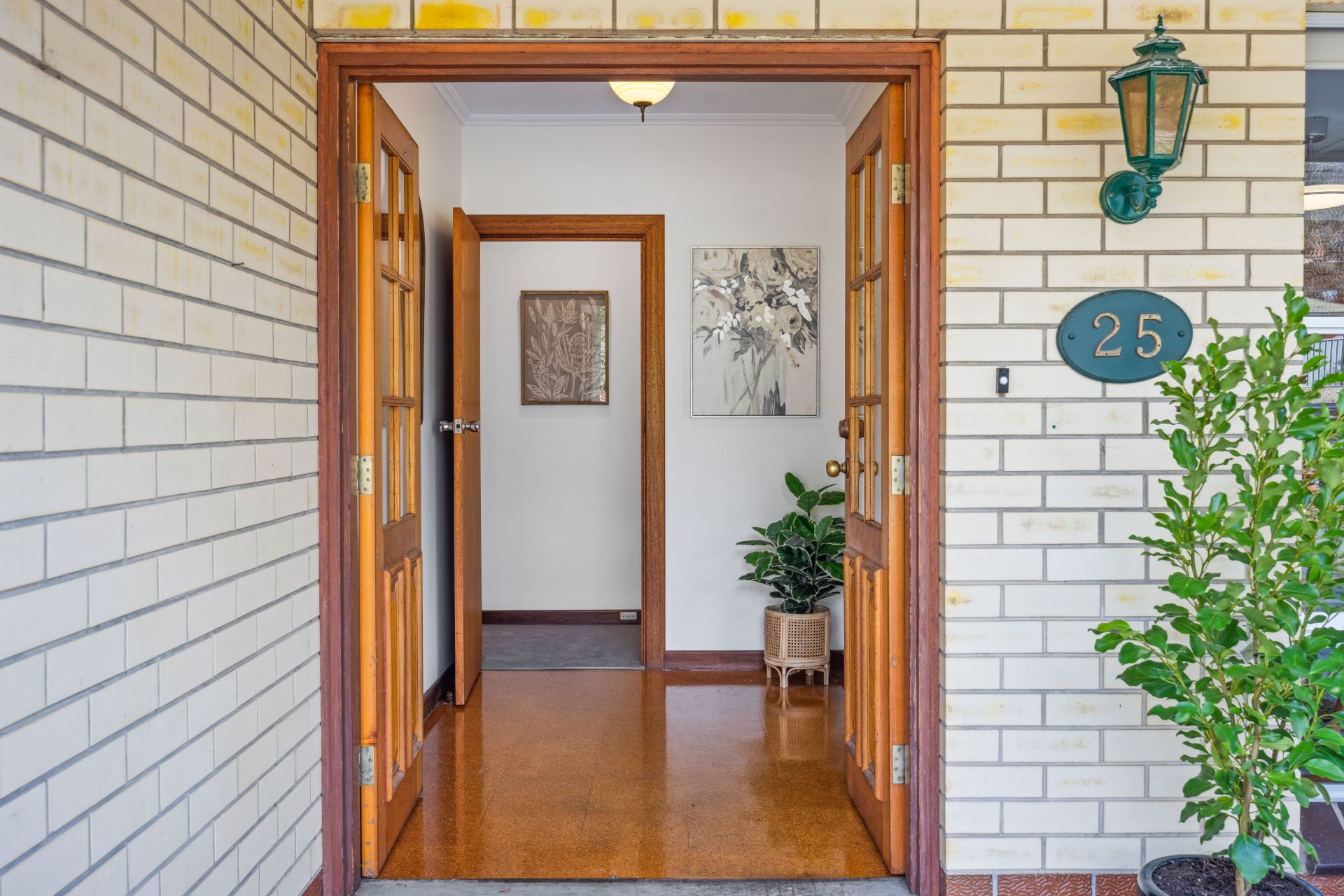 The big, double brick home, rich in the fabric of its era hosts three spacious bedrooms plus a study, huge garden-grabbing windows, and retro living-to-dining-room glass dividers, all paired with a few welcome upgrades.