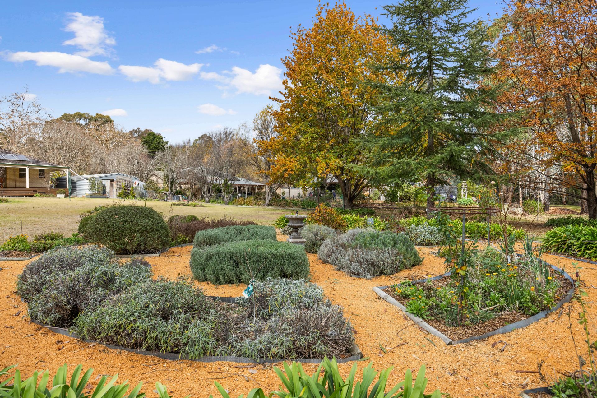 Firepit area and formal 'Parterre' gardens with herbs & vegies
