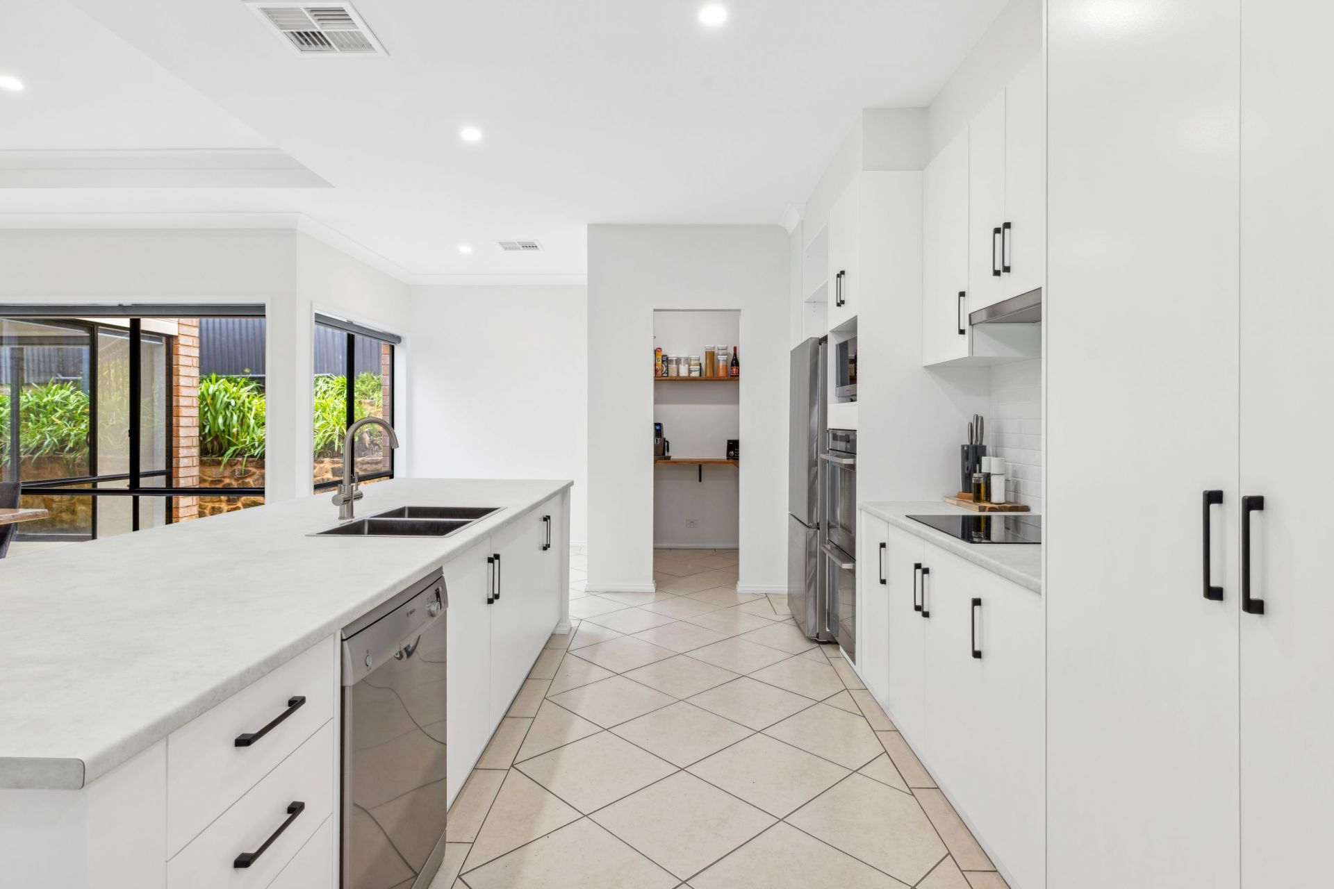 With subtle subway tiles and contrasting black handles, the recently refreshed kitchen introduces Electrolux double ovens, a Haier induction cooktop, and Bosch dishwasher against a walk-in butler's style pantry.