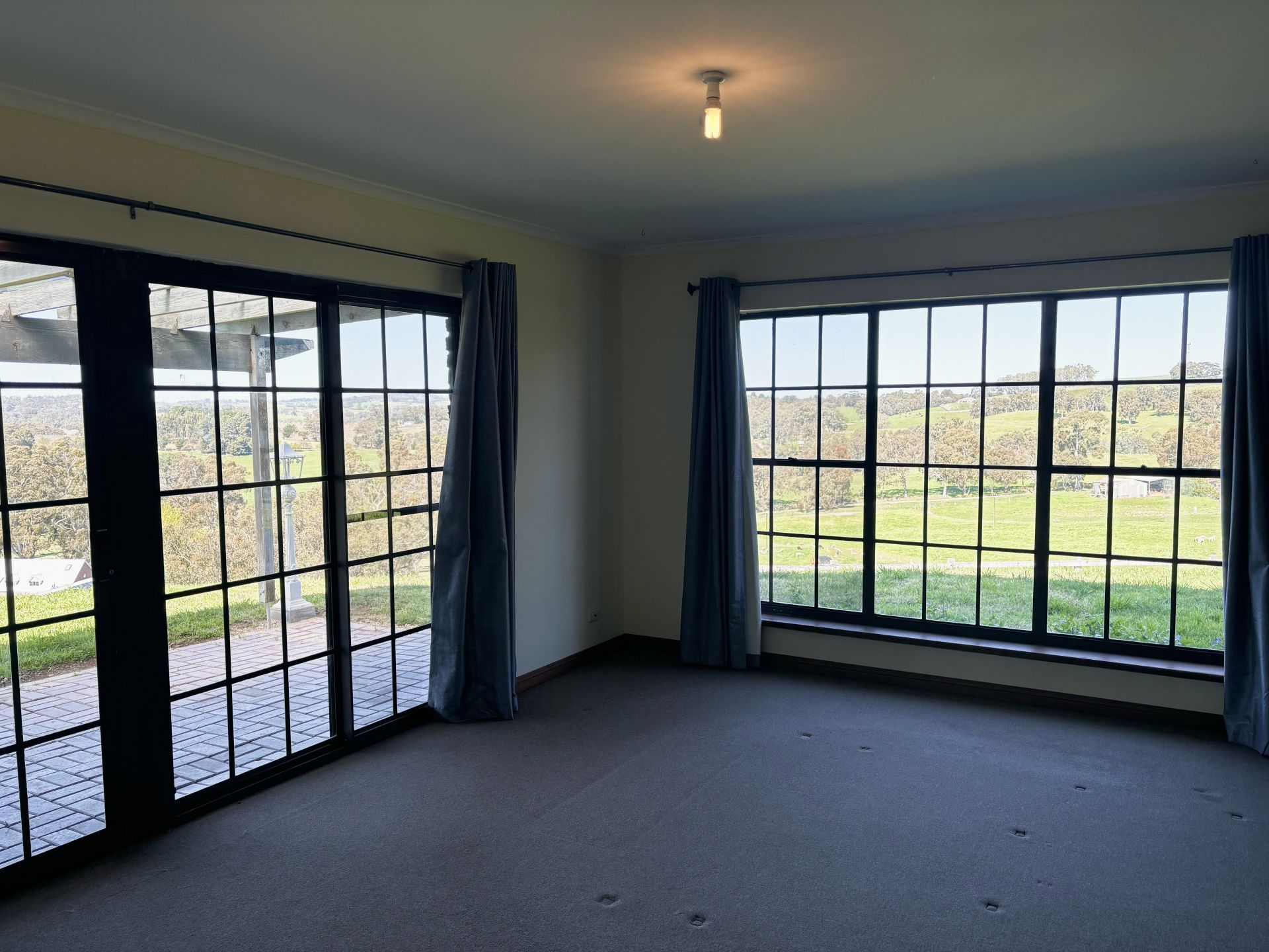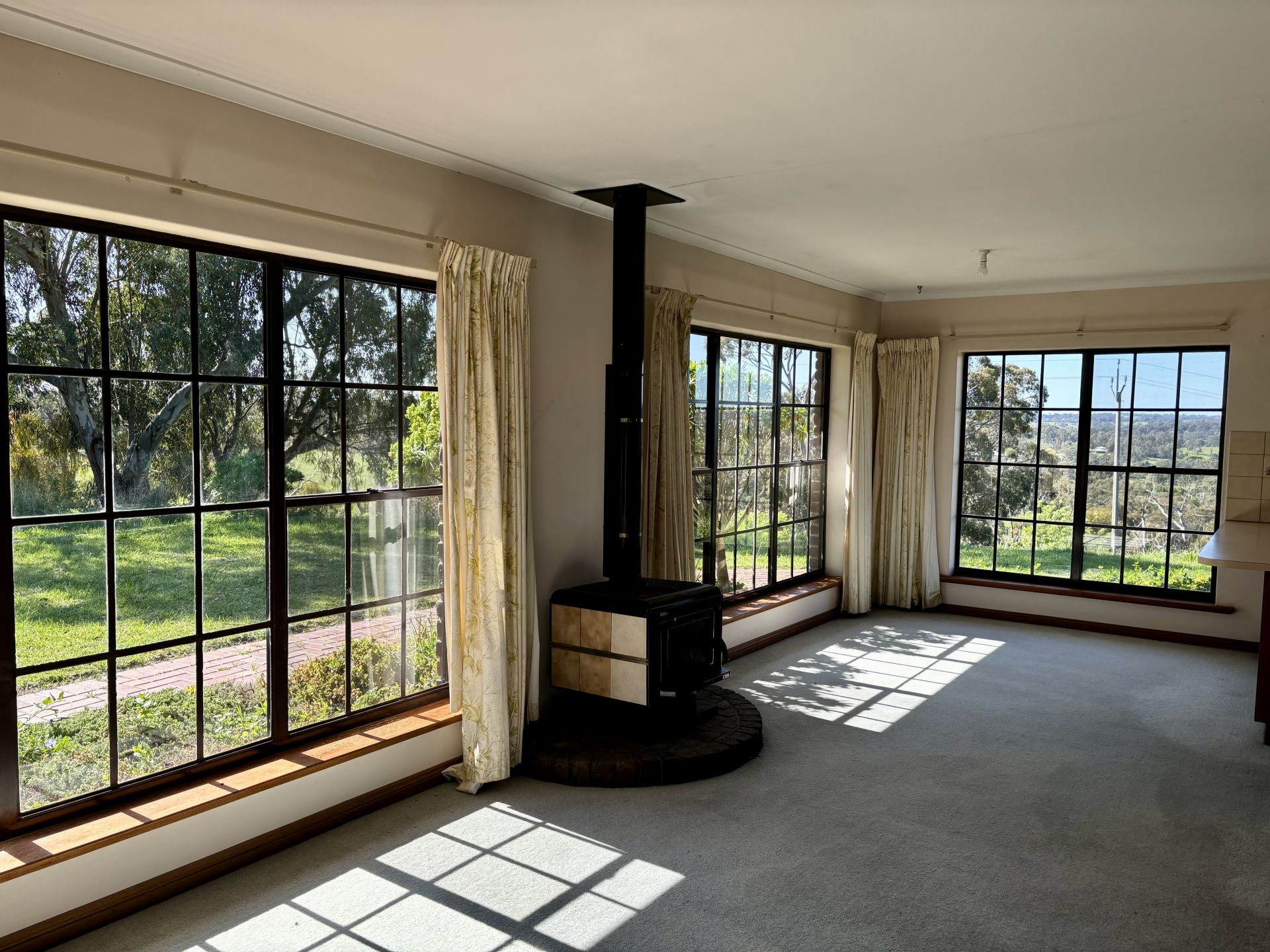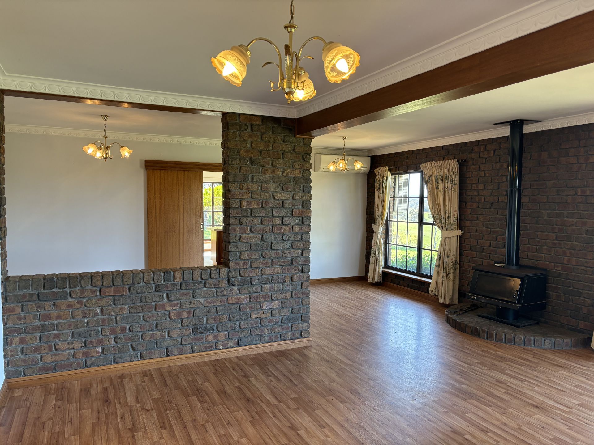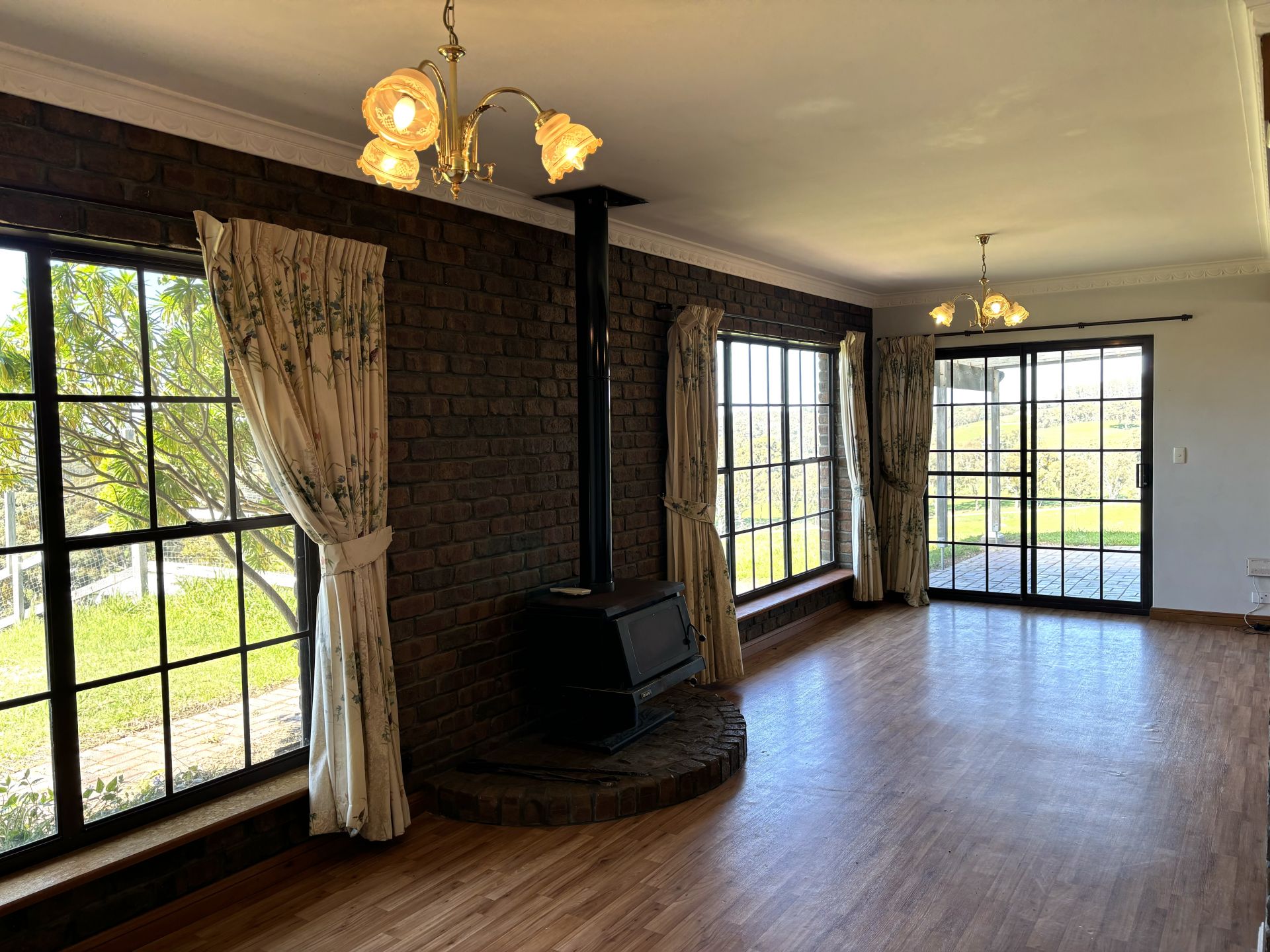 The living areas showcase panoramic views of the lush gardens and paddocks, complete with combustion heaters to keep you cozy during the cooler months. One of these spaces also boasts air conditioning for your comfort all year round.