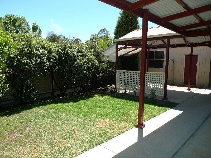 Outside pergola entertainment area, secluded enclosed rear yard, small gardens and lawned area.