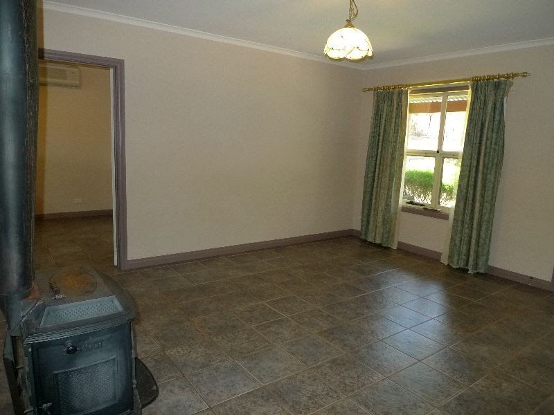 Living area with pot belly stove and separate dining area leading through to an additional study.