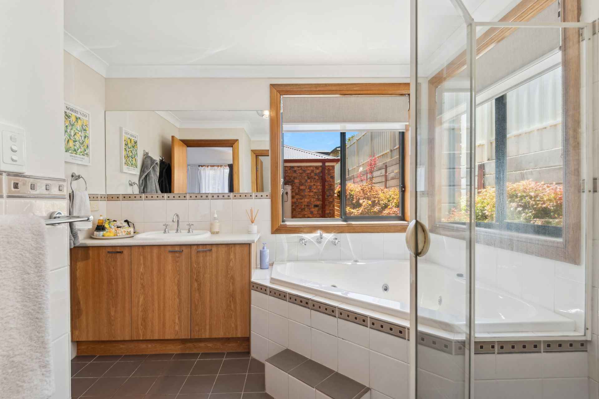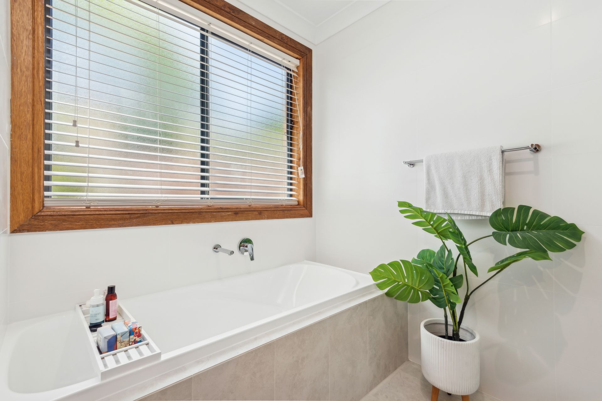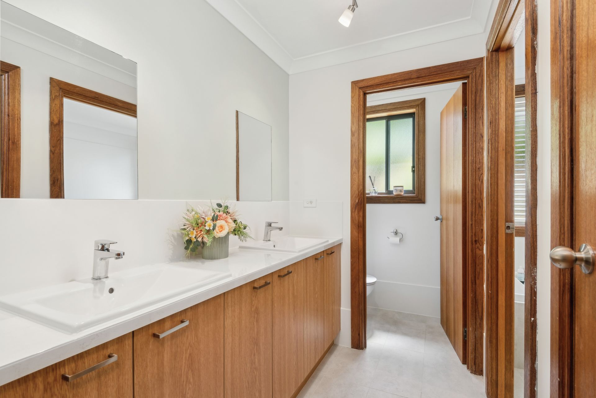 Off entry, the parent's wing escapes to a sunlit spa ensuite and walk-in robe opposite the study. At the far end of the home, the chic new bathroom with a sweeping dual-basined vanity, simply fits in like it's always belonged.