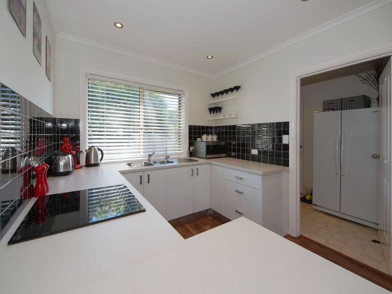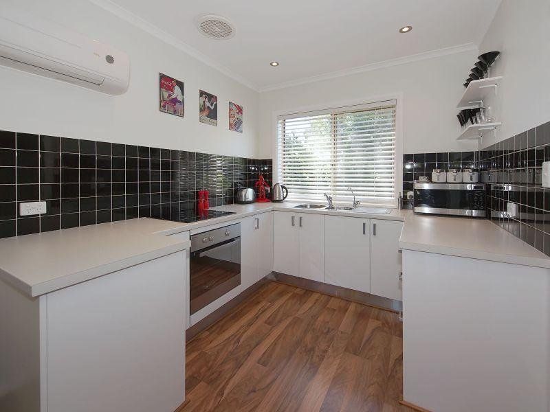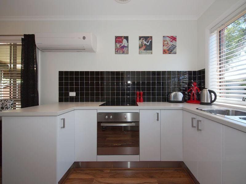 The kitchen has been recently renovated with a red, black and white theme and features a new stainless steel oven, ceramic cook top, extensive bench space, timber floors and split system air conditioning.