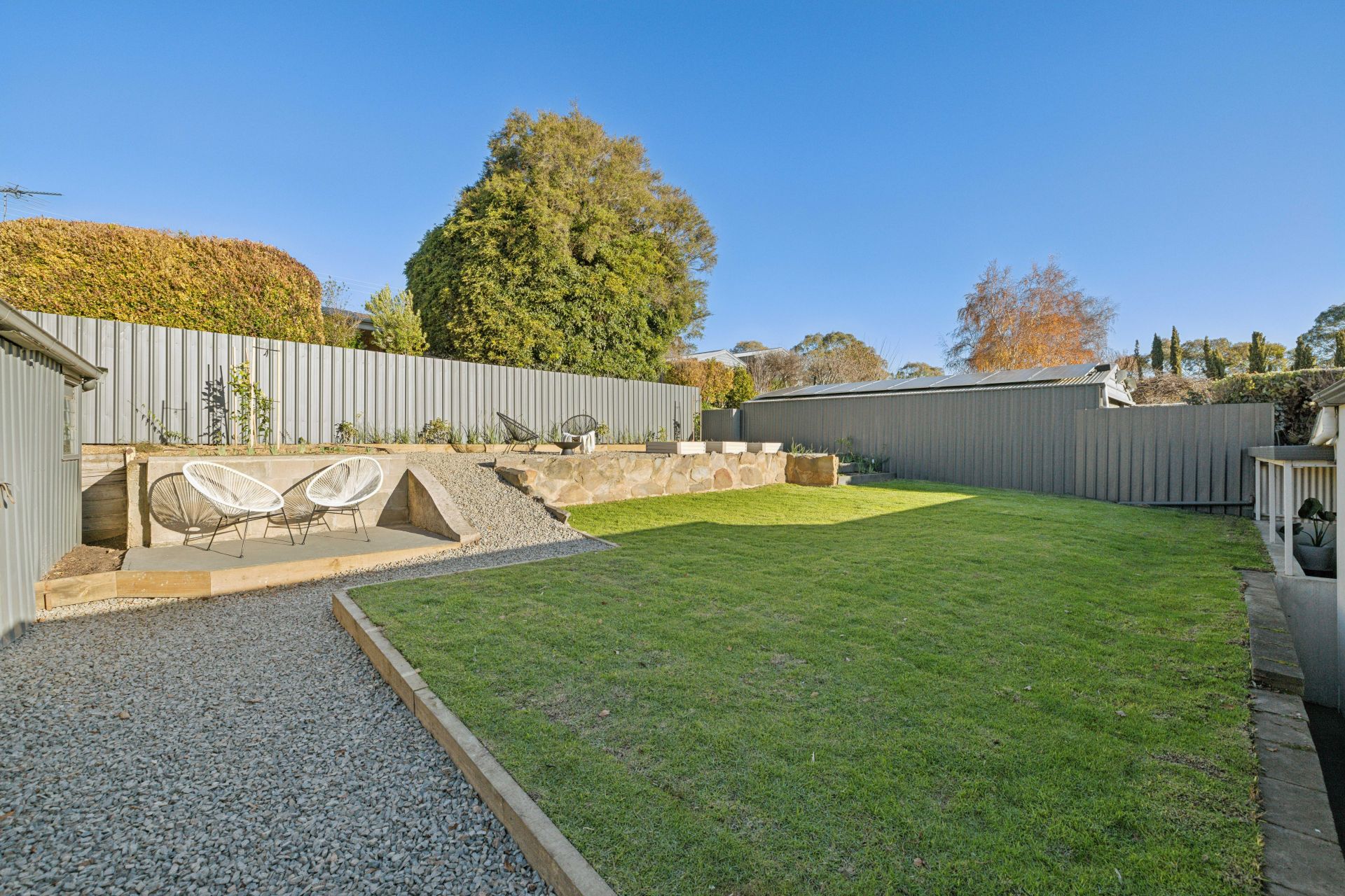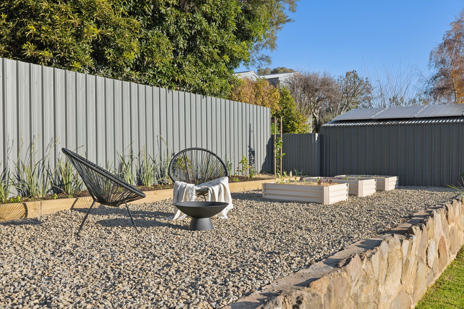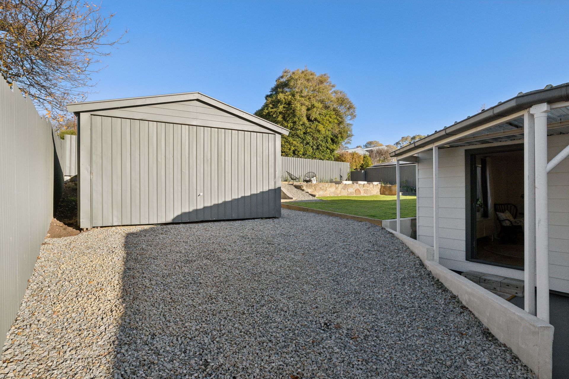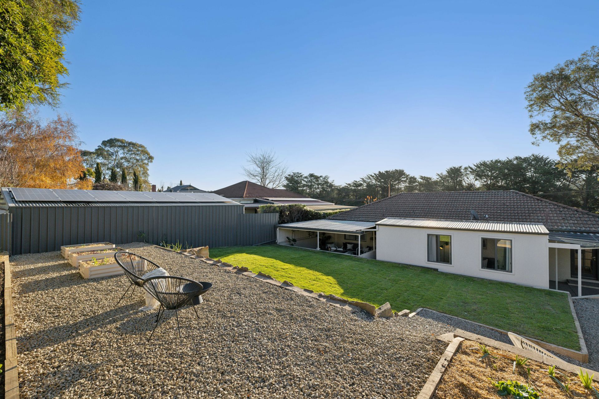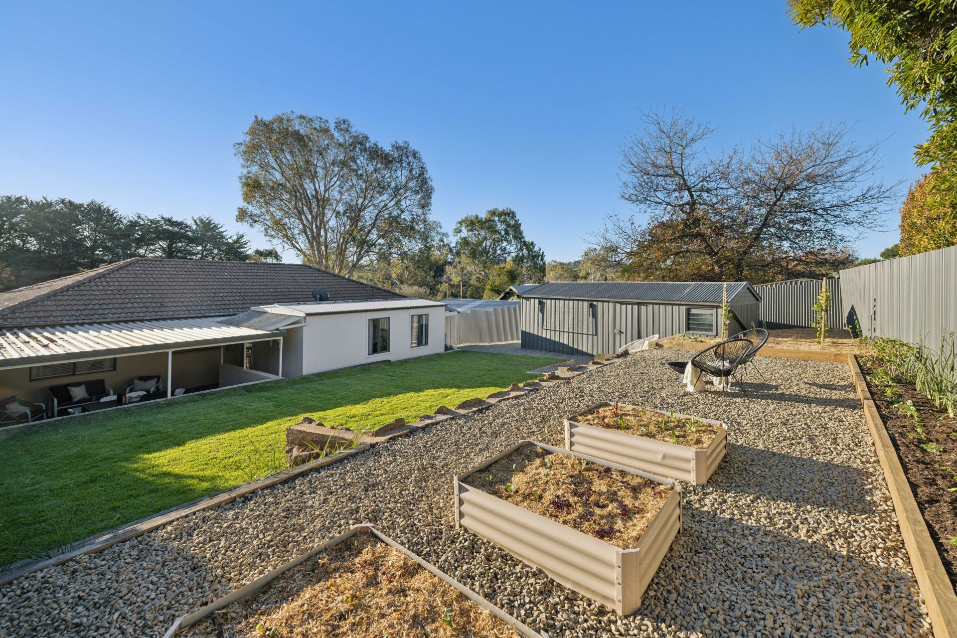 Beyond the gravelled parking verge and gated driveway are gardens that don't just set the tone; they set the prettiest, fully fenced foundations for levelled lawn play, home-grown veggies, weekend entertaining, firepit nights one step closer to the stars, and direct vehicle access to the powered rear garage.