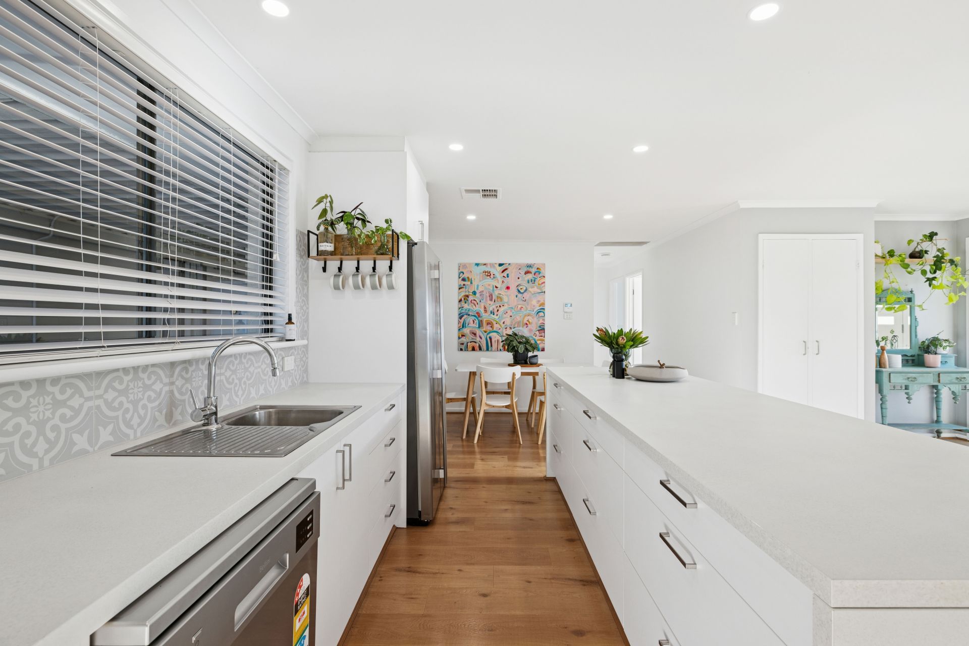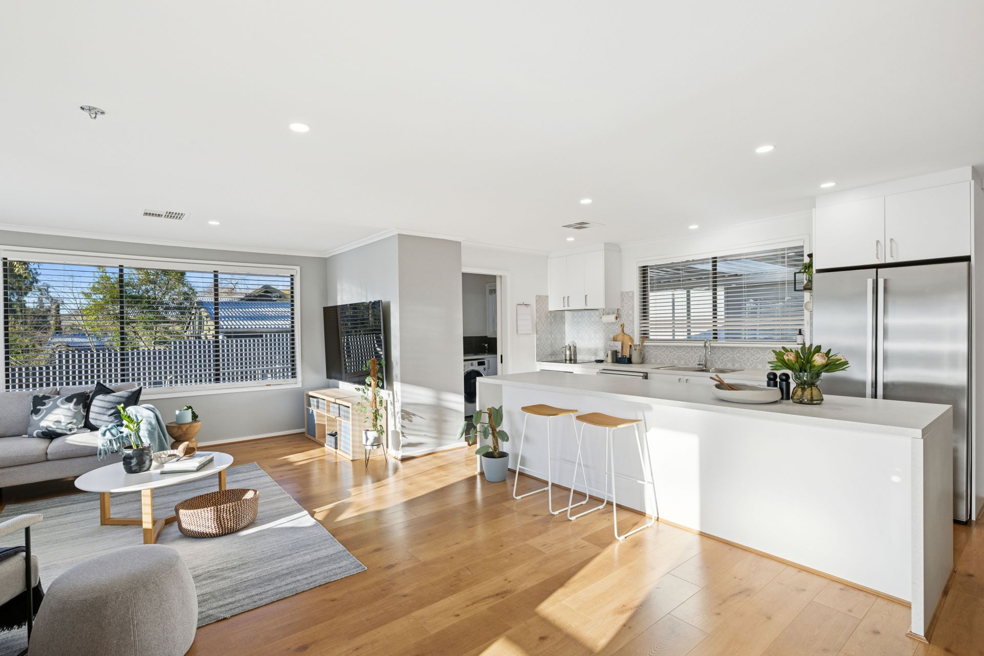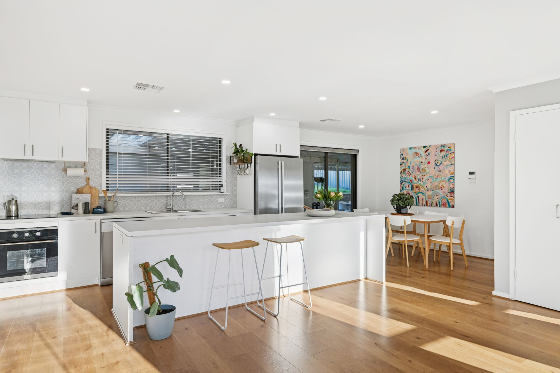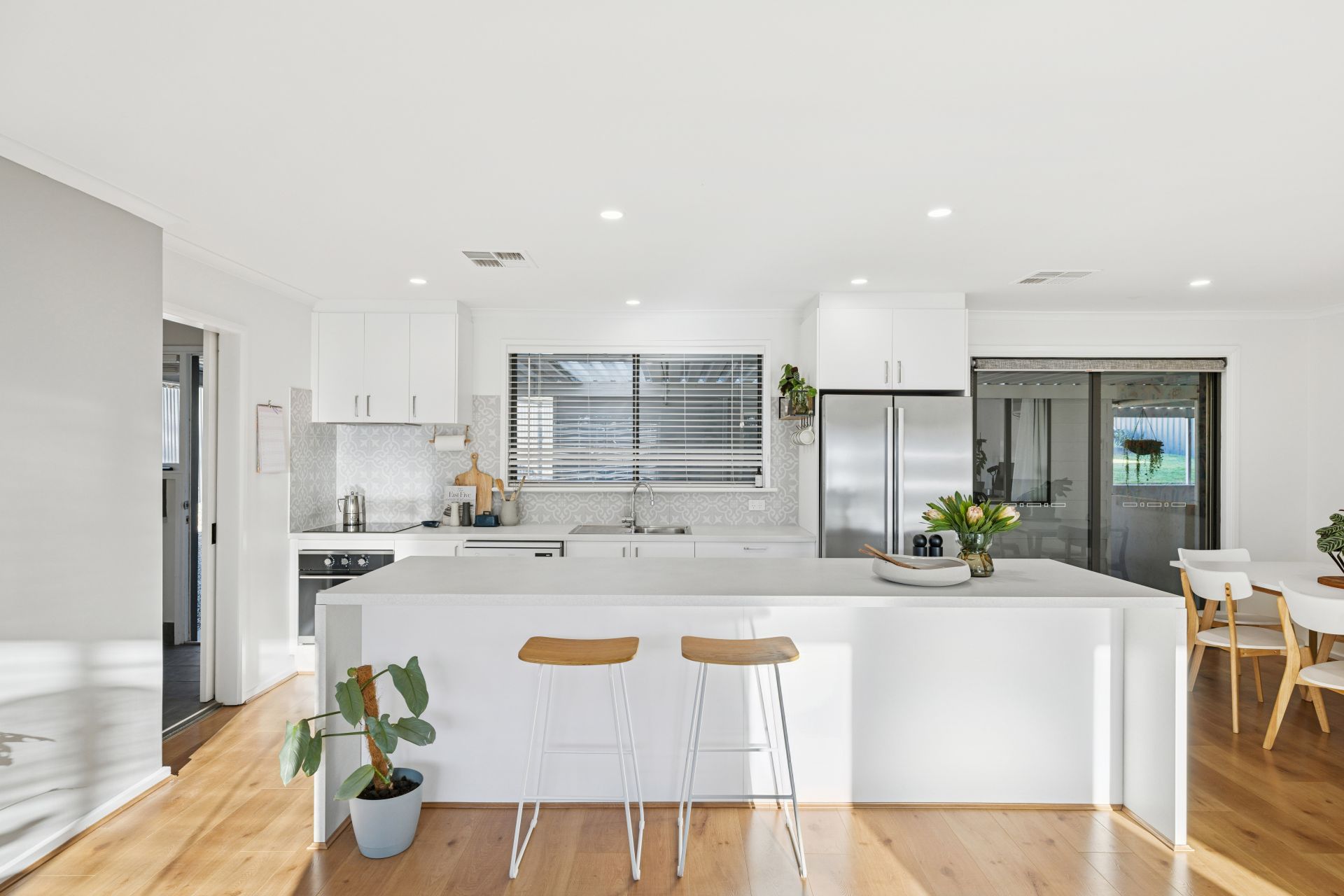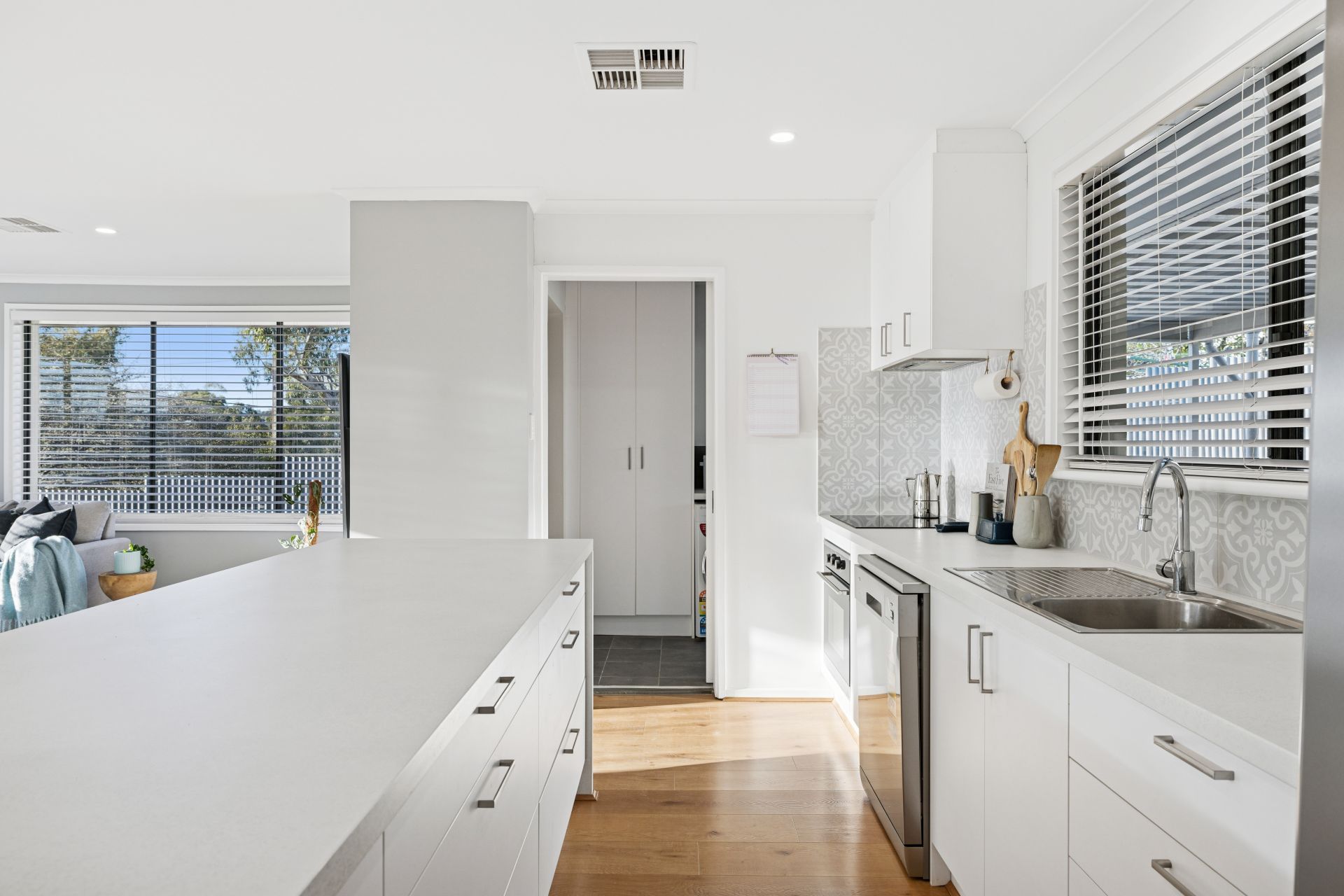 And you'll ease into the home's sunlit, social surrounds of the leading living, dining and kitchen - the cook's zone, framed by a central island and featuring quality stainless appliances, flaunts a brand-new move: a discreet walk-in pantry, edging the adjoining laundry.