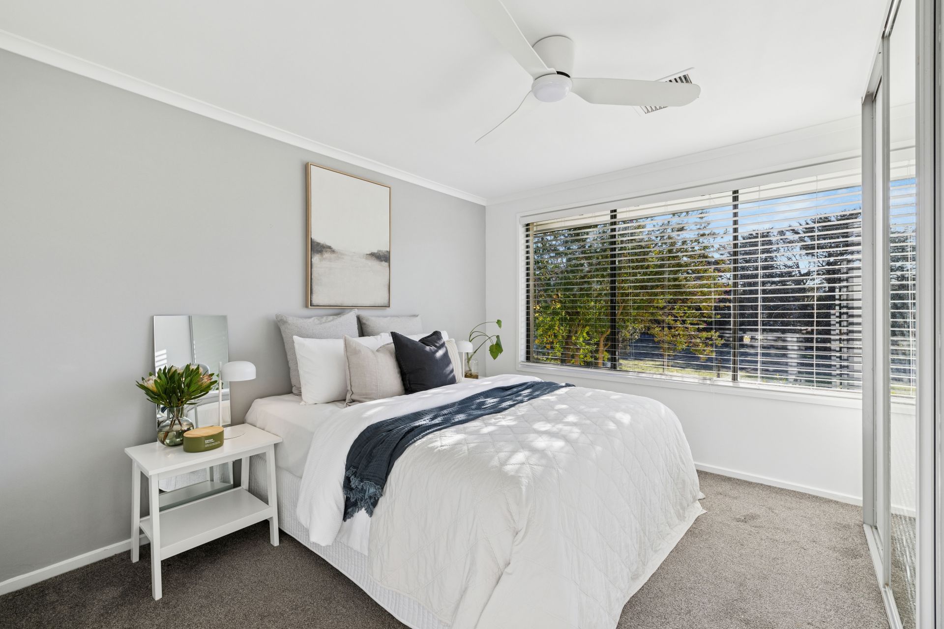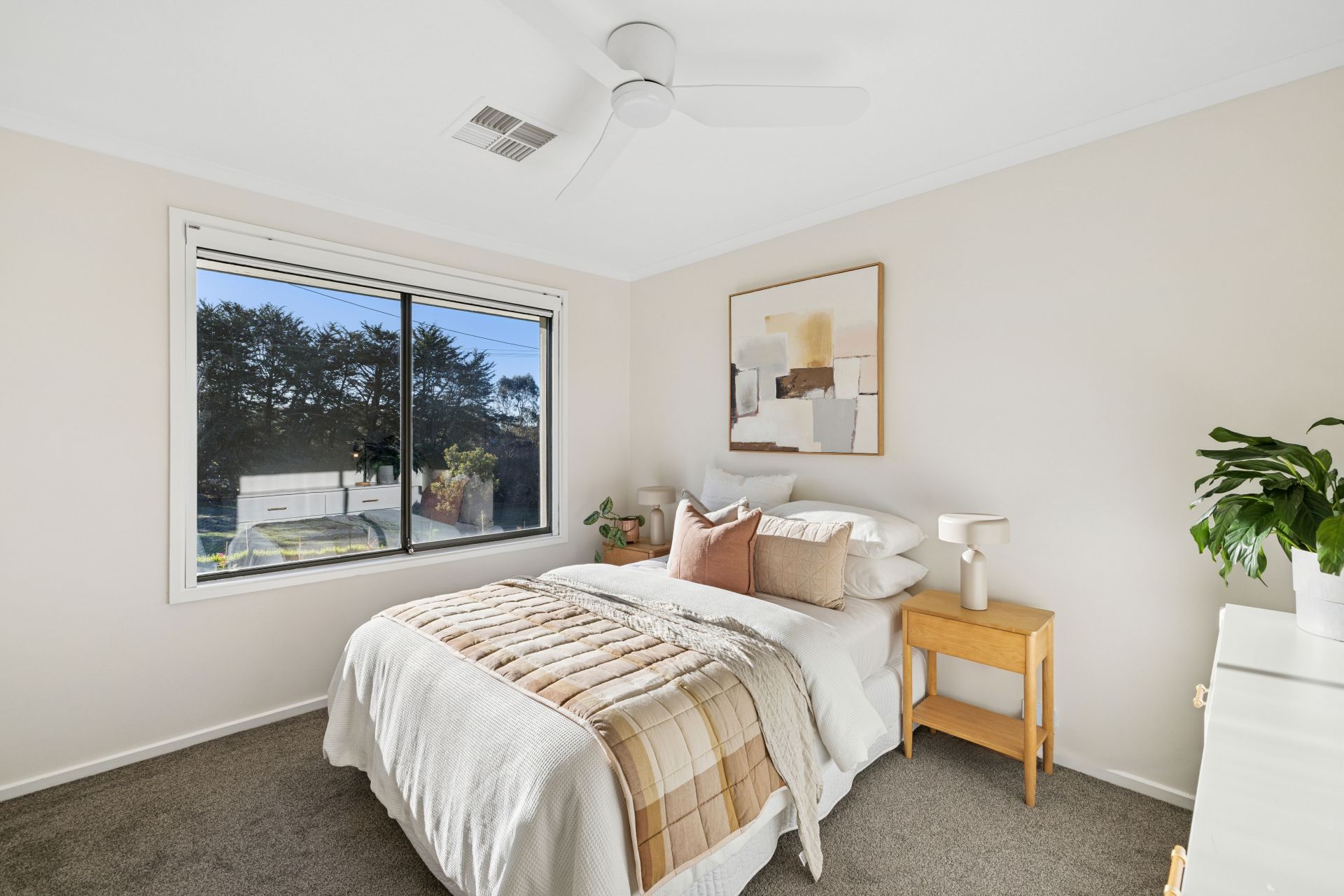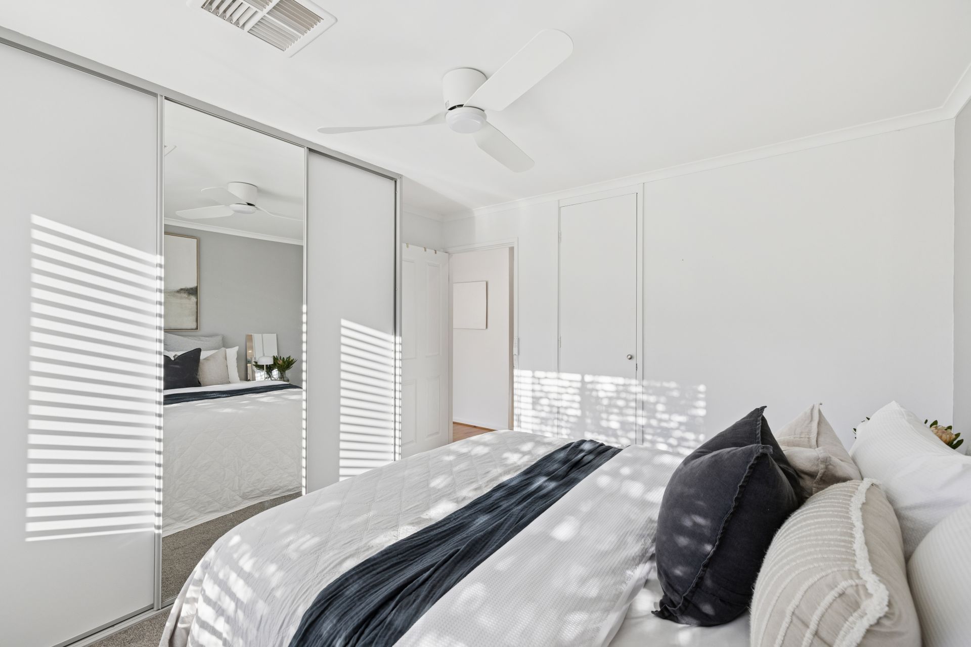 Of the three original bedrooms, two feature robes, two offer ceiling fans, and all sit beside the whitewashed family bathroom with a separate WC.