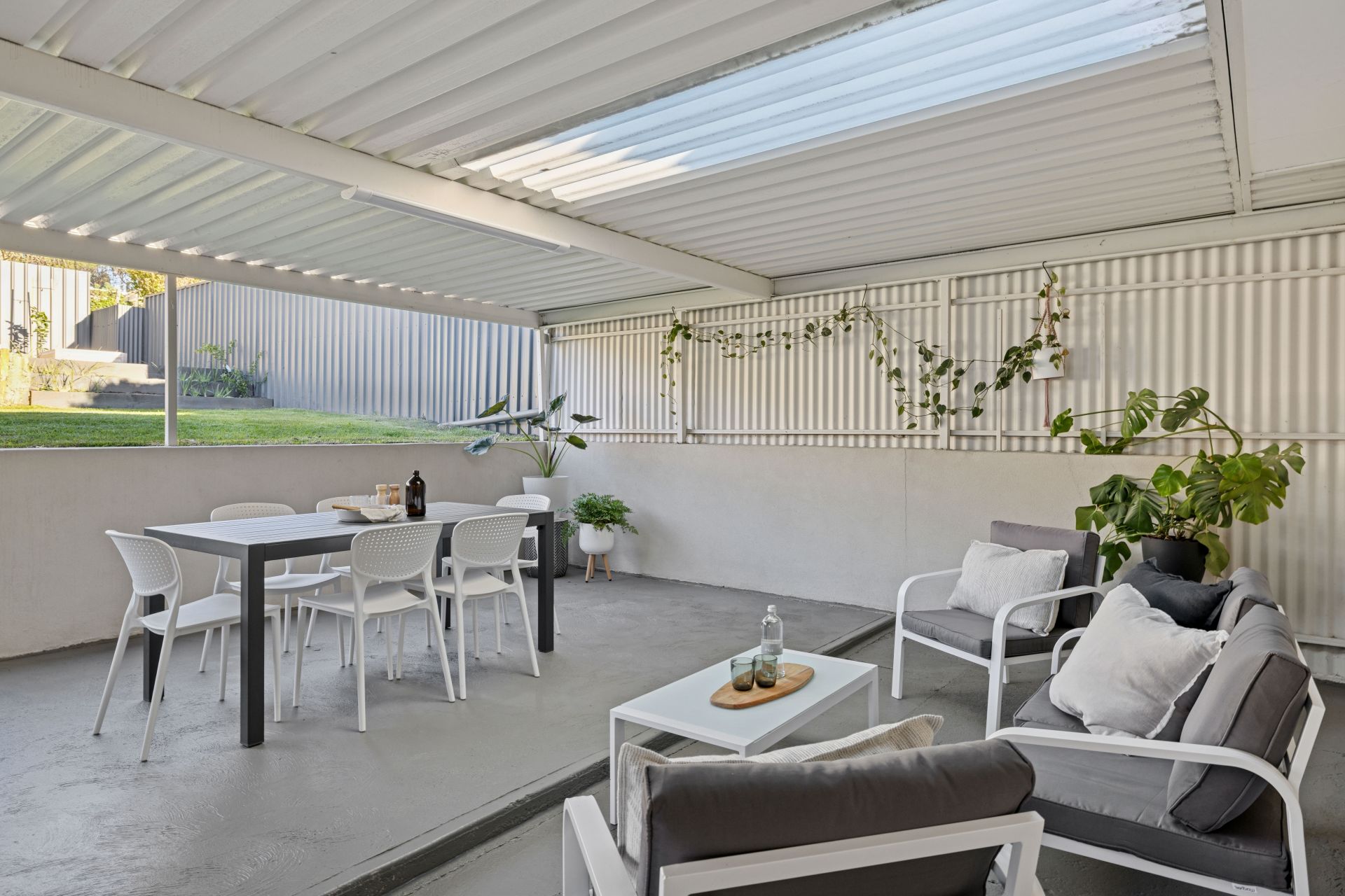 All-weather indoor/outdoor living zone atop painted concrete