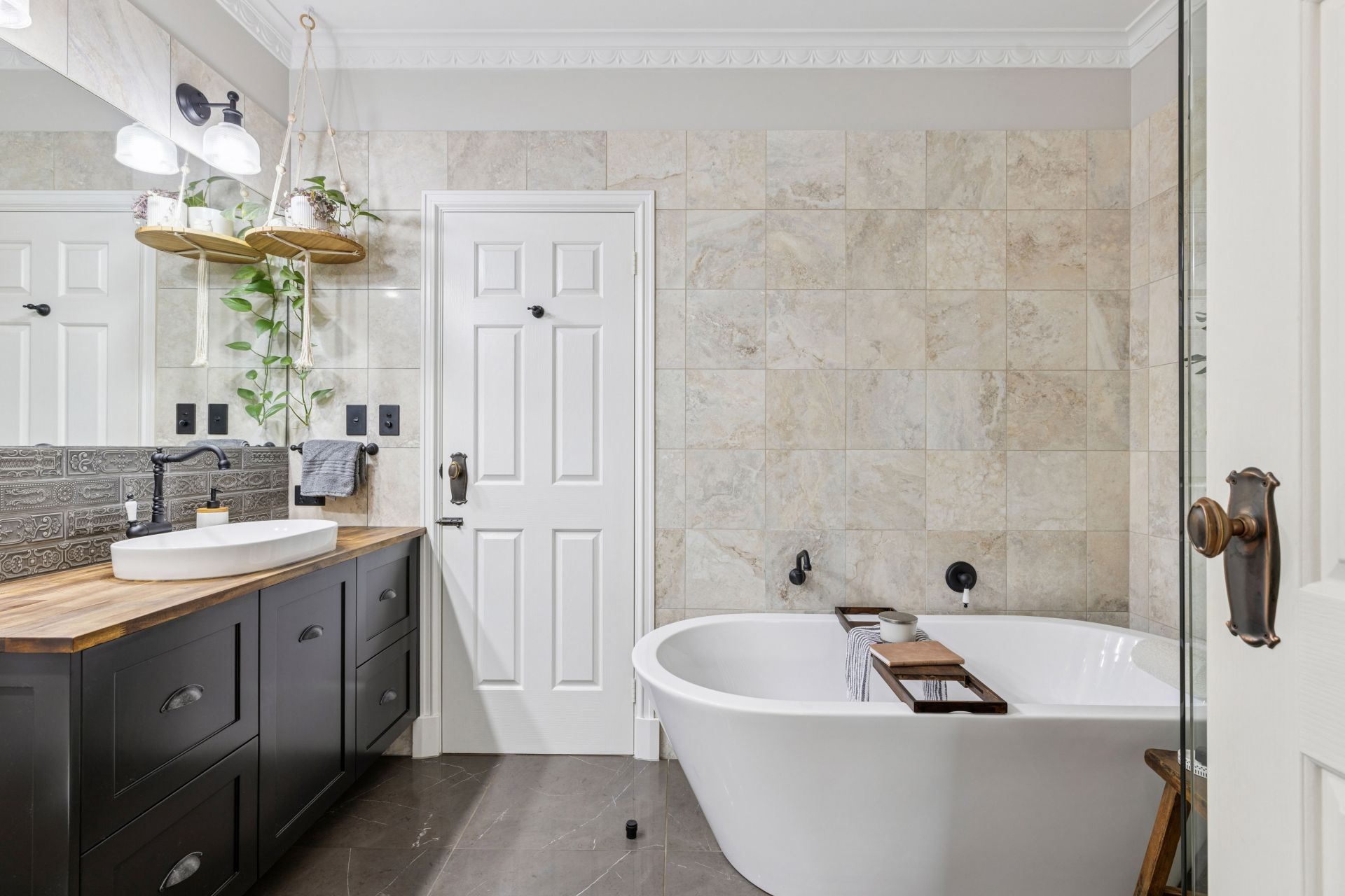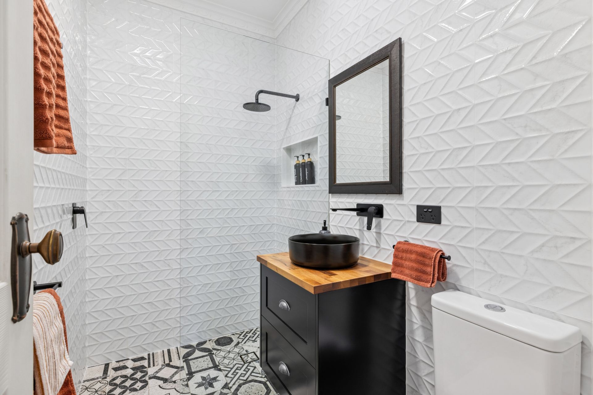A fourth bedroom is also front-facing, while two rear-set bedrooms sit within easy reach of the fully tiled second bathroom, flaunting texture, style, and a chic palette.