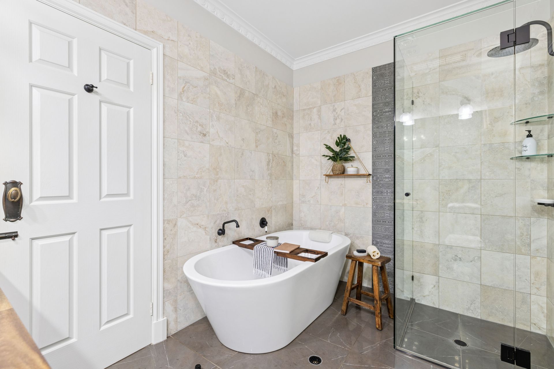 The calming master suite below offers garden views, plush carpets, and a massive walk-in robe granting ensuite access to the central bathroom – its generosity complete with a sumptuous bath, well and truly worthy of its two-way design.