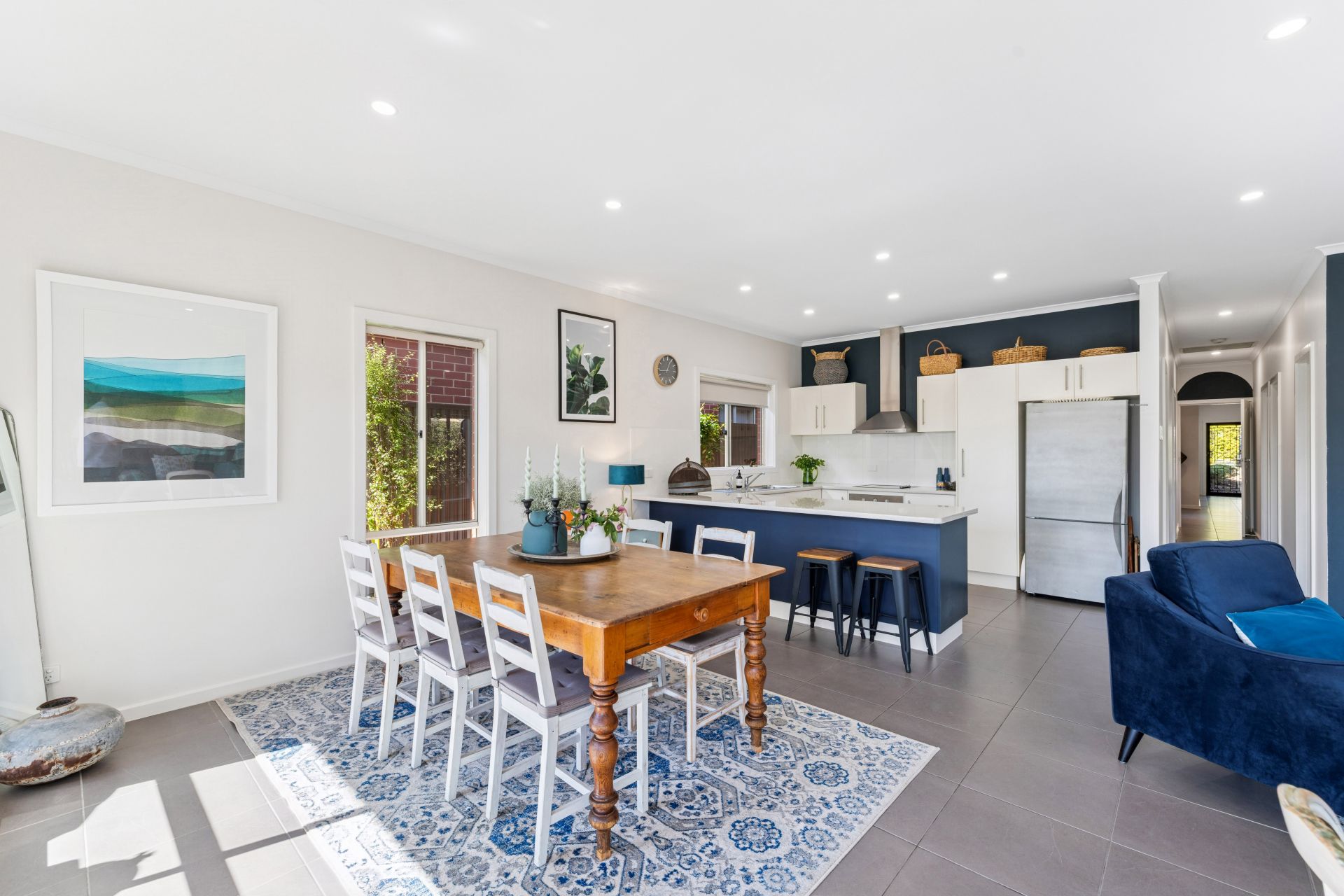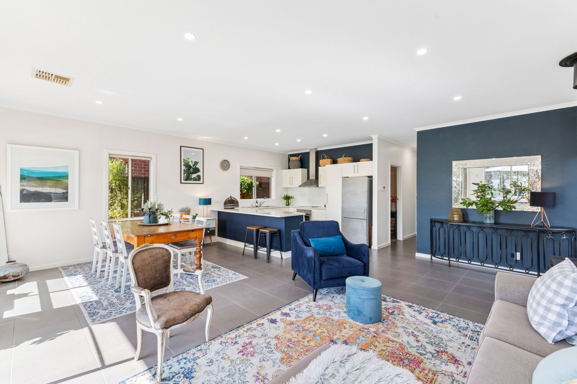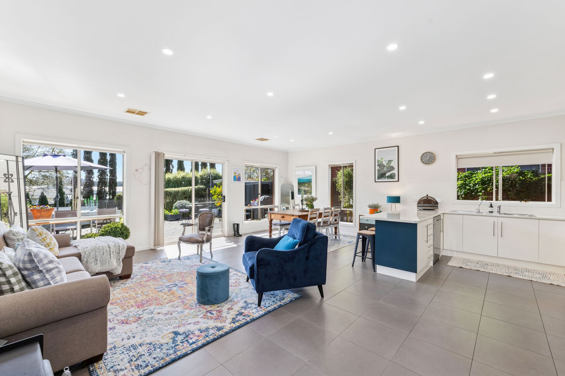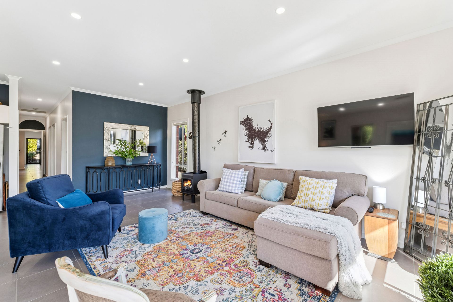 Gifted with sunlight, durable floor tiles and a cosy combustion fire, the open plan living finale is anchored by the kitchen hosting a stainless Fisher & Paykel dishwasher and all-electric appliances, crossing the dining zone to the outdoors and its entertaining target: the open-air paved terrace.