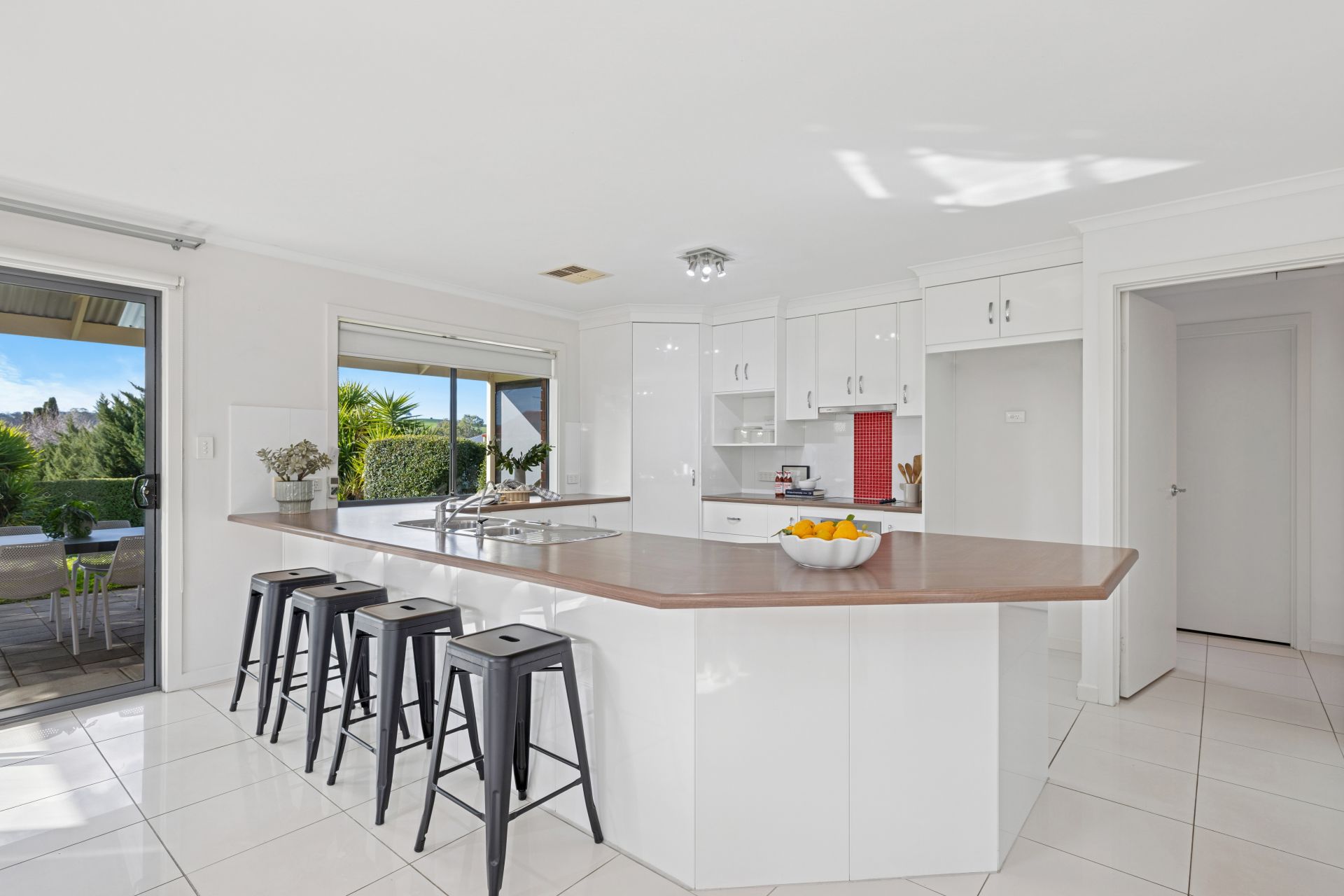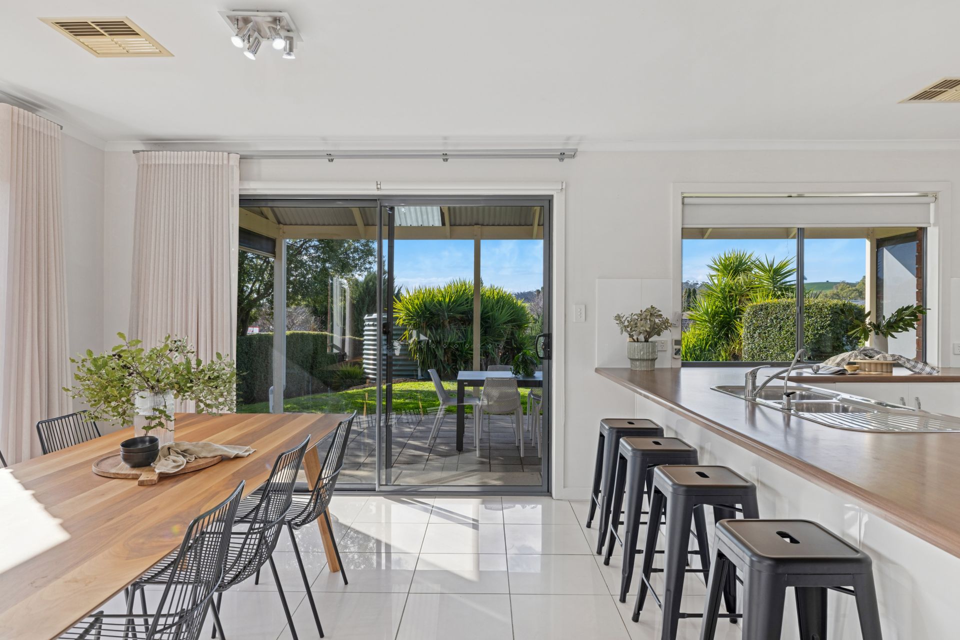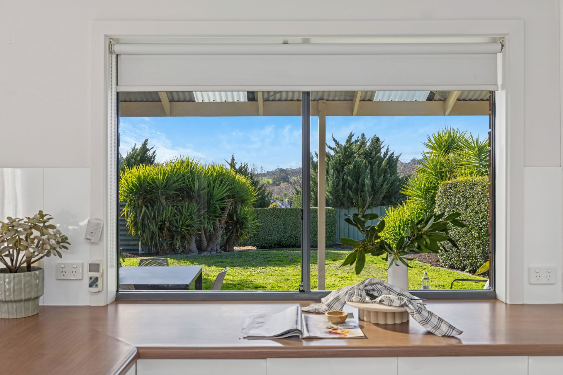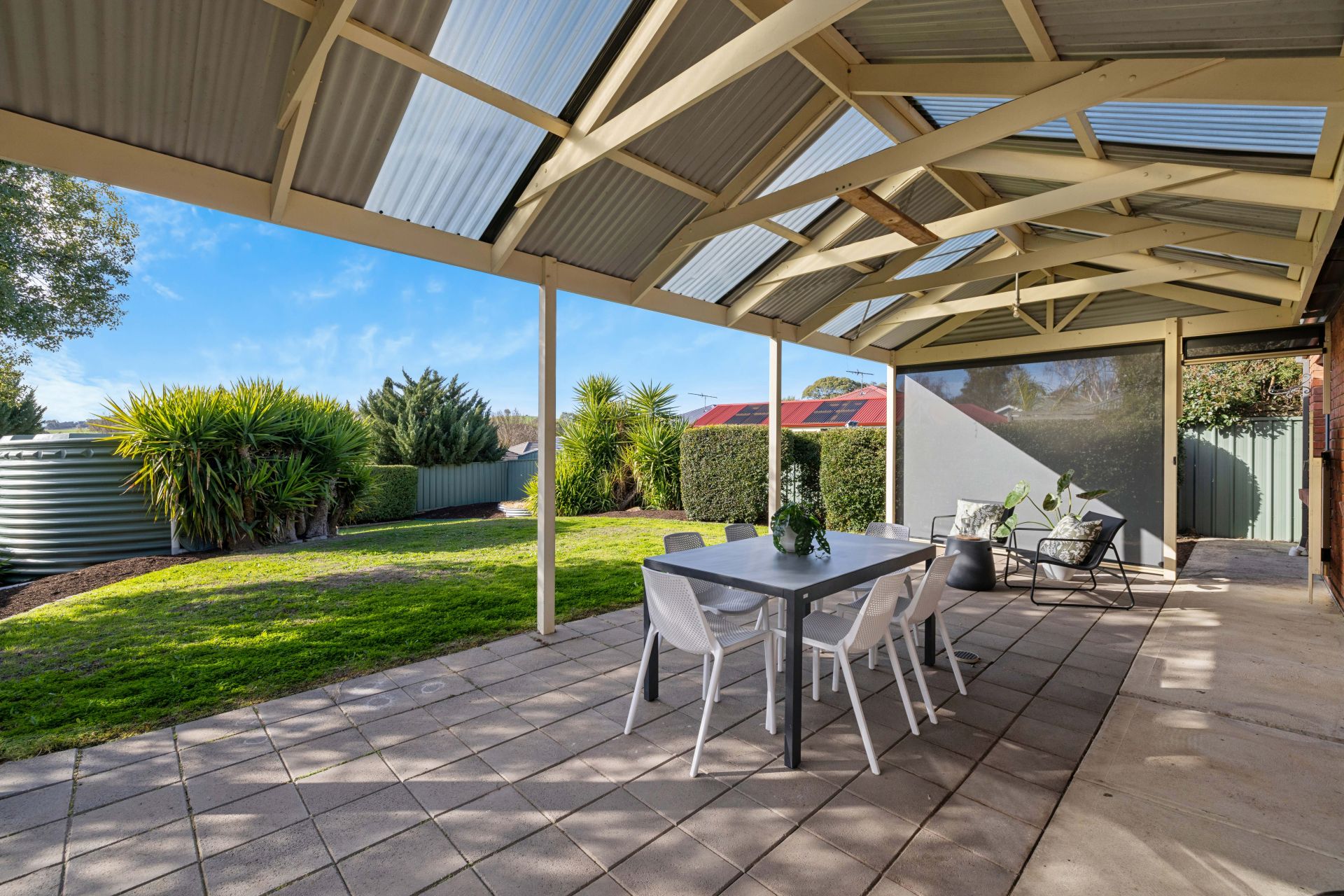 Outdoors, the gabled alfresco is bookended by café blinds, keeping the focus clear on the established and irrigated lawns – a garden canvas, raised planter beds, and a rural backdrop you'll never tire of.