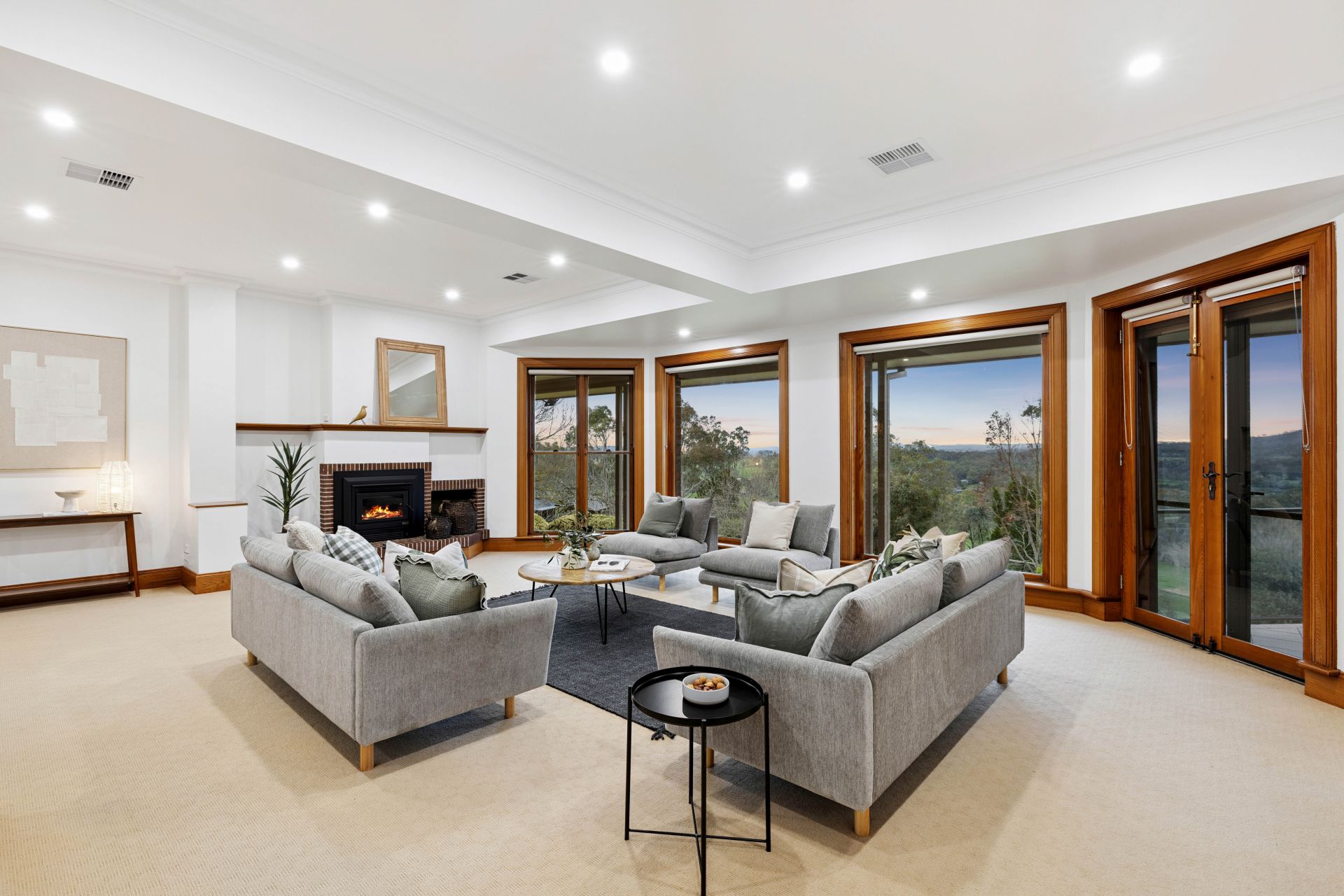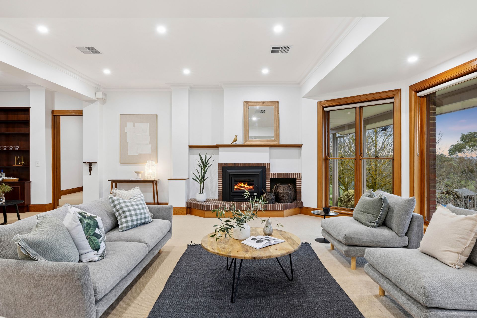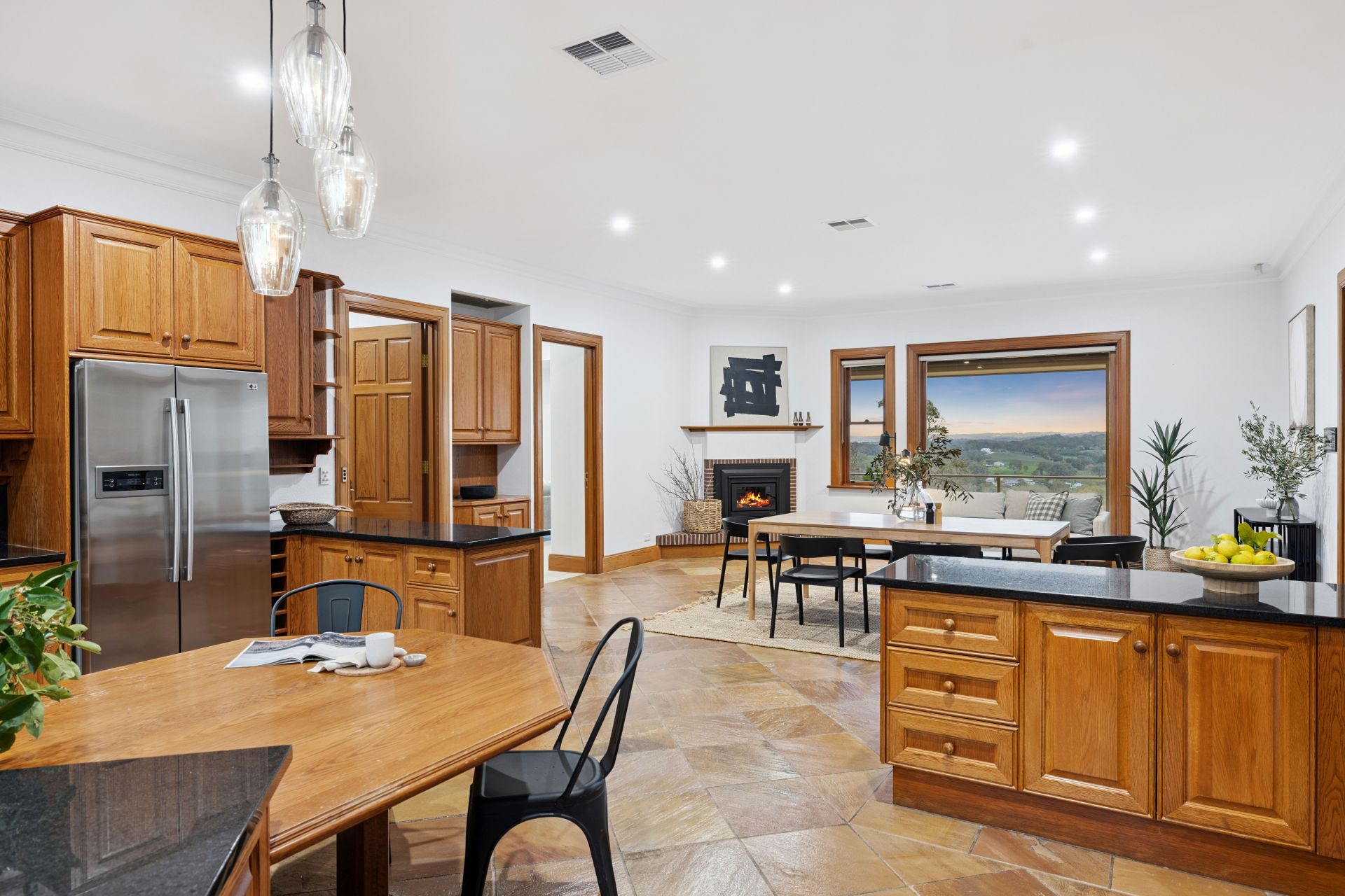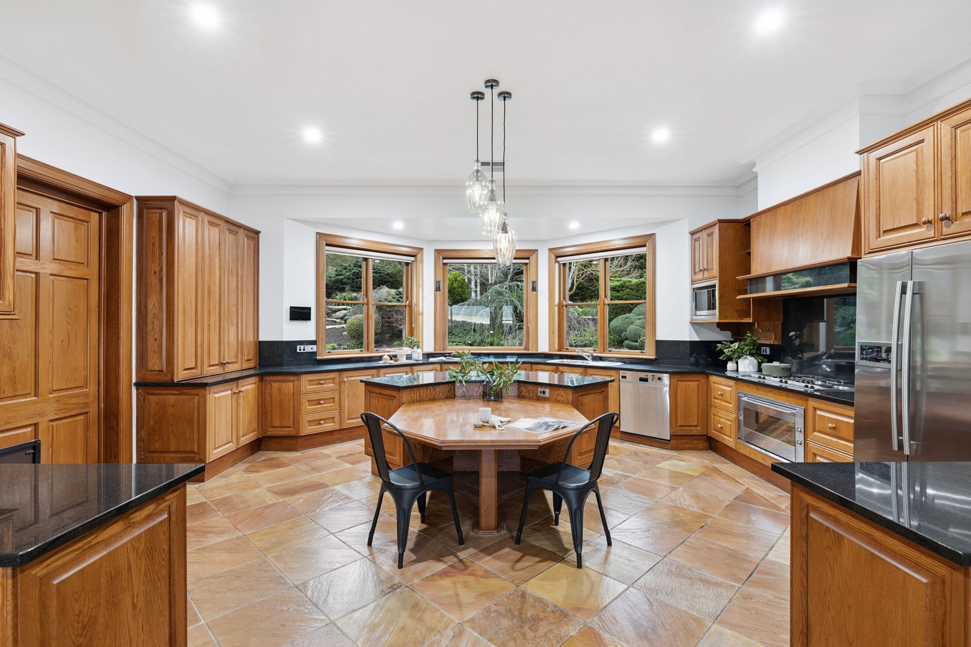 Featuring 3m ceilings, three flexible living zones – all with slow combustion fires – and a central family dining space, the timeless granite-topped timber kitchen anchors the home's heart with Miele and Smeg appliances, plus a central eat-in breakfast island.