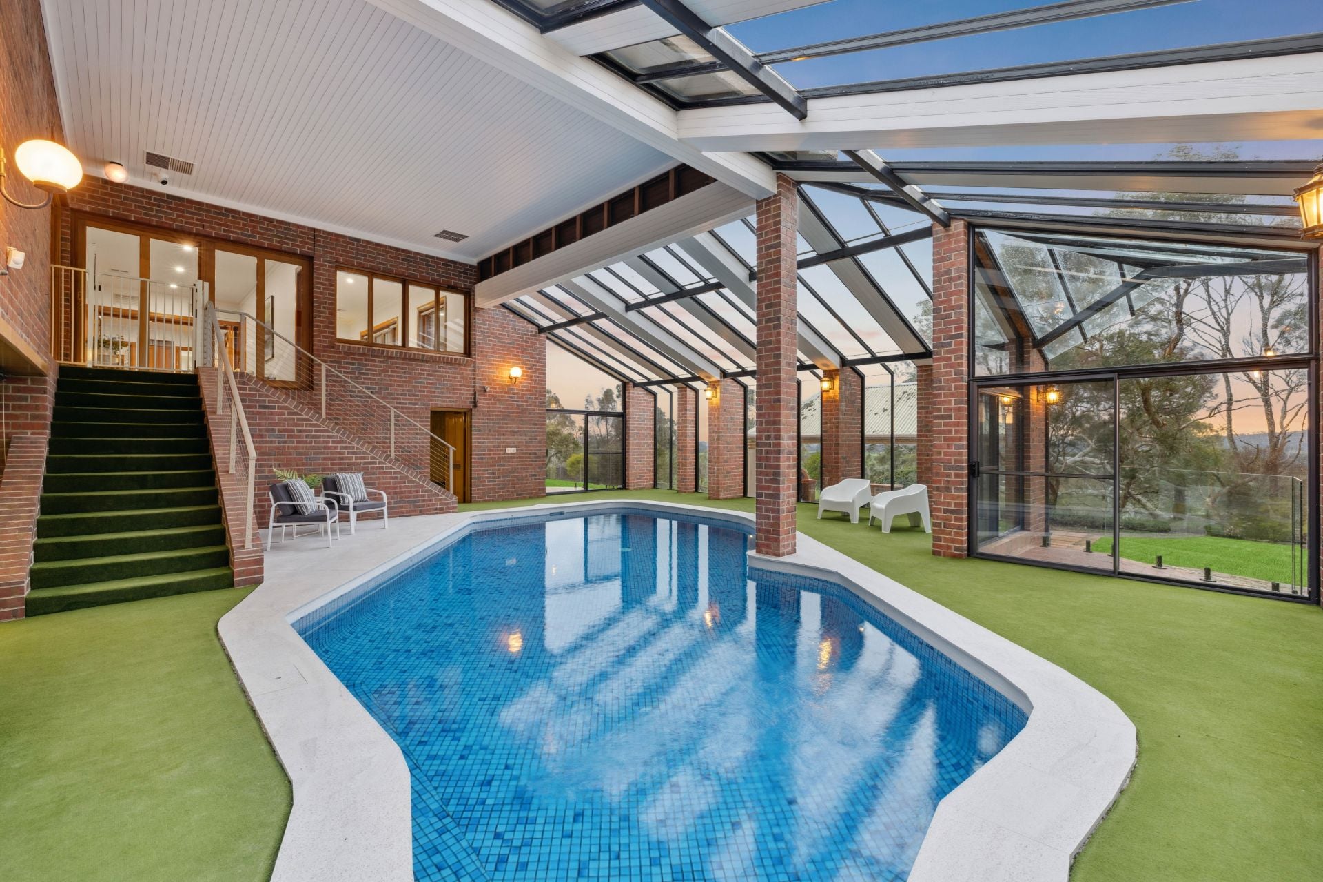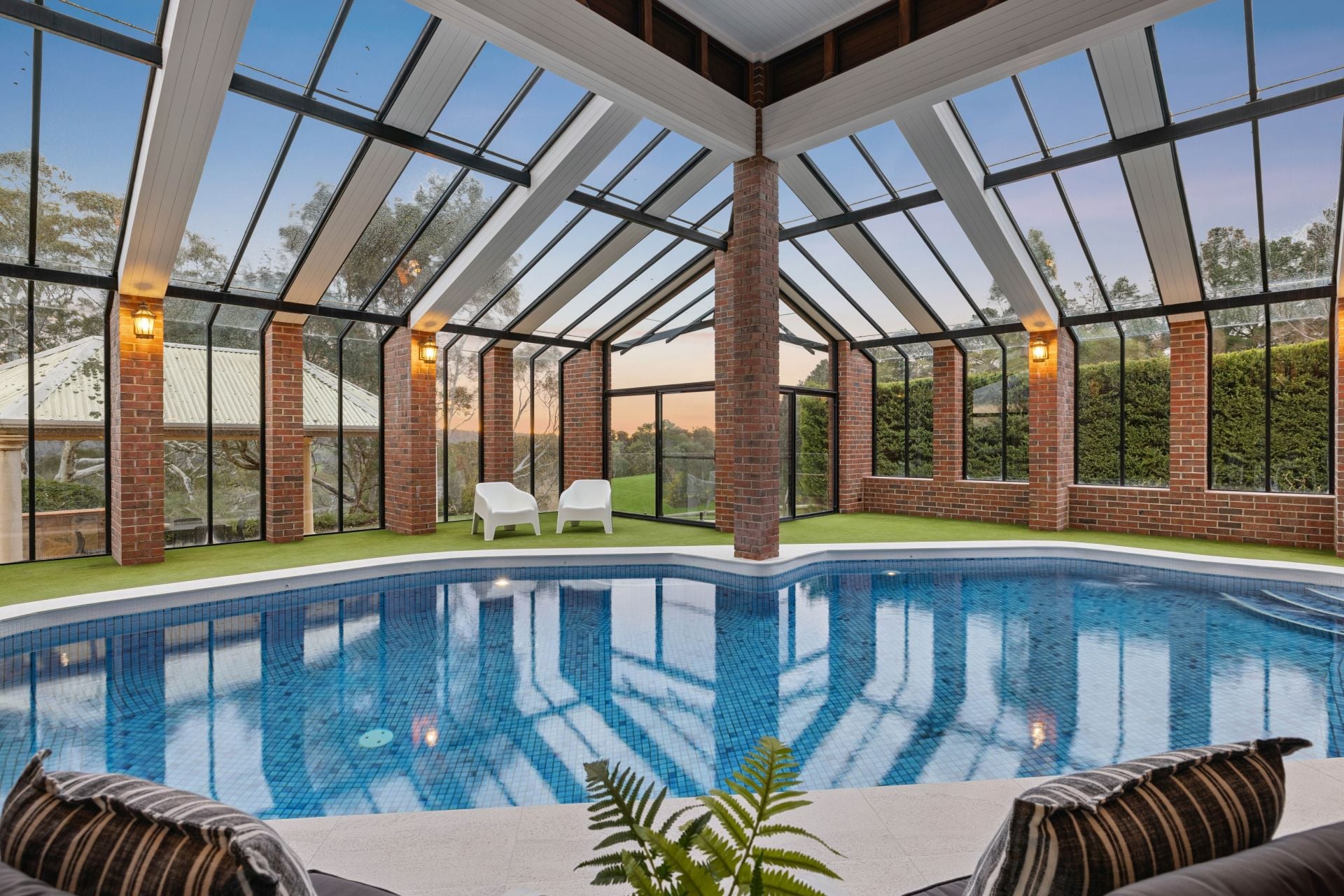 Soaring conservatory with a fully tiled indoor pool + ducted evaporative A/C