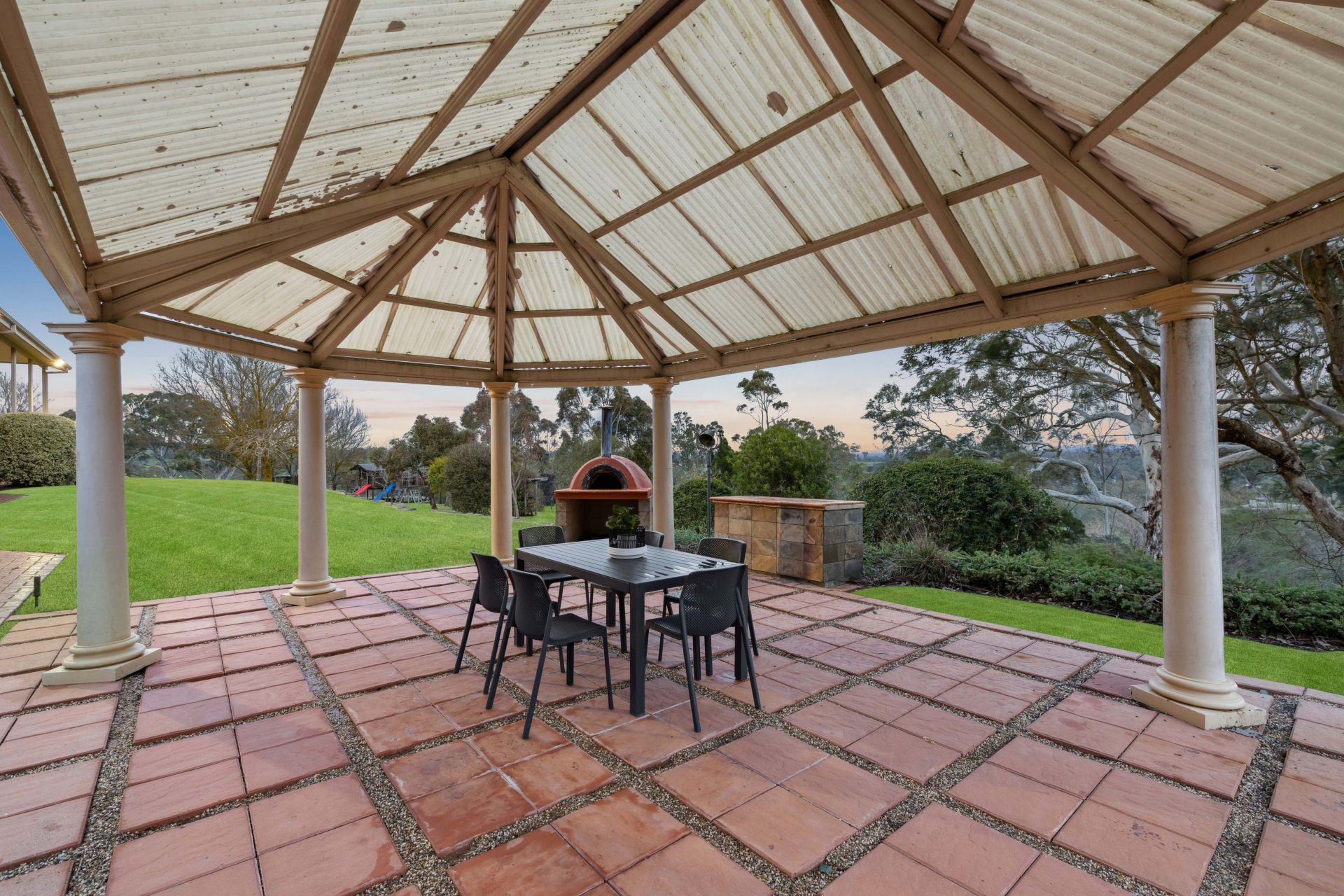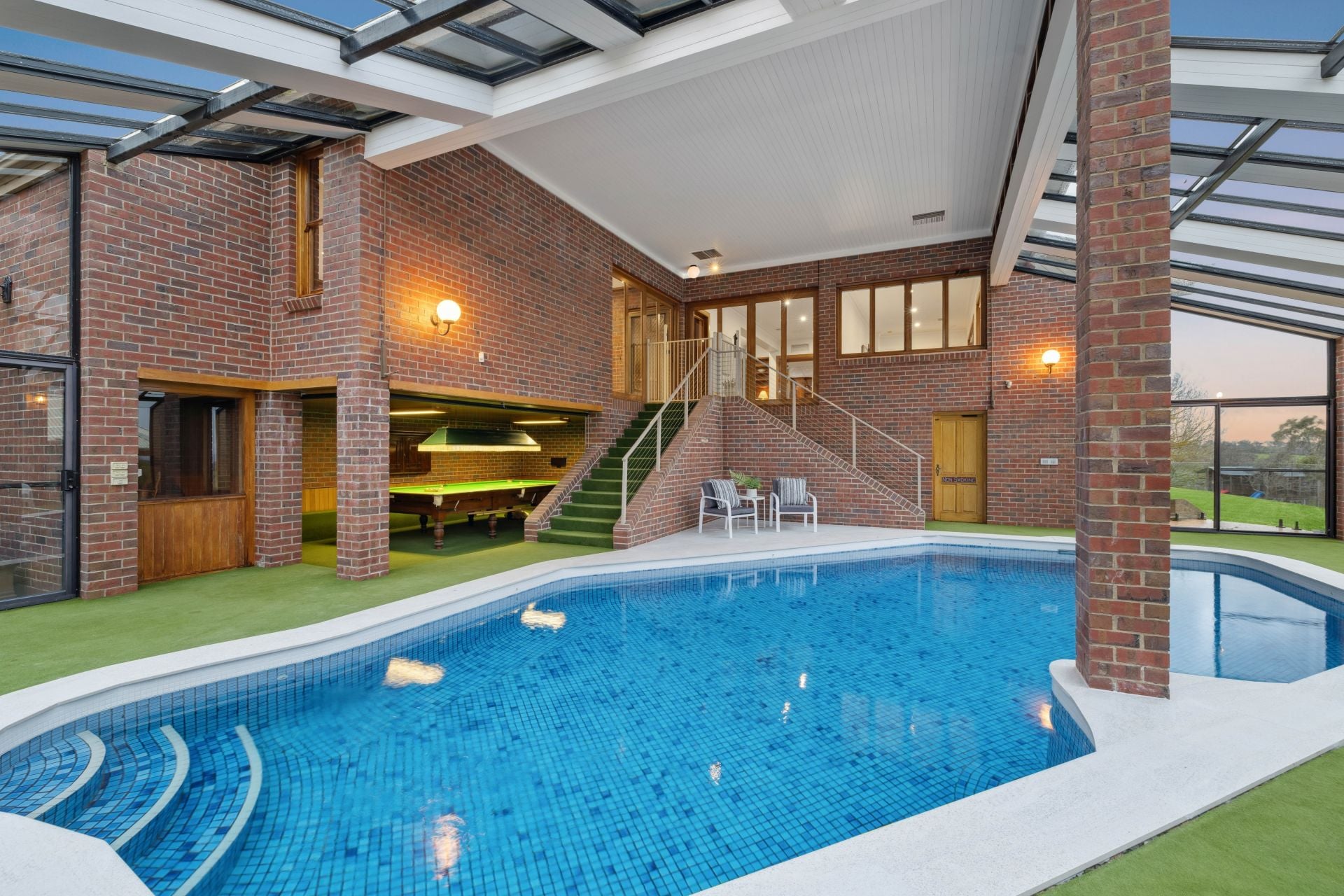 The double-height conservatory is evaporative air-conditioned for swimming comfort; beyond the glass, a semi-enclosable gazebo plates up whatever the adjacent wood-fire pizza oven is cooking.