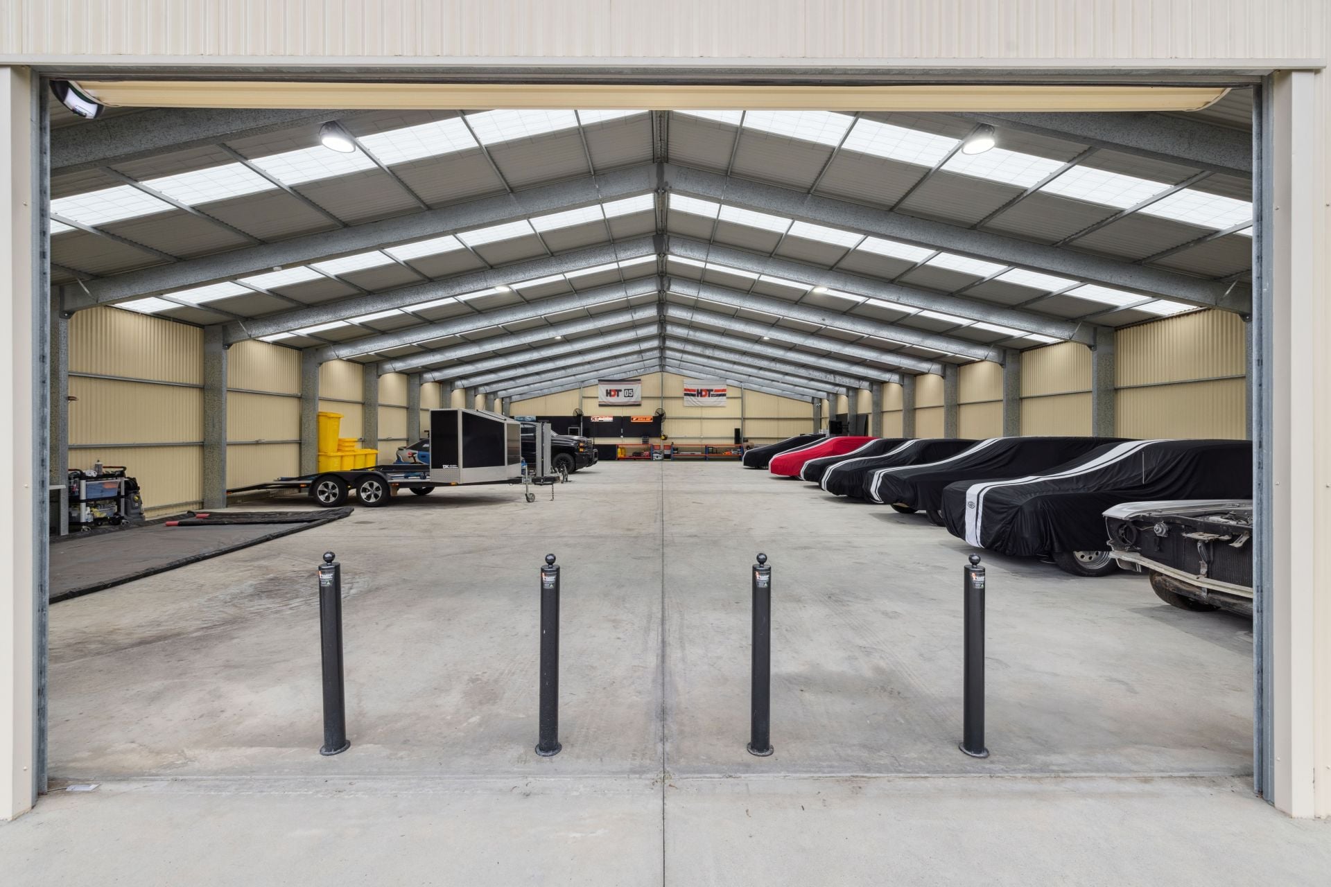 30m x 18m (approx.) shed with concrete floor, 3-phase power, 2.9m clearance, roller door security, removable bollards, alarm & multi-camera surveillance