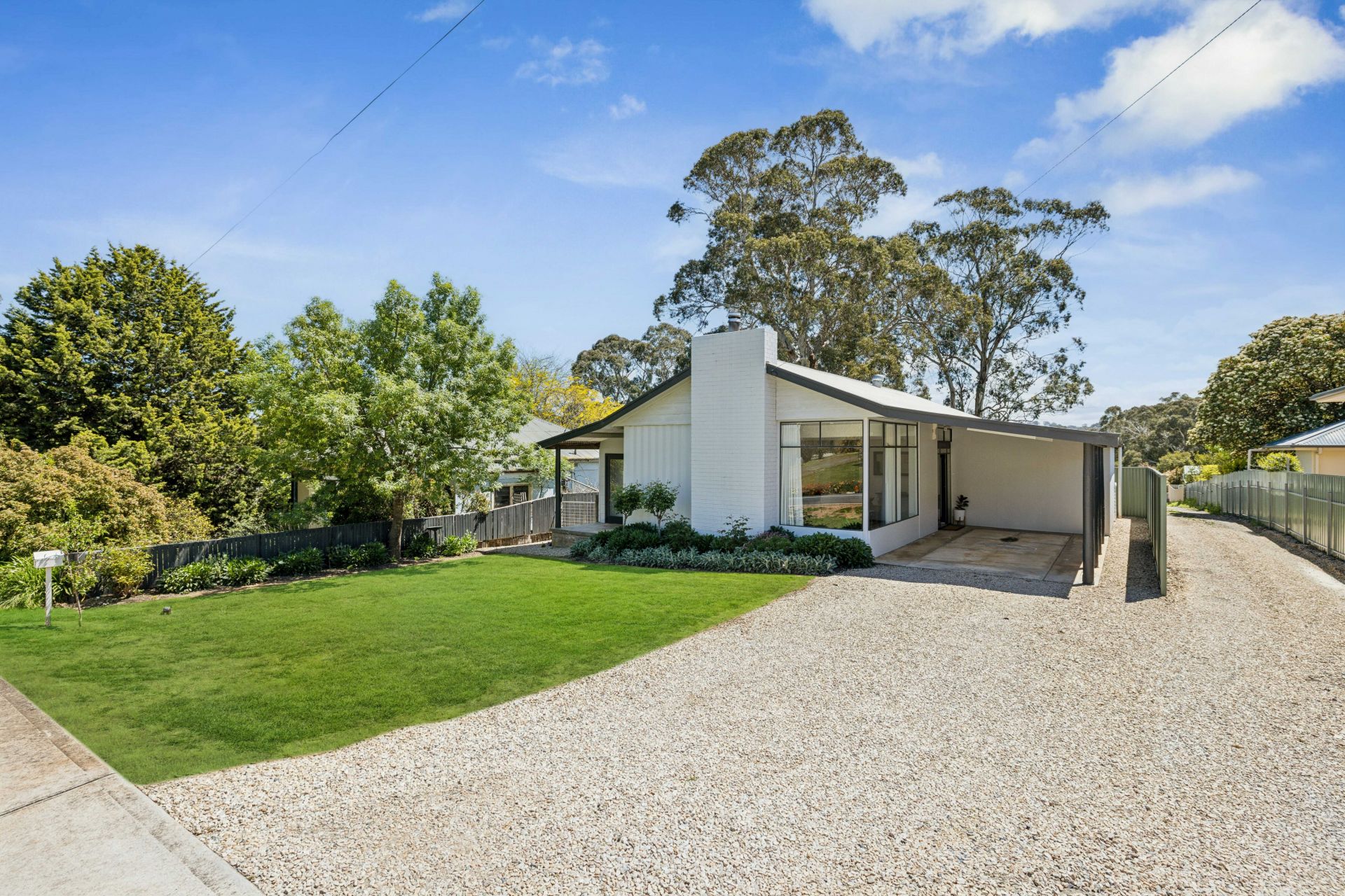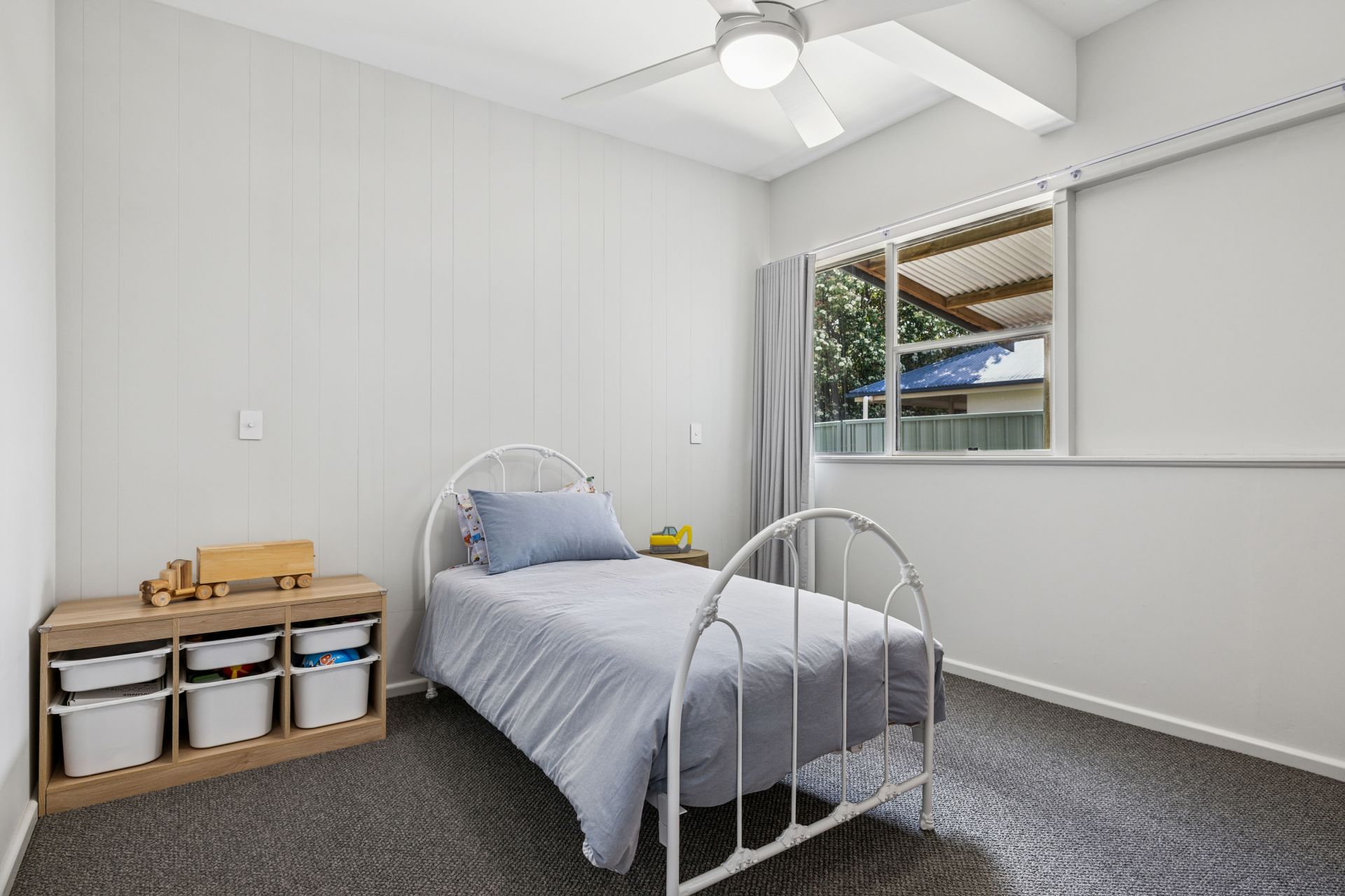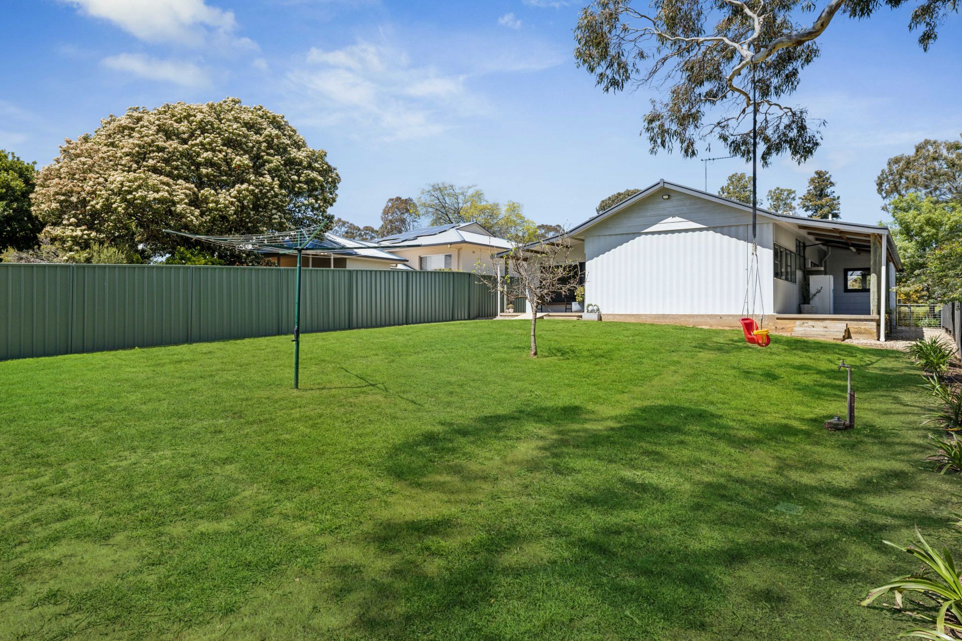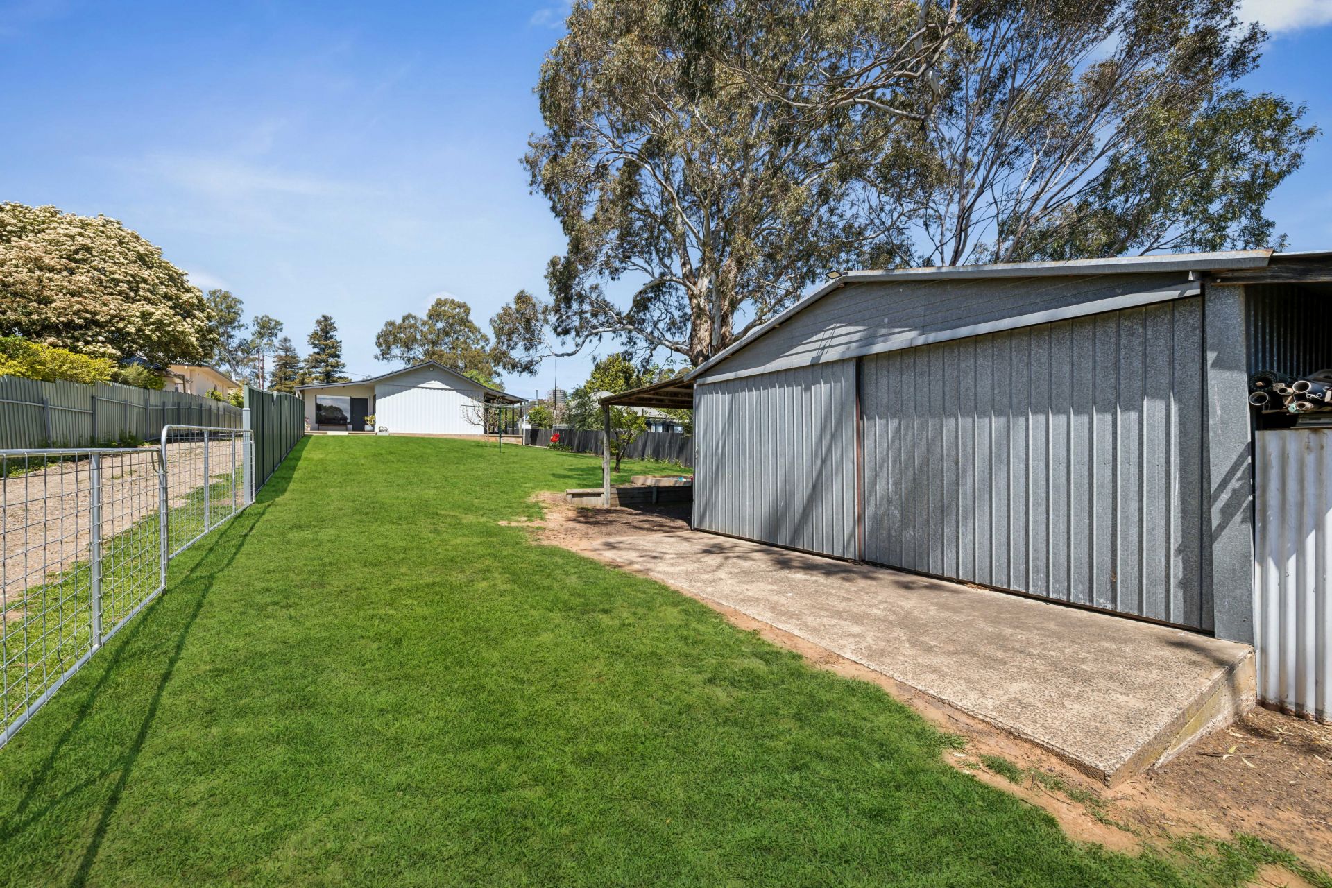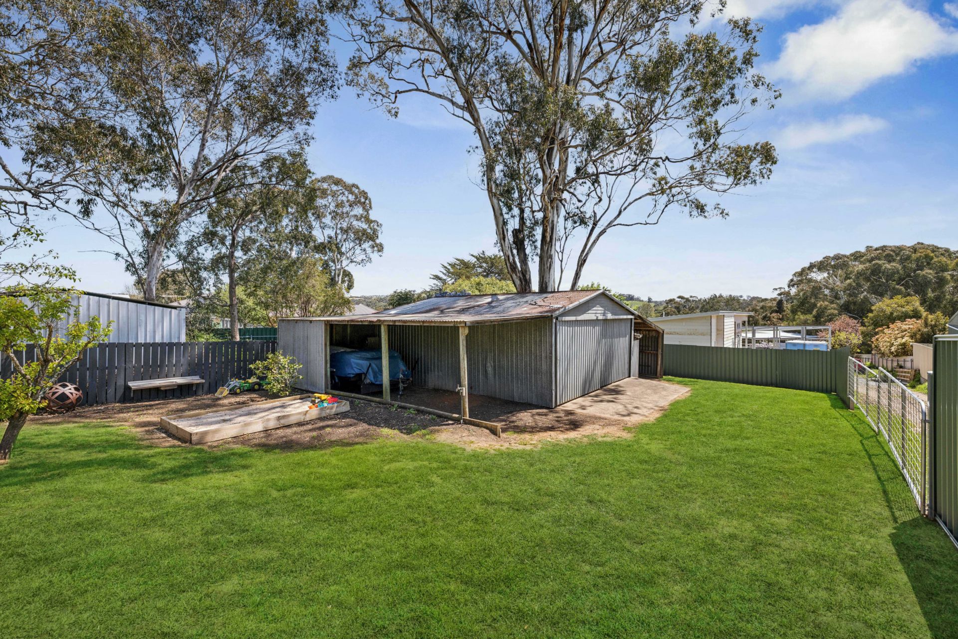 The fully fenced backyard could line up a pool, a trampoline, or swing set to complement the sandpit and detached iron garage, while double side gates swing wide for the boat, trailer or work van, and the annexed carport and lean-to add woodshed practicality.