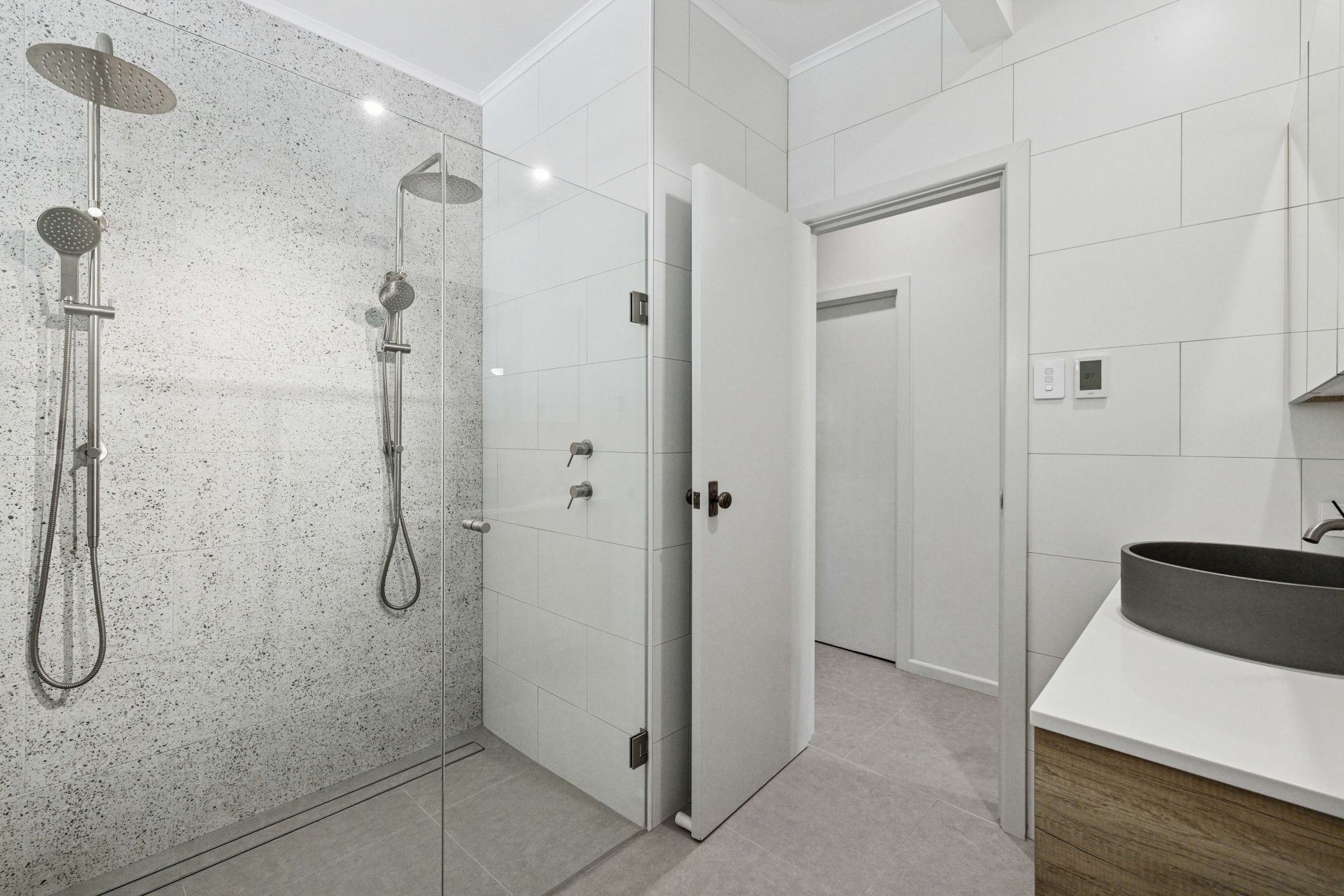 Chic fully tiled bathroom with twin shower heads & underfloor heating
