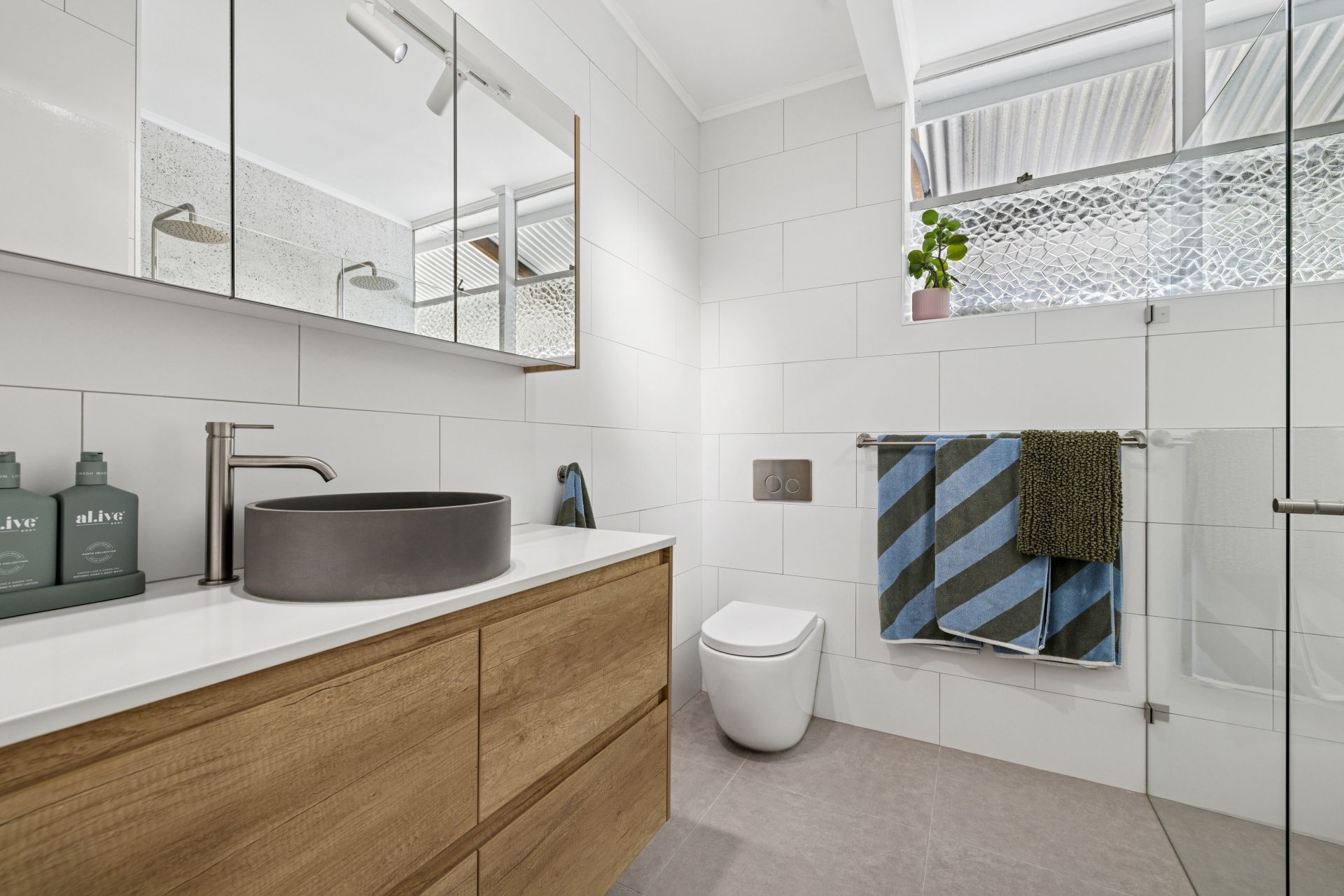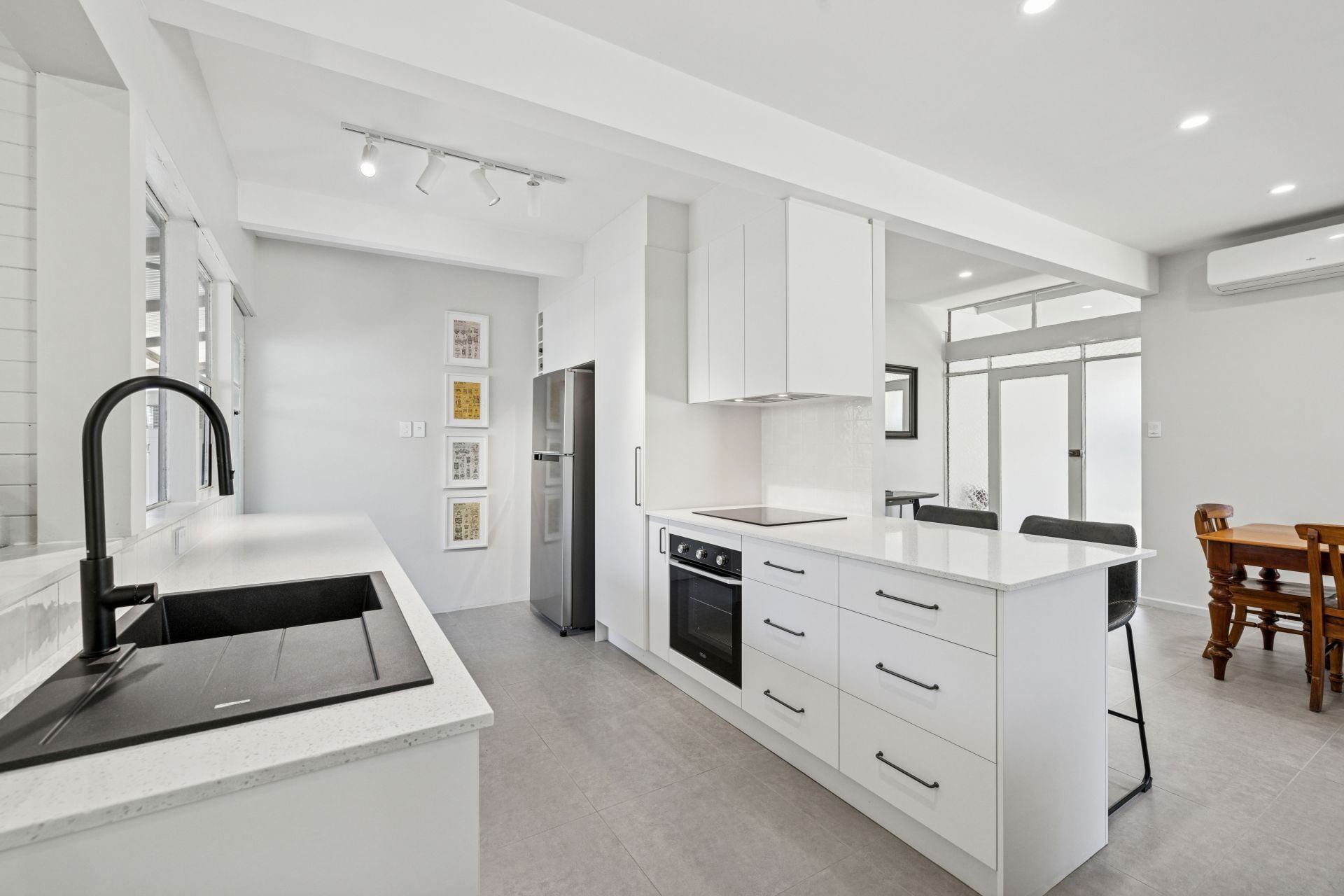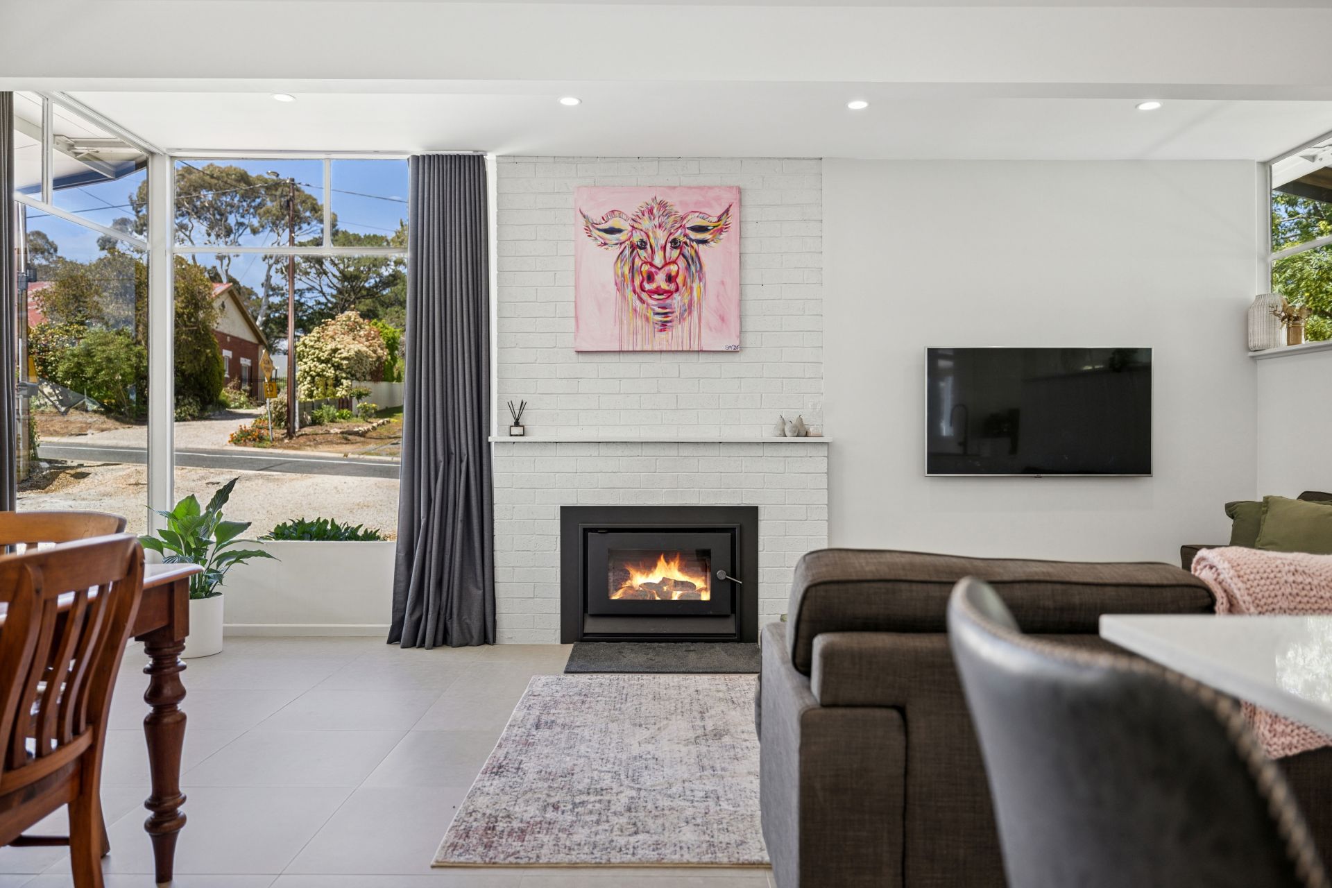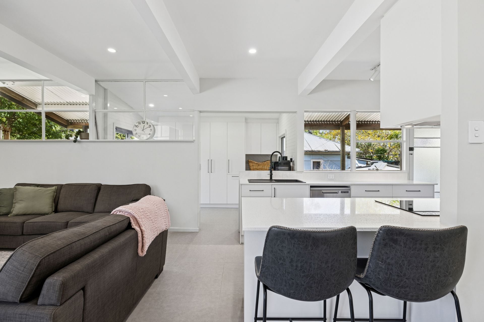 From its reimagined 1977 façade to its light-loving, white-on-grey interiors, this remodelled cottage is proof that starting small can still be sensational. The result: durable floor tiles, exposed rafters, and full-length corner panes flooding the open plan living zone with natural light - perfectly showcasing the home's easy modern flow.