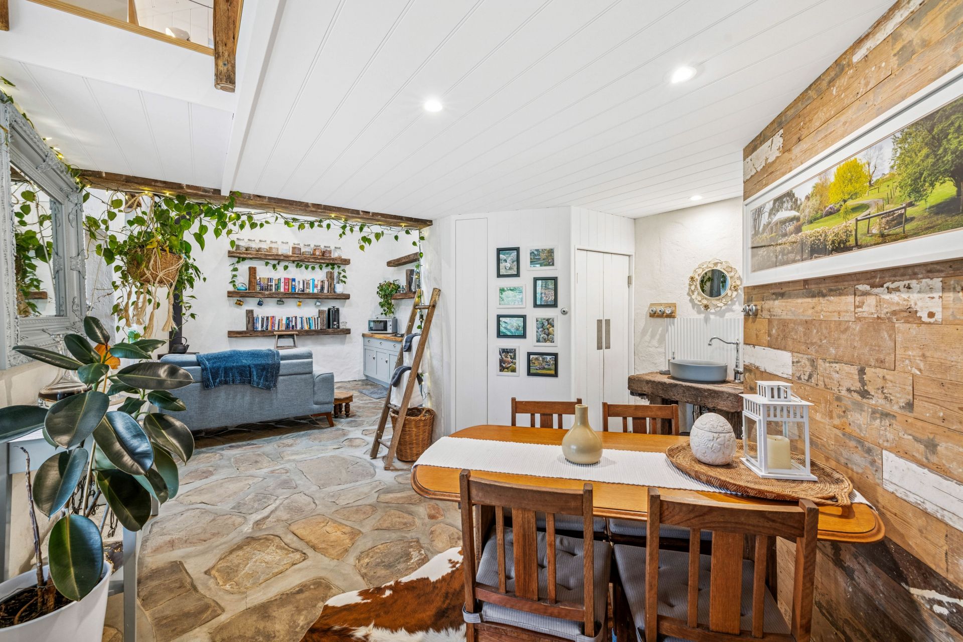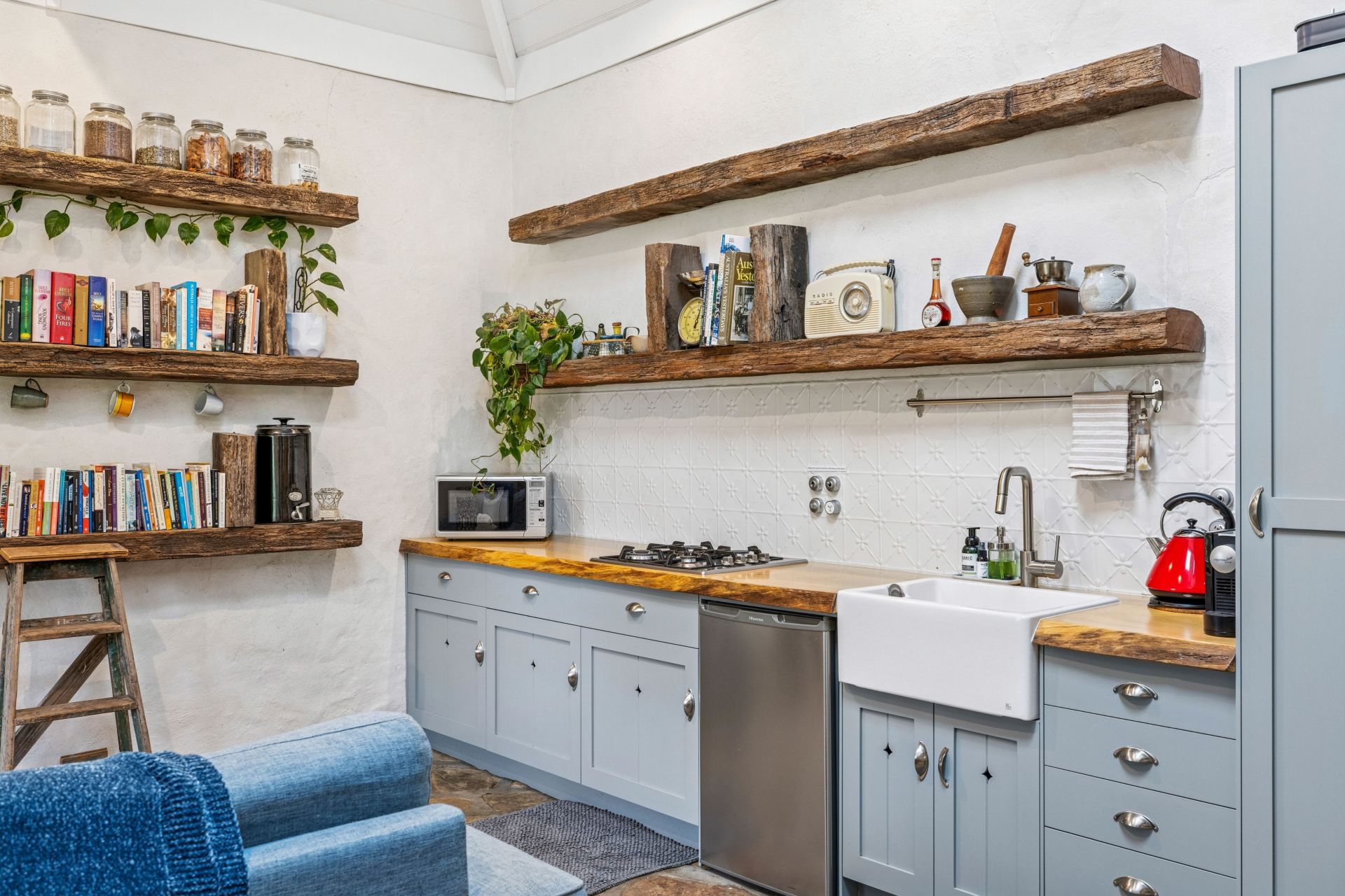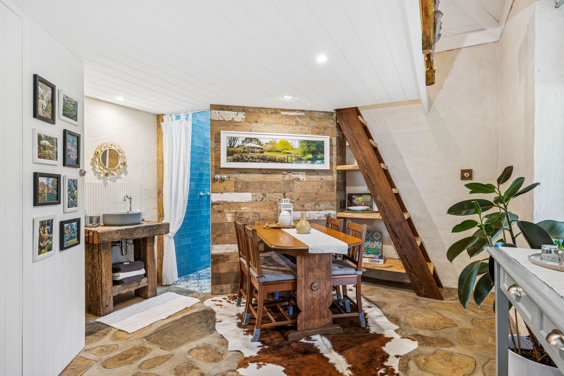 The fully restored second cottage charms with French provincial chic and more quirk – think 'Tiny Home' and you'll get the gist. From the quality kitchen, bound by solid Poplar timber benchtops, a 600mm gas cooktop and a pull-out pantry, to the sky-high rain shower, bathed in turquoise tiles that is the day's end dream.