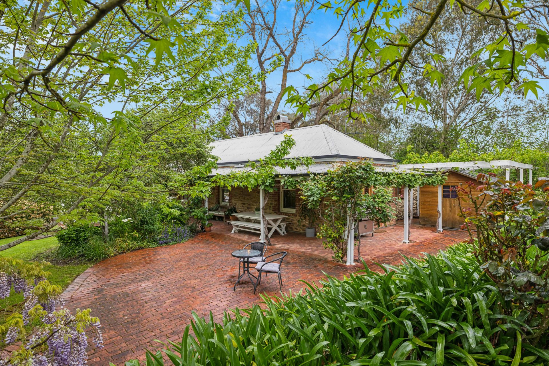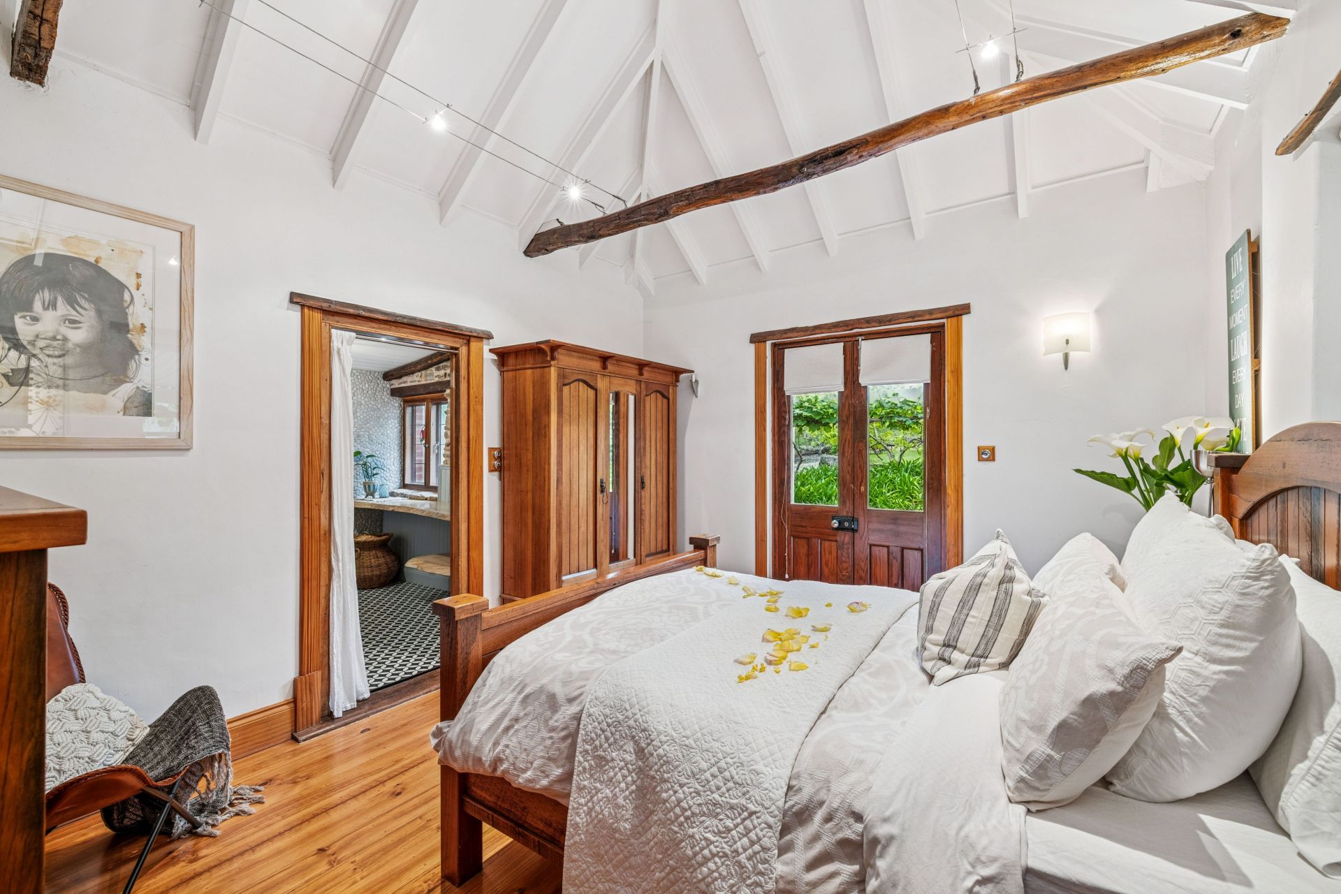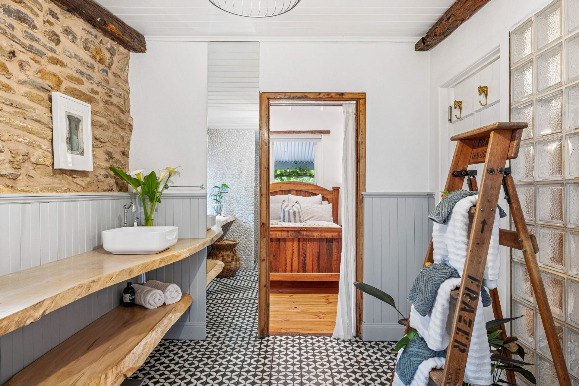 The fully restored second cottage charms with French provincial chic and more quirk – think 'Tiny Home' and you'll get the gist. From the quality kitchen, bound by solid Poplar timber benchtops, a 600mm gas cooktop and a pull-out pantry, to the sky-high rain shower, bathed in turquoise tiles that is the day's end dream.