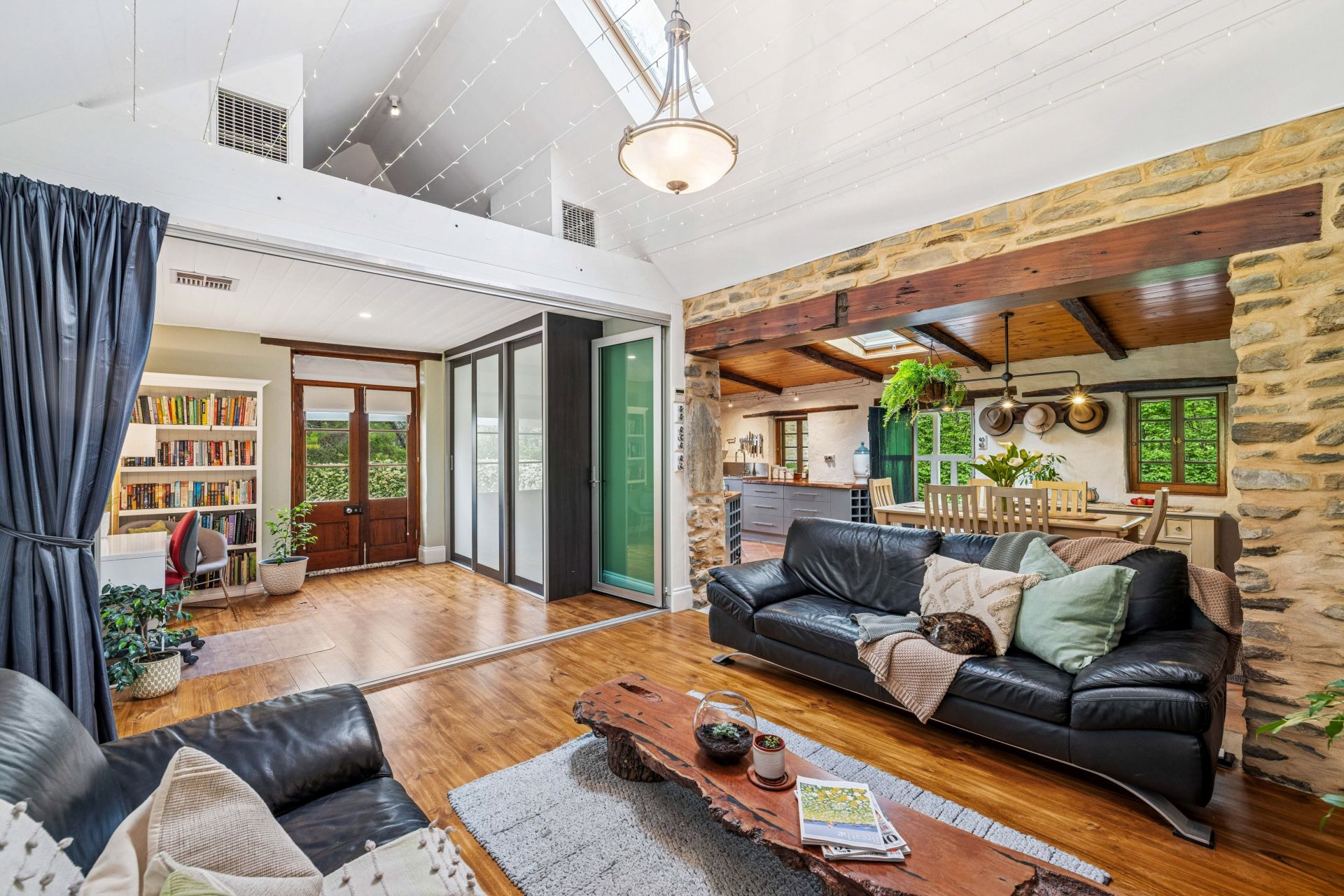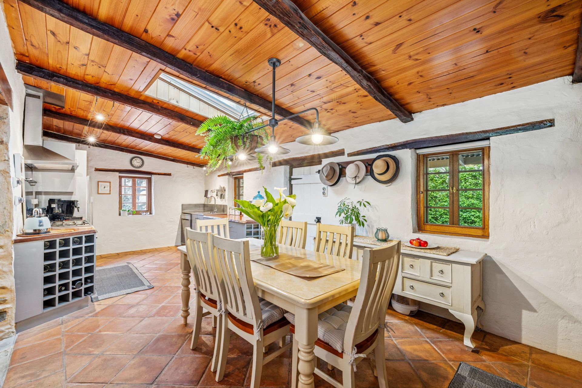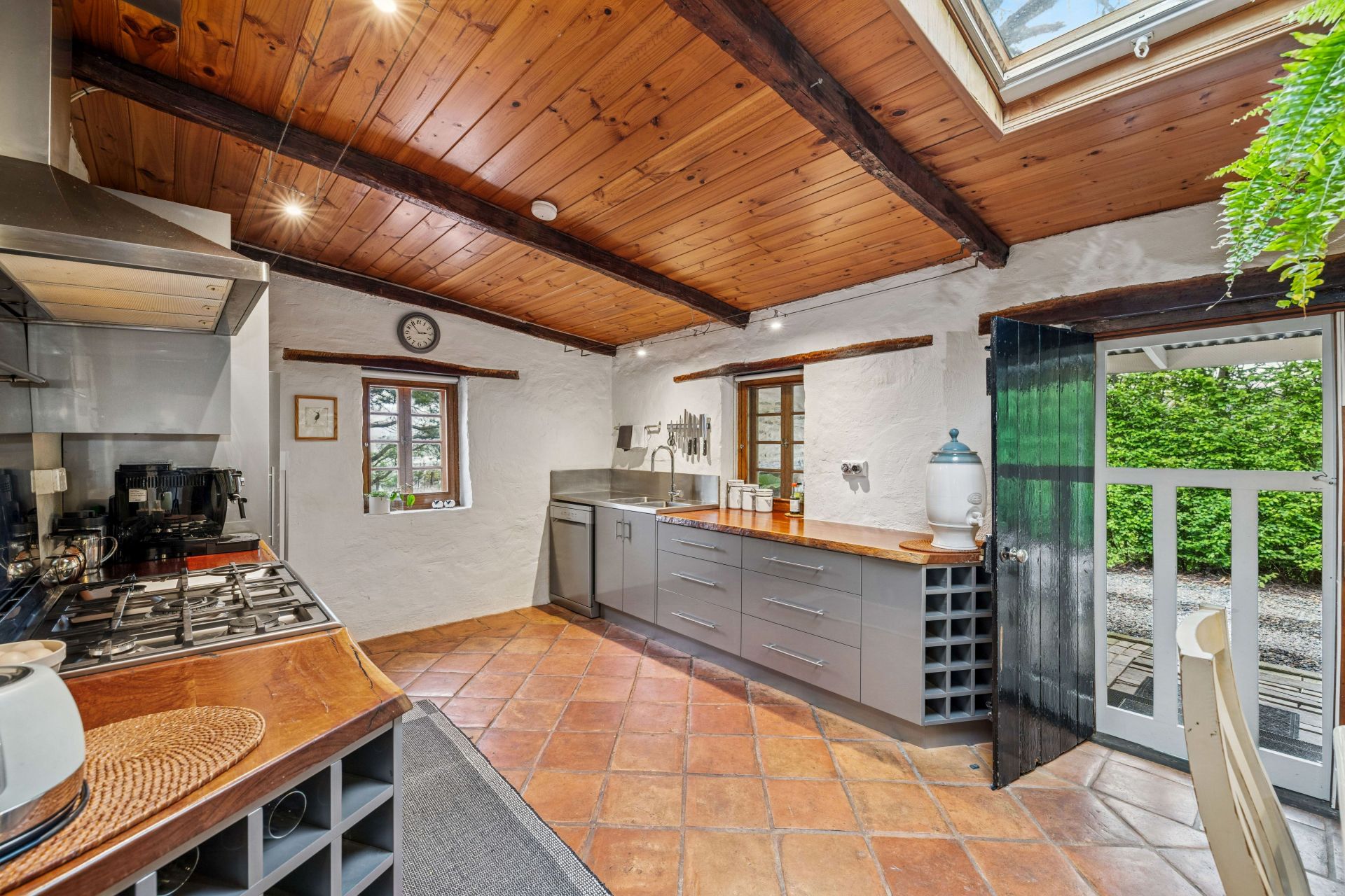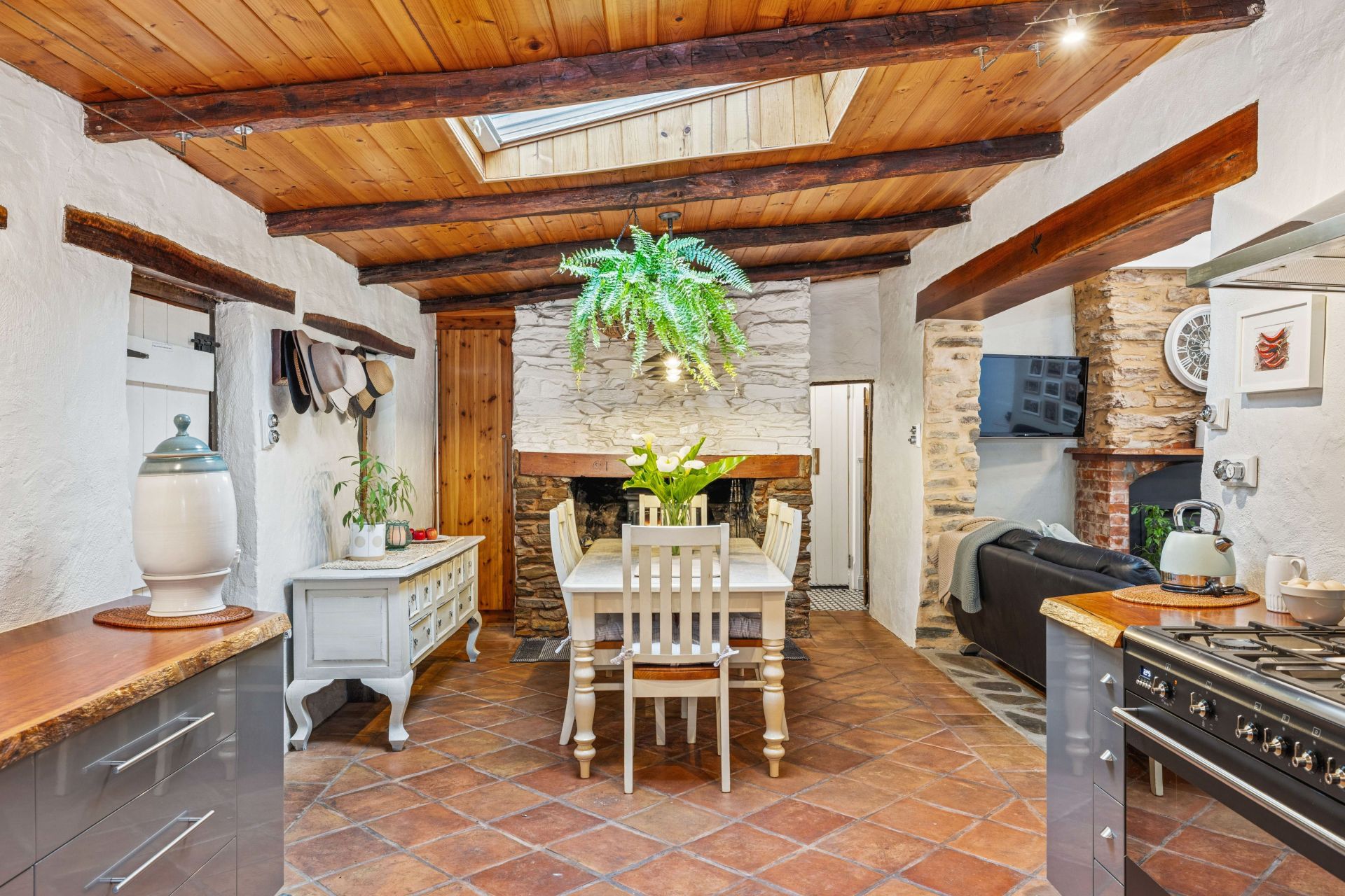 The main cottage opens to lofty beams, Italian terracotta, timber and stone floors, and a bi-folding glass wall that divides the open plan living area and kitchen from the second bedroom.