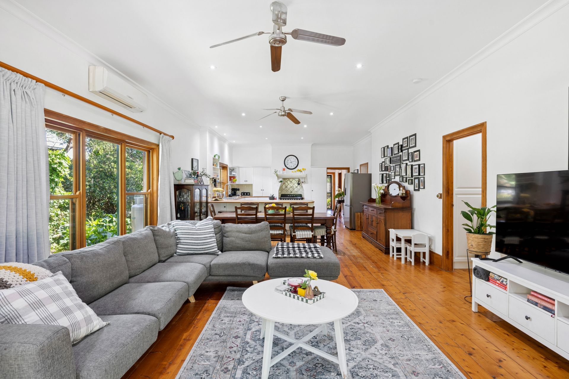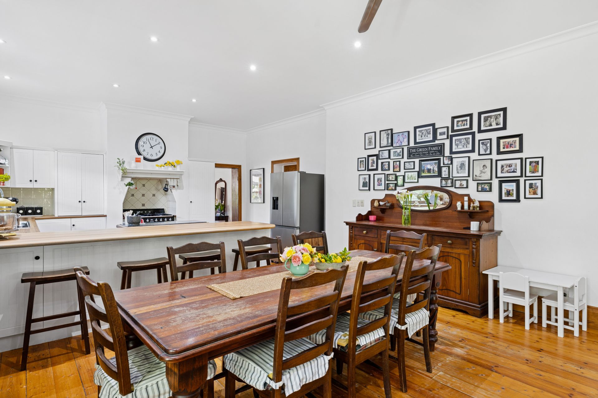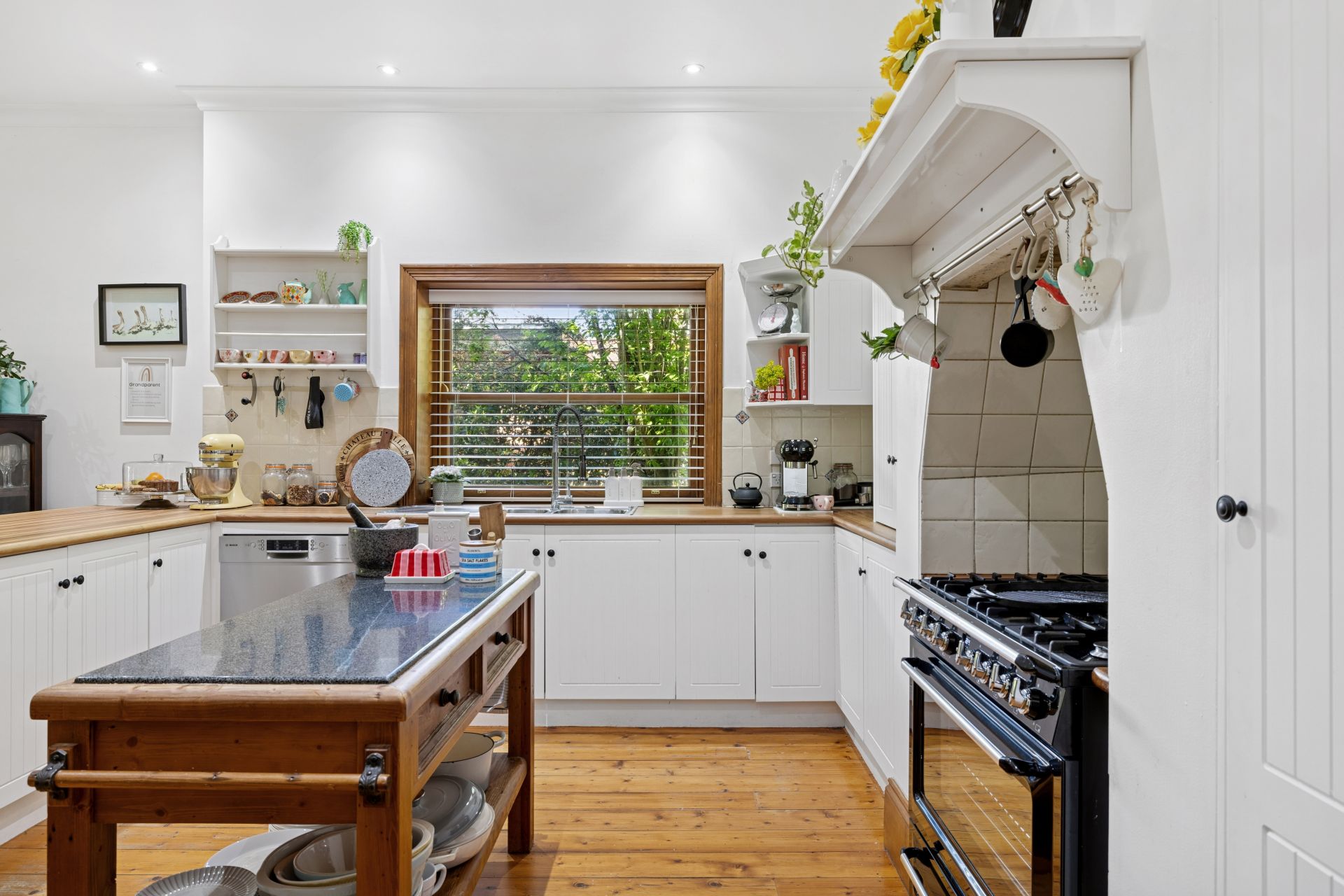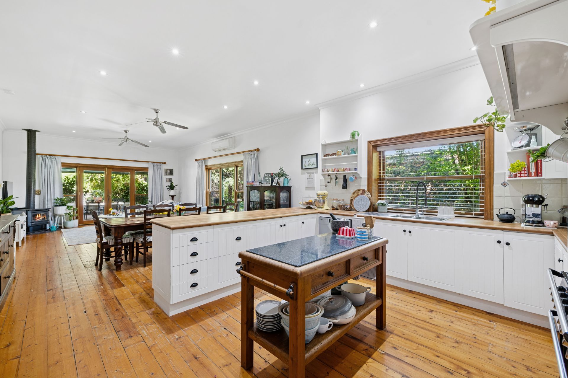 Absolutely owning the home's heart is the open plan shaker-style kitchen, anchored by the chef's delight; a feature Smeg cooker, against modern accompaniments including a Bosch dishwasher, dual sinks, and sweeping timber benchtops.