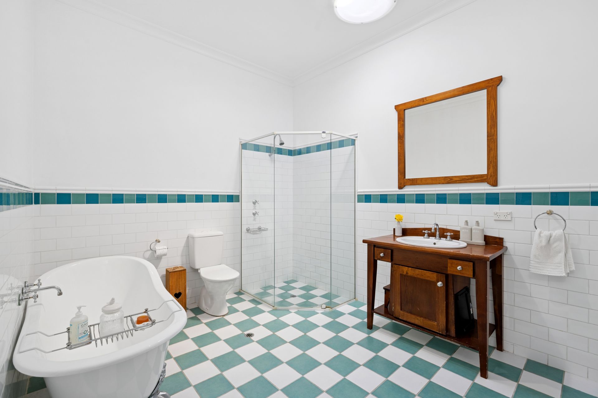 Graced with a heritage feel and modern appointments, the checkerboard family bathroom features a rolltop bath and WC, against a functional laundry room offering a second WC.