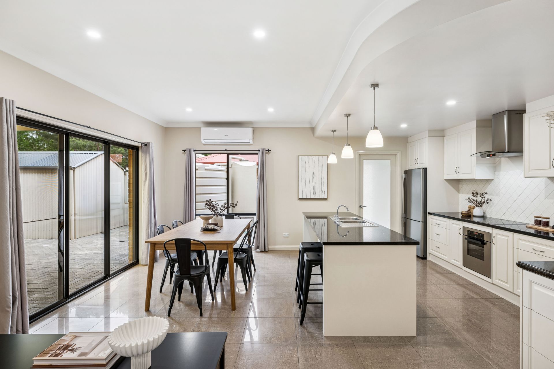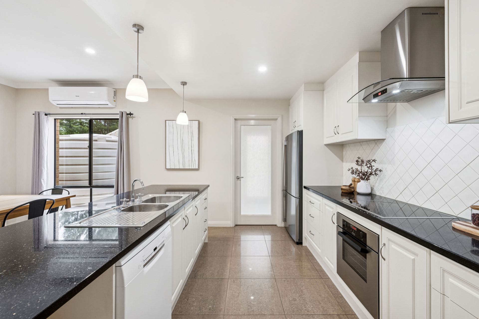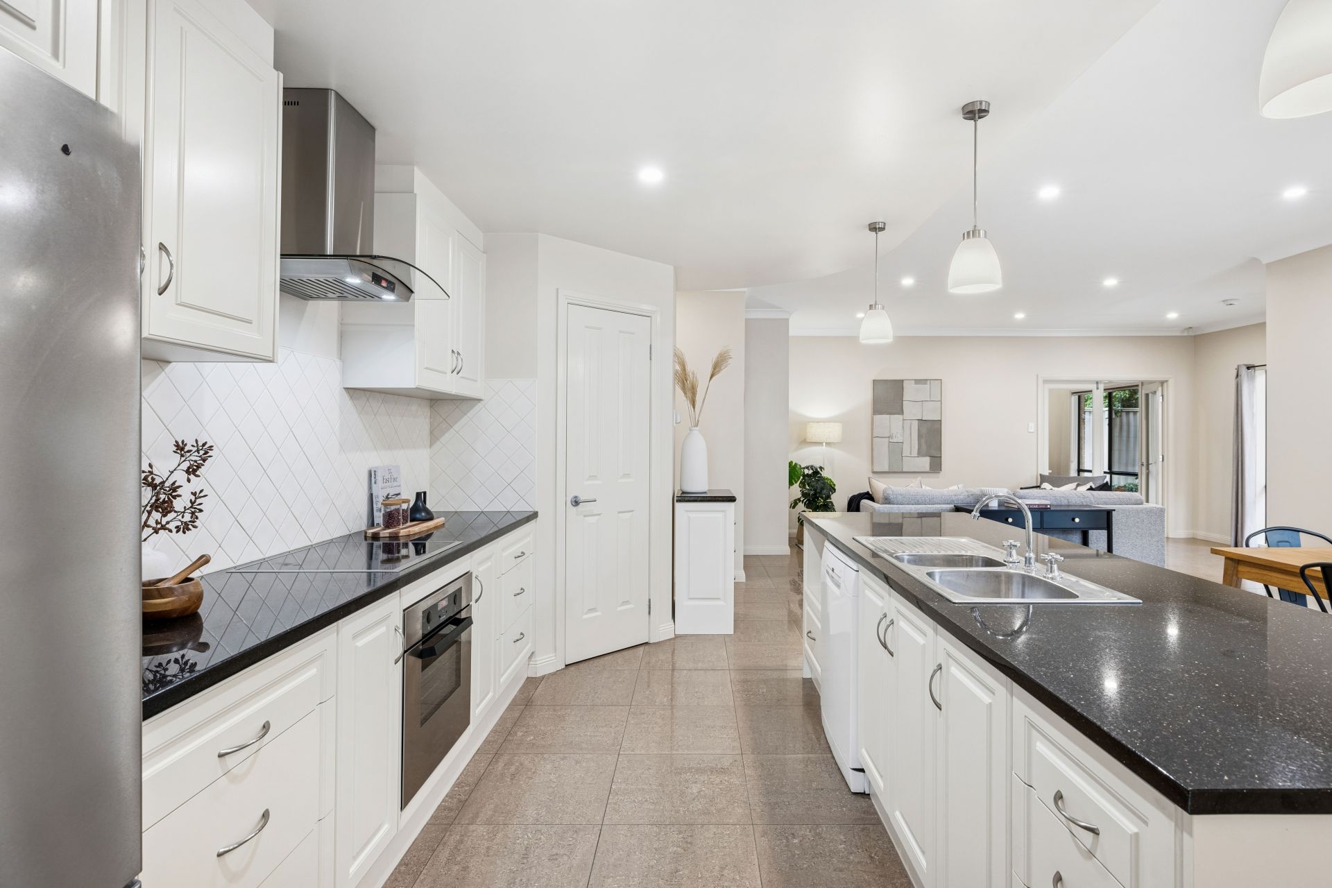 The entertainer's kitchen boasts all-electric appliances, induction cooktop, near new Bosch dishwasher, diamond-tiled splashbacks, and a timeless monochrome palette.
