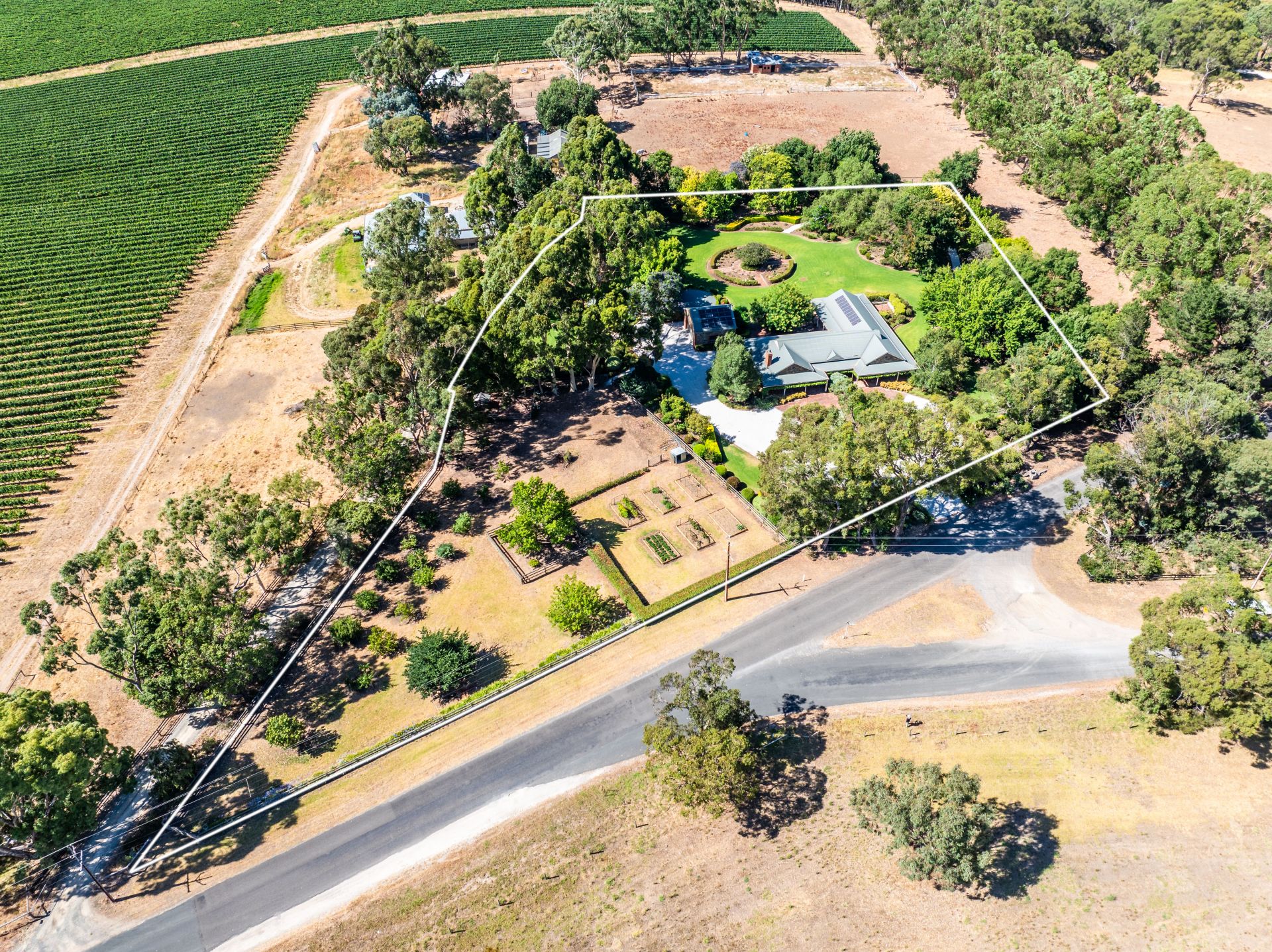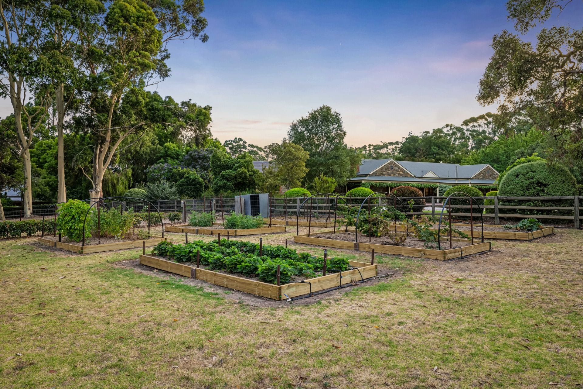 Beyond the circular driveway, sustainability comes courtesy of a bore, 30-panel solar system, prolific orchard, chicken coop, and fastidiously zoned, irrigated veggie beds. In support – a detached double garage (with panels above), and versatile utility shedding.