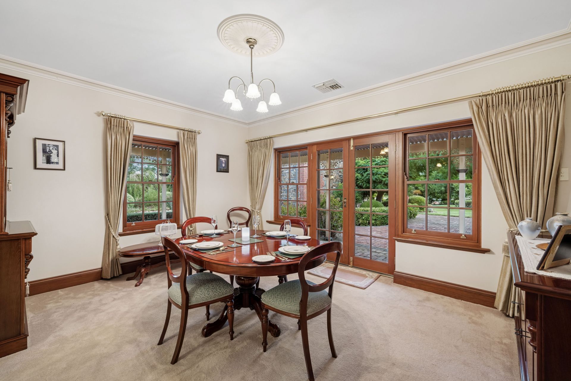 Formal dining zone with phantom screens and French doors