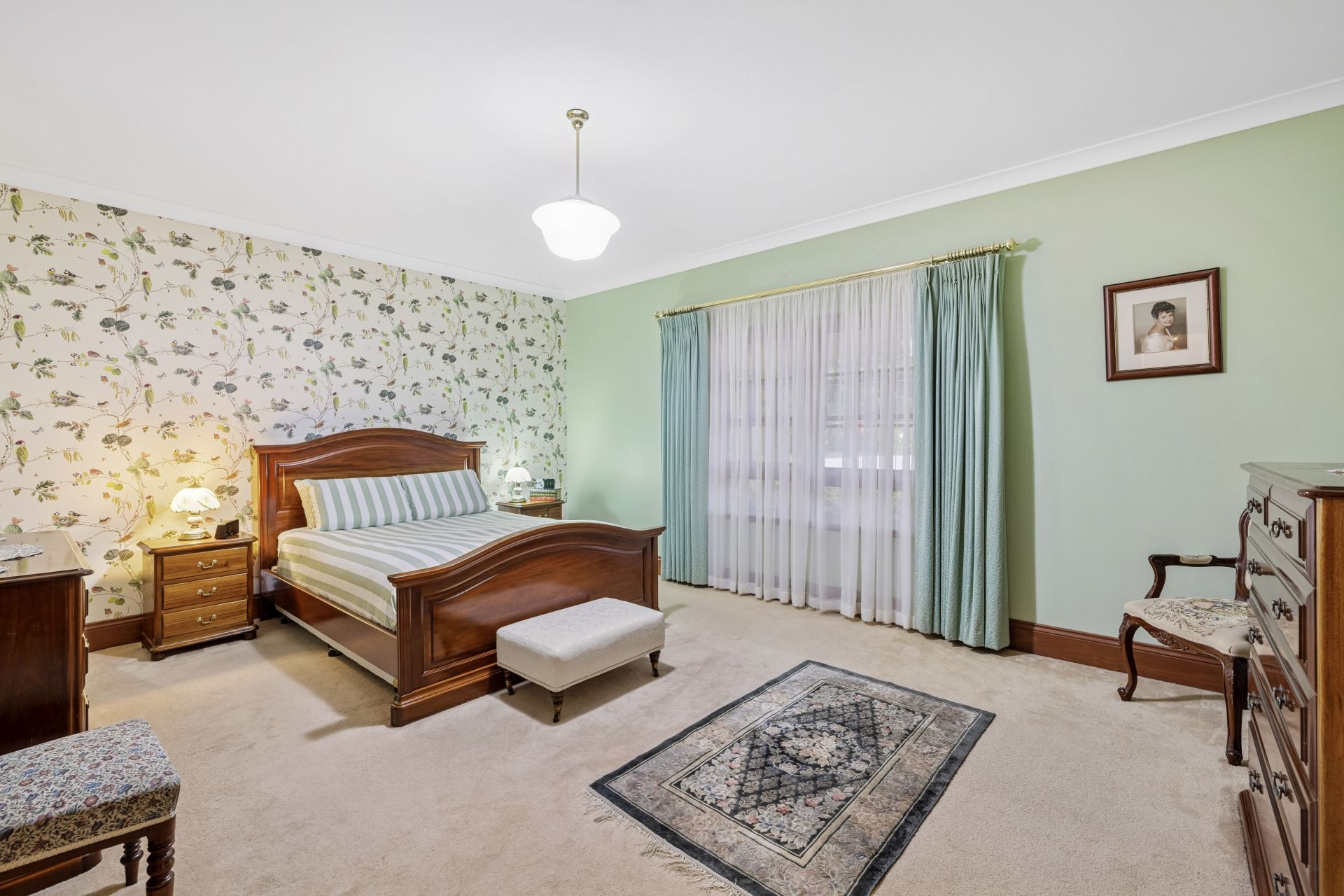 Leading the bedroom wing, a moss-green master suite delivers palatial proportions, a walk-in robe, and an ensuite inspired by antique charm; the family bathroom brings a heritage-style theme, with a spa.