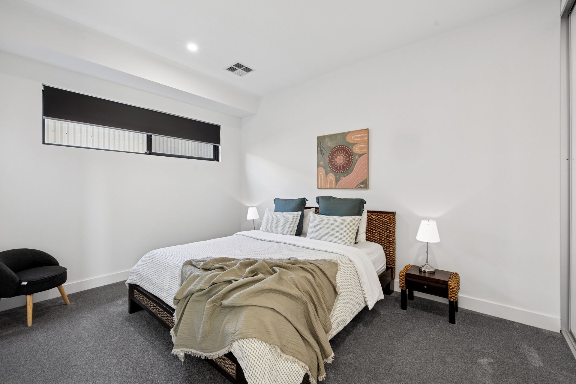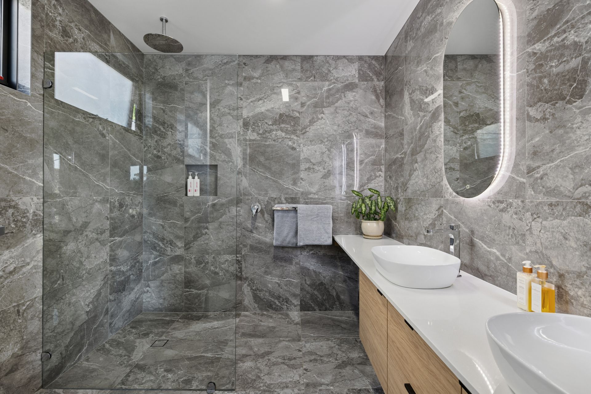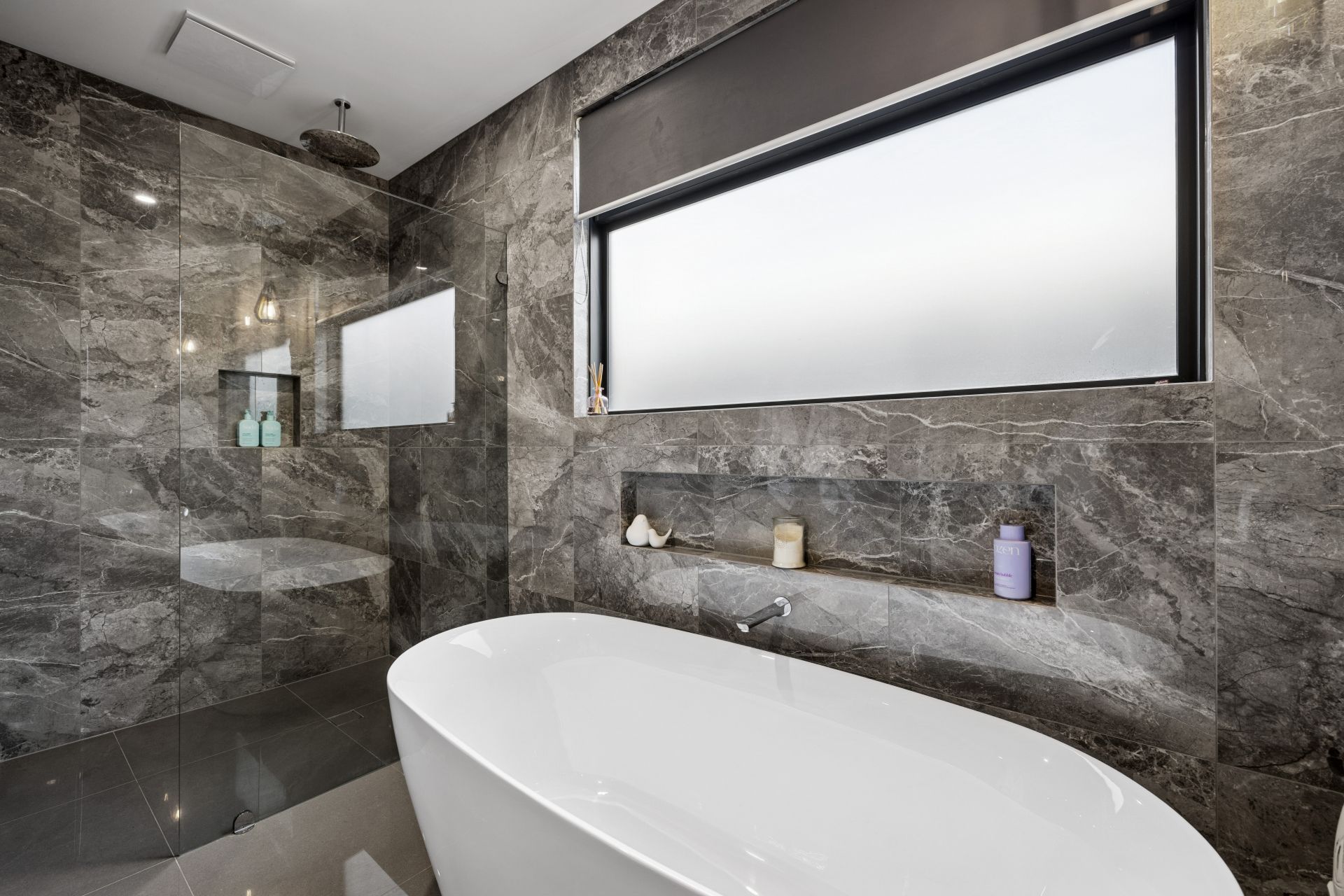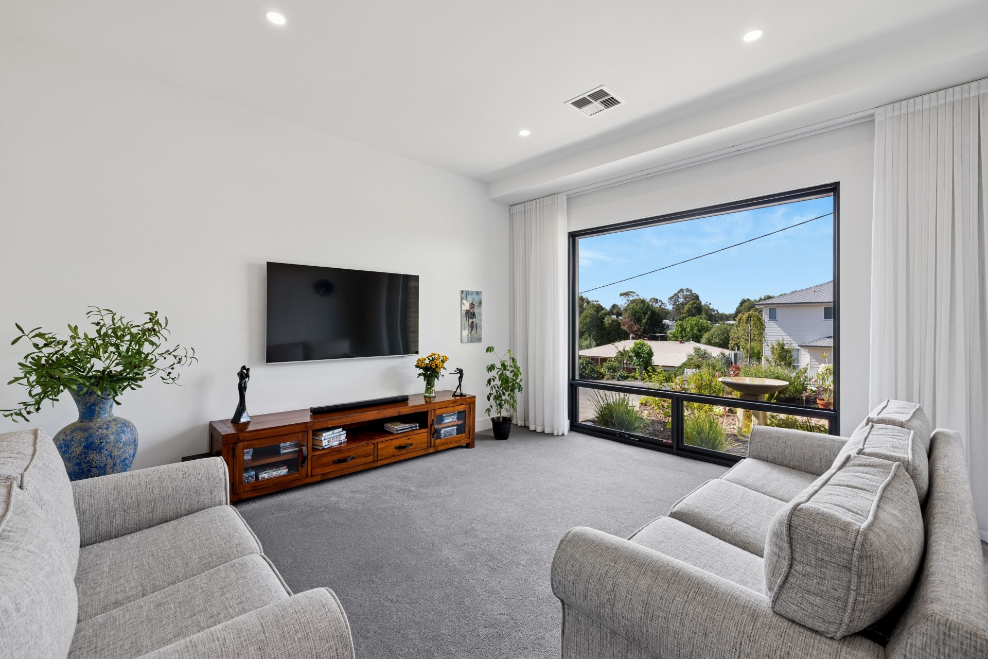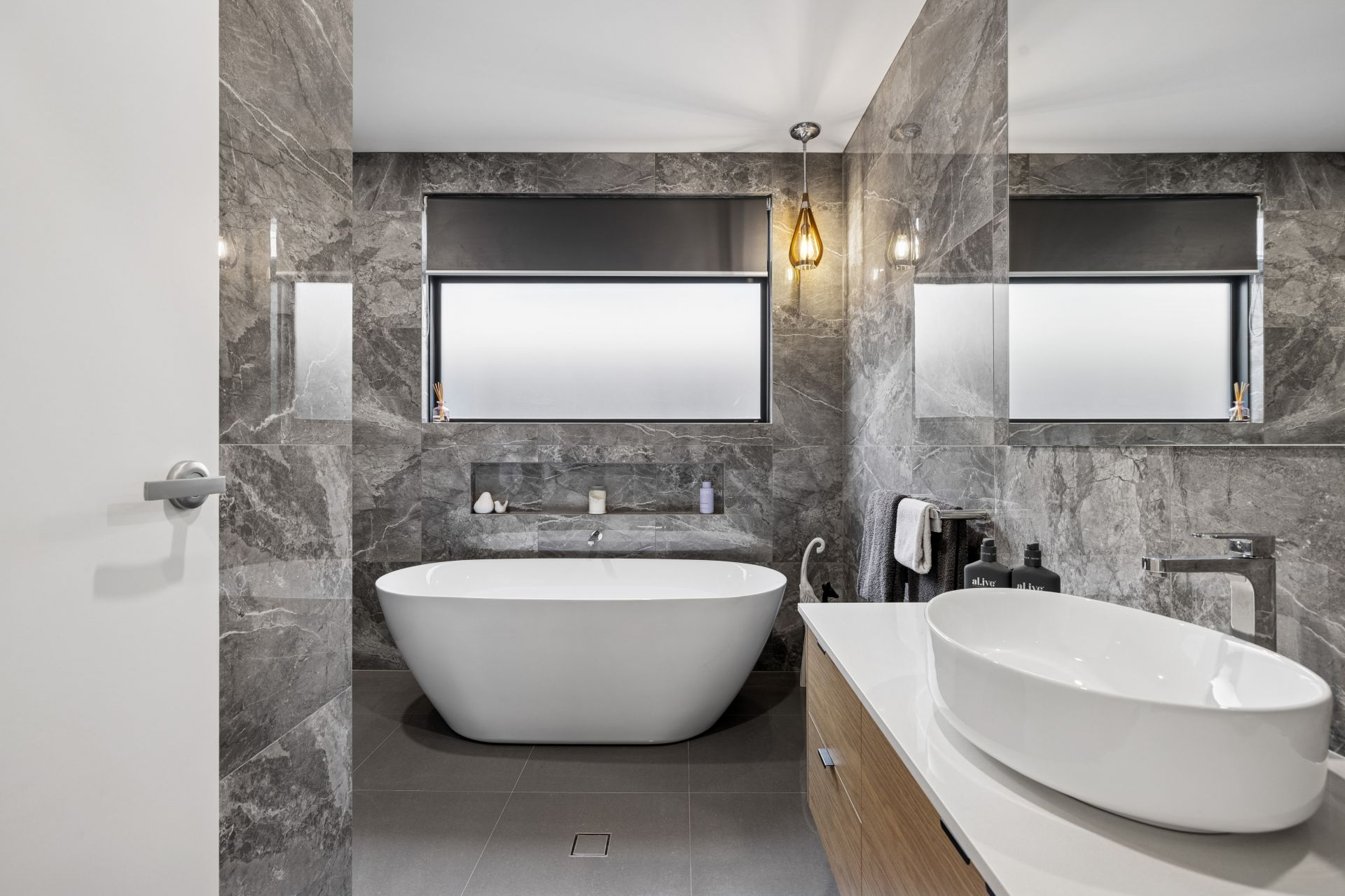 Bedrooms two and three are large, robed, and easy to close off. The main bathroom echoes the ensuite's fully tiled aesthetic delivering a cocoon bath, oversized shower, wall niche and frosted glass, complemented by a separate powder zone with generous bench space and statement lighting.