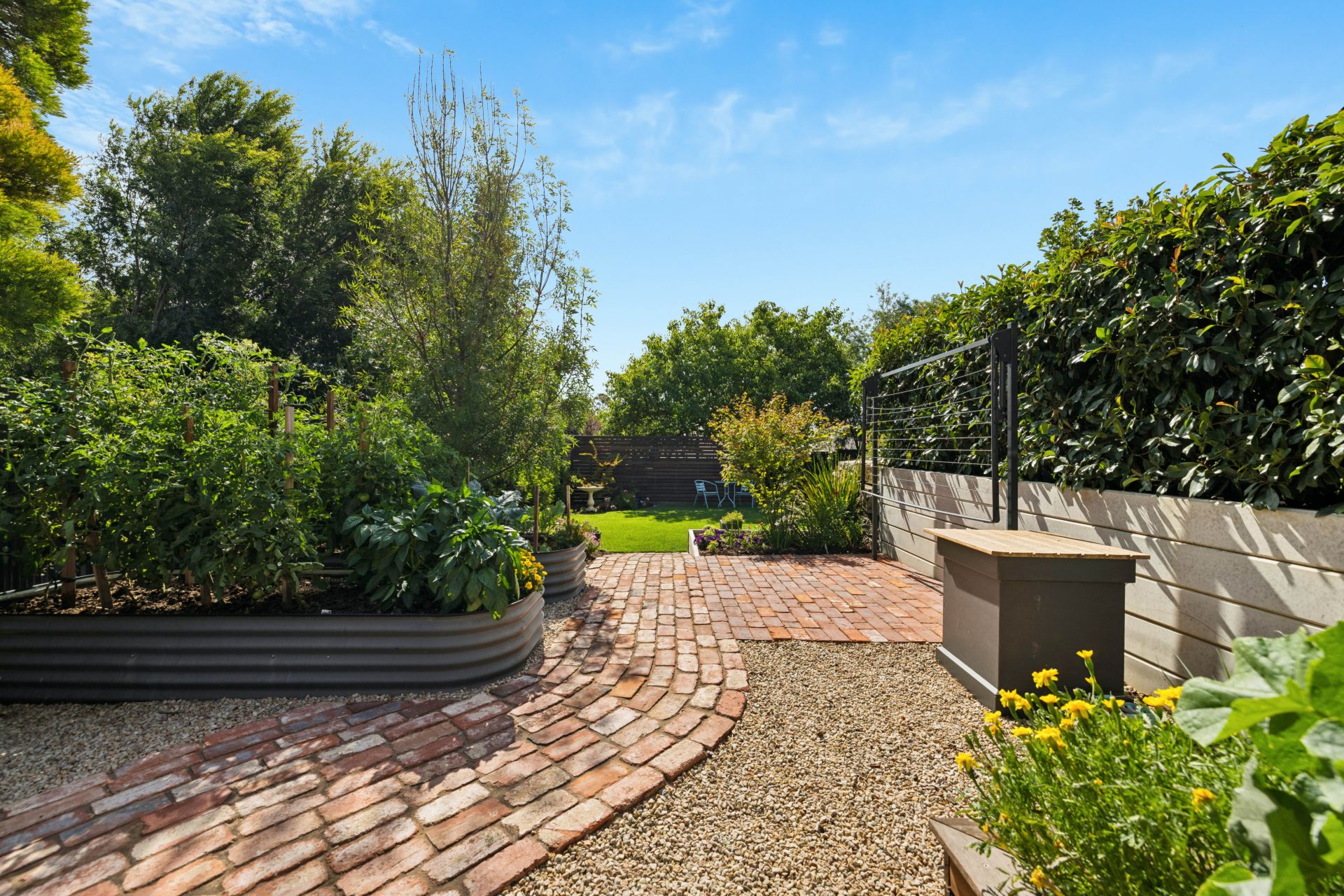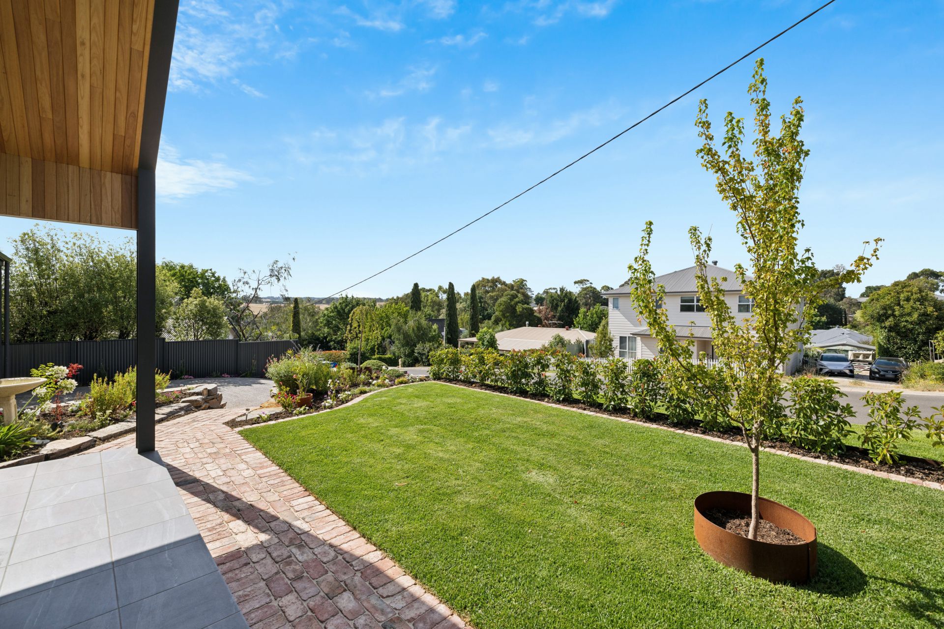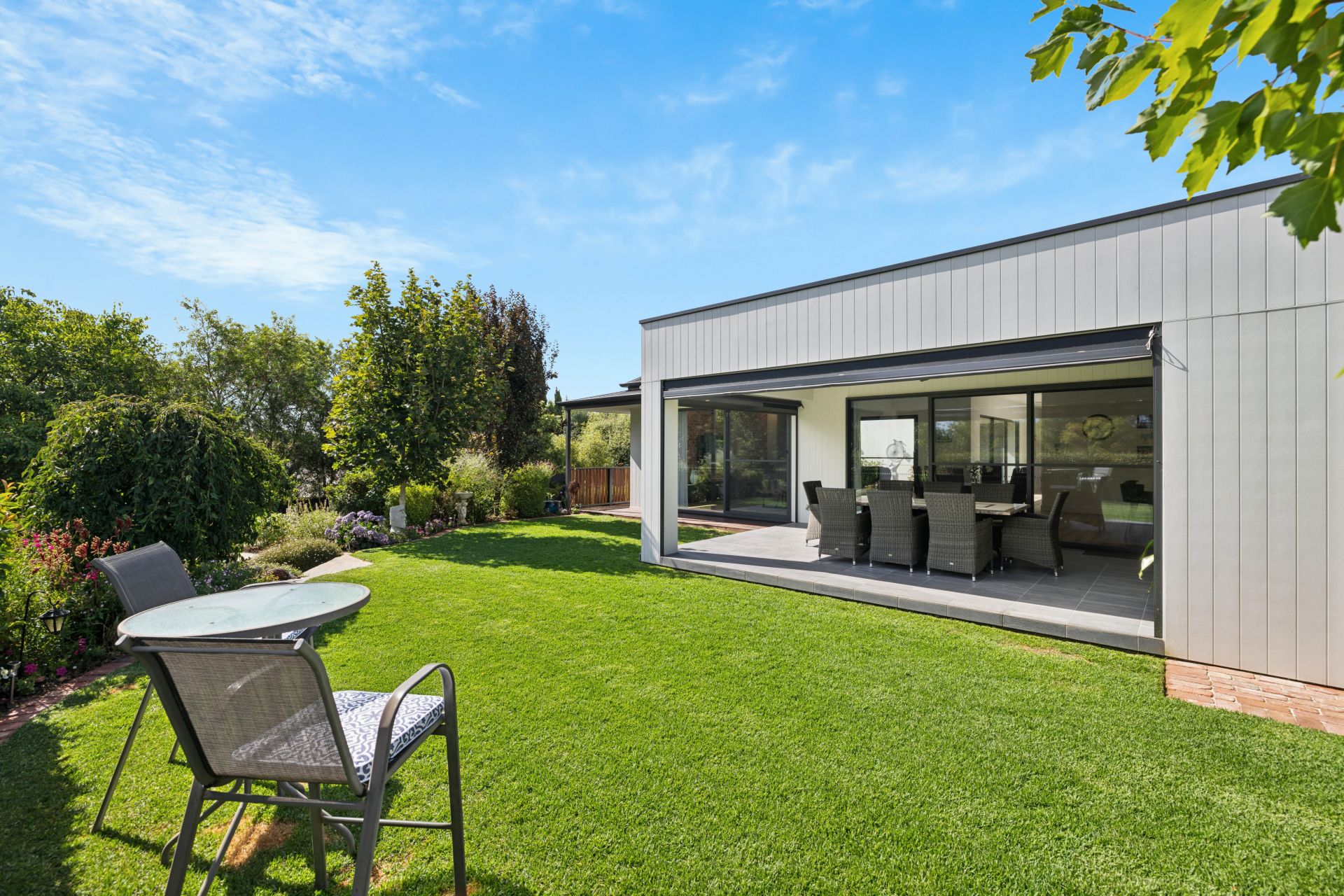Manicured quietly understates the shrubbed, mature surrounds with outdoor zones that tick off multiple sunny seating areas, lush lawn and shade, open skies, rural views, planter beds that invite home-grown produce, even the perfect pitch for kids' cricket.