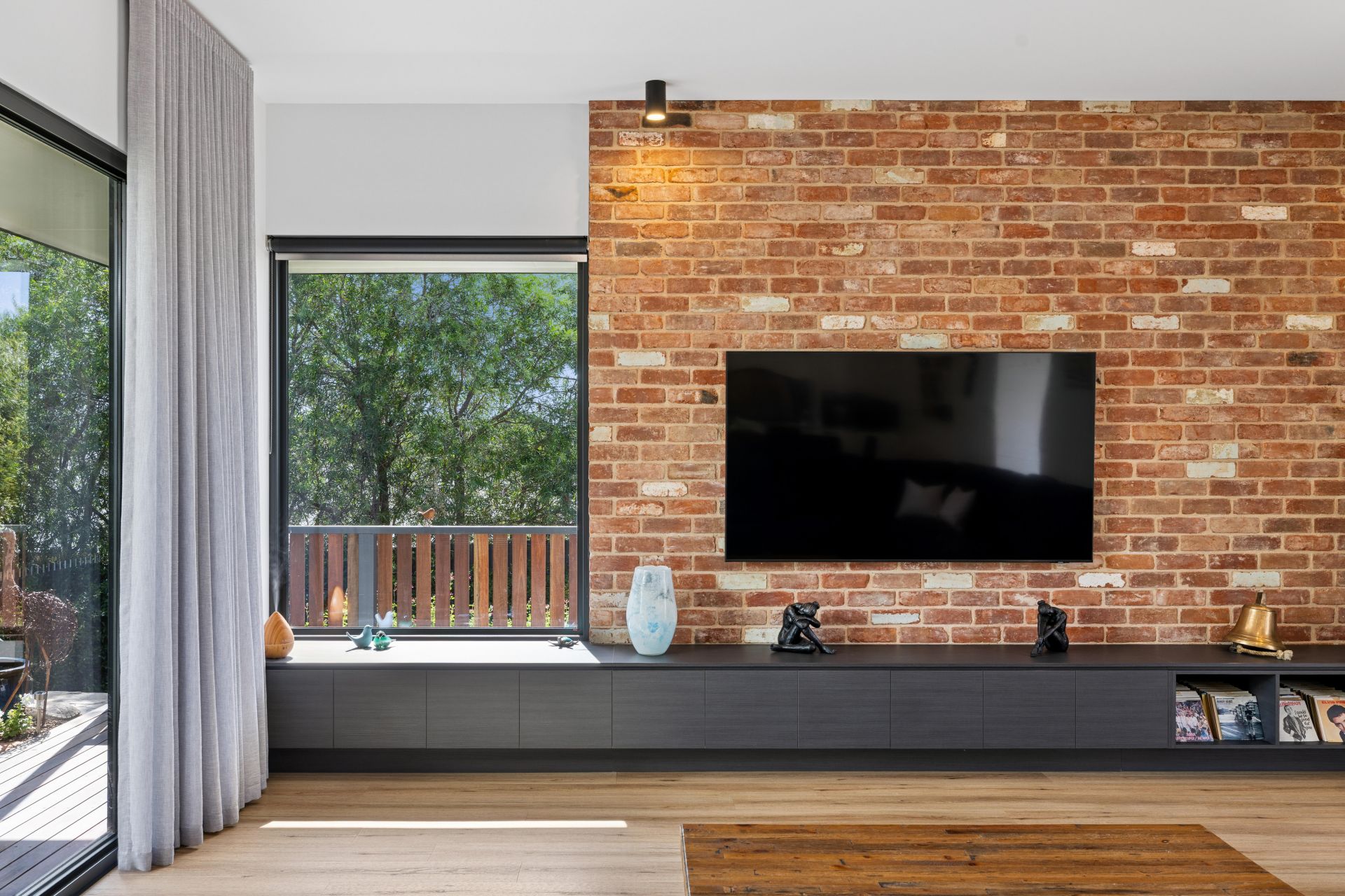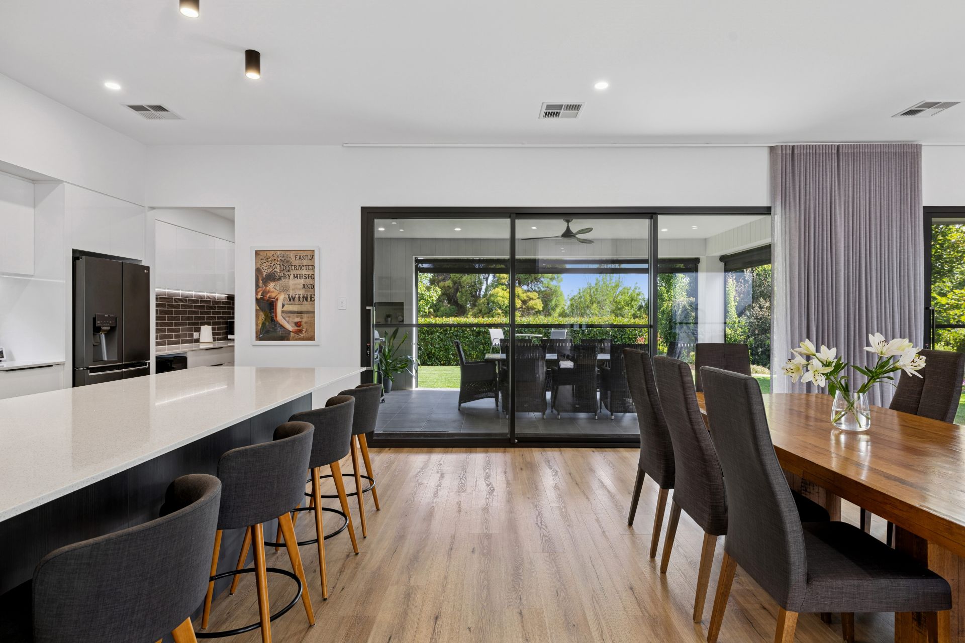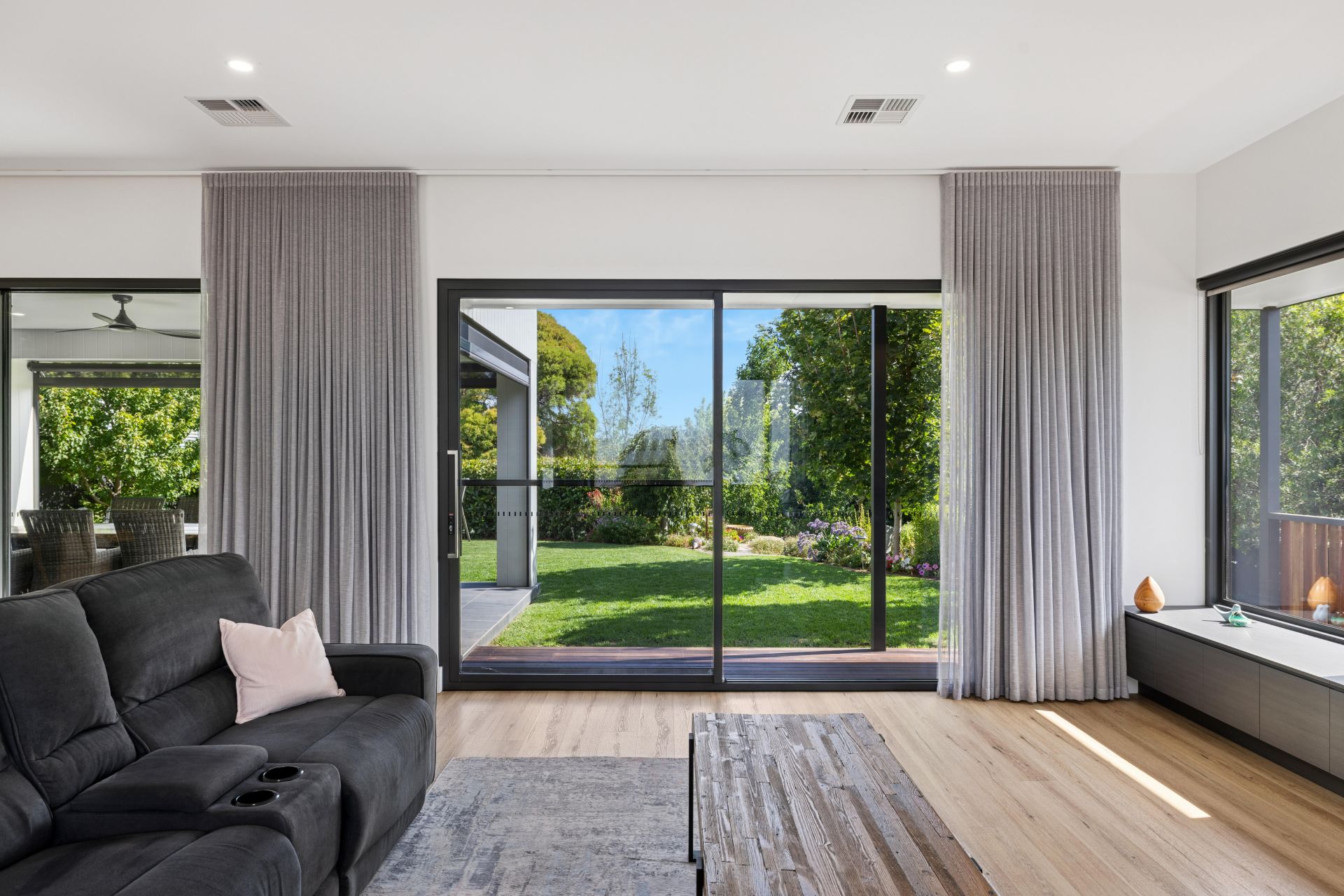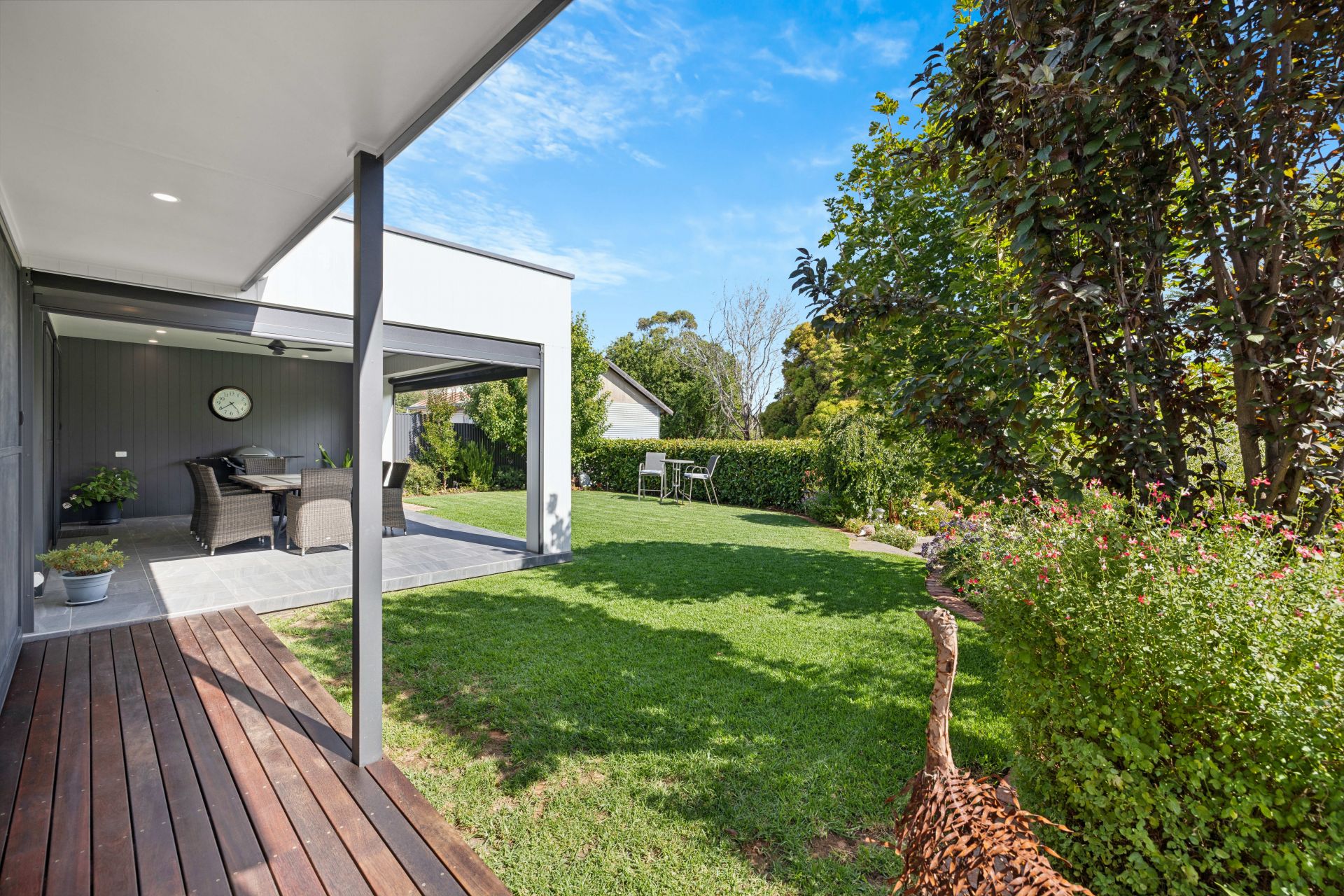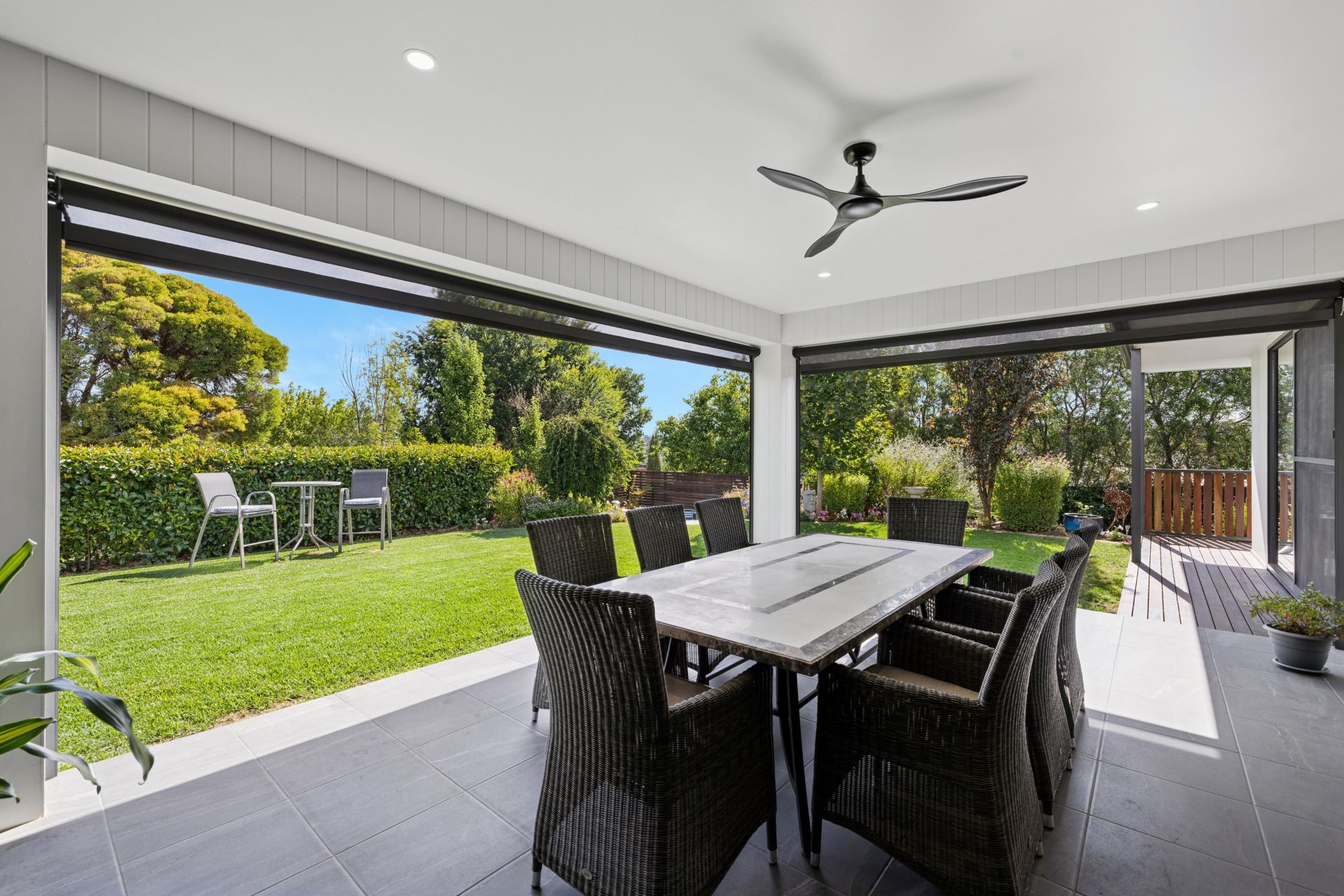 Stacker doors greet the tiled alfresco; electric café blinds greet the garden attraction, while Veejay panels and a freshly oiled deck deem this serene zone BBQ ready.