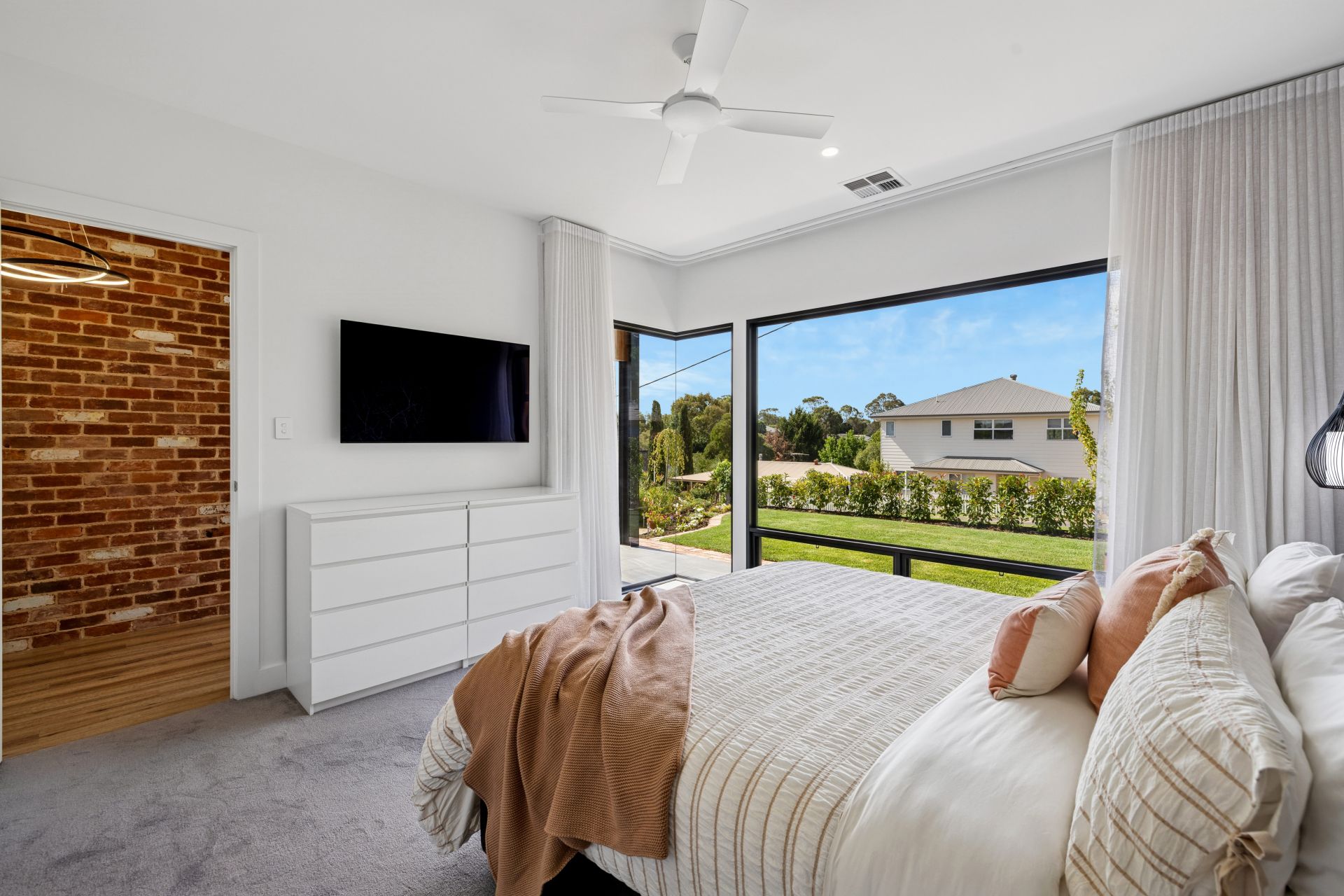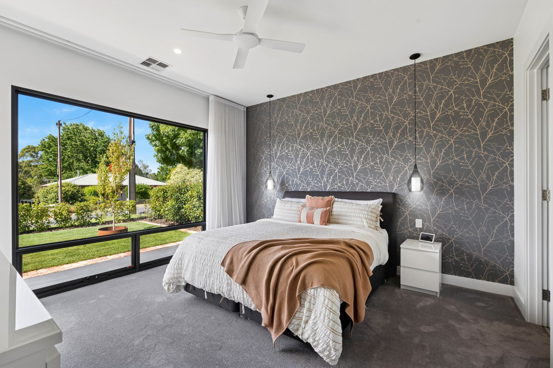 The formal lounge soaks up the outlooks first through an oversized lens of E-glass. A sidestep away, the chic master bedroom is clouded in sheers, layered in wallpaper, mood-lit with pendant lighting, and elevated by the fluid marble effect of the fully tiled ensuite.
