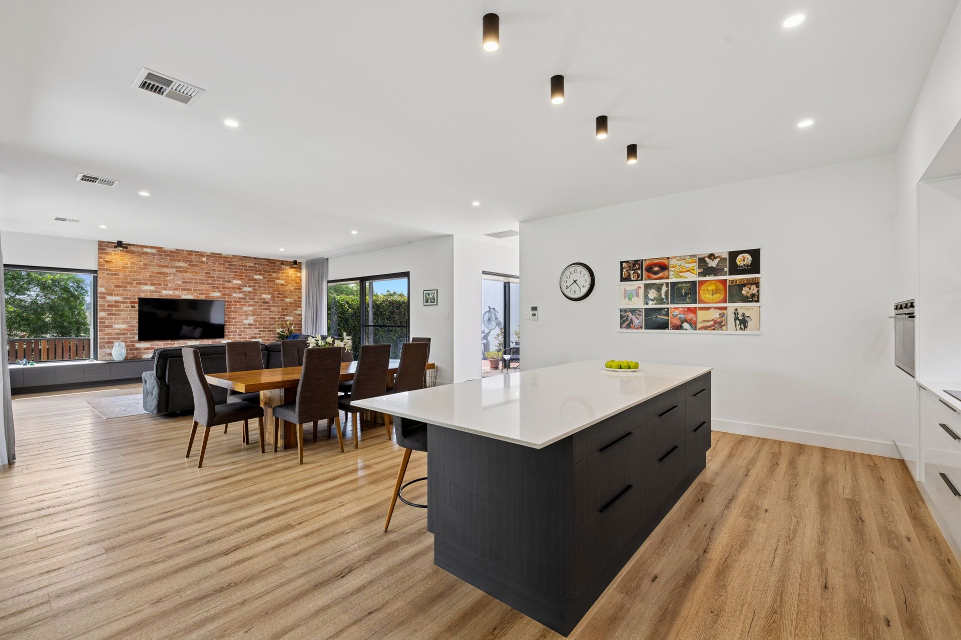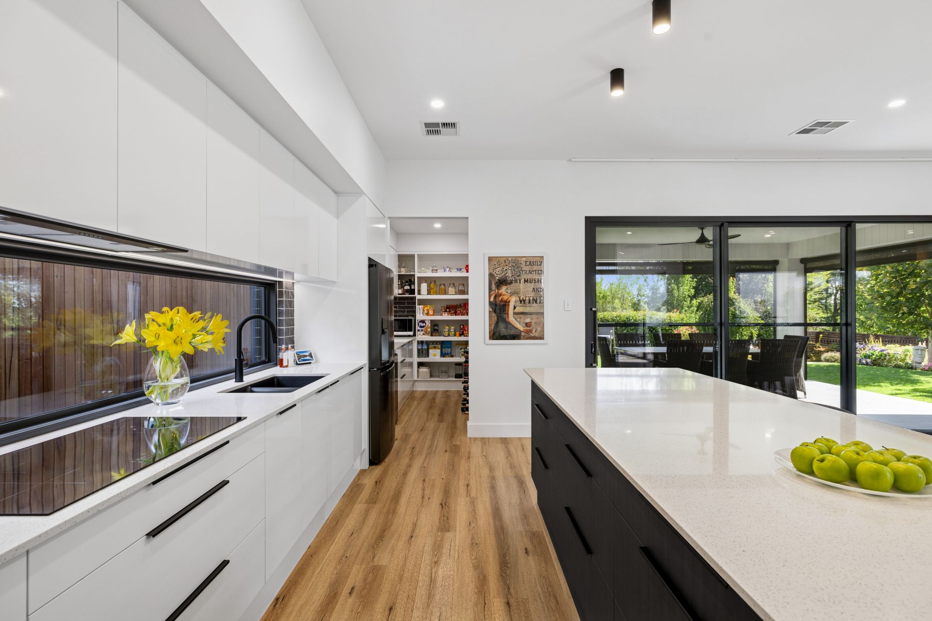 Both minimalist and outstanding, the open plan finale is led by a stone-topped kitchen hosting Westinghouse double ovens, induction cooktop and integrated dishwasher, plus Wi-Fi rangehood control and a well-equipped butler's pantry.